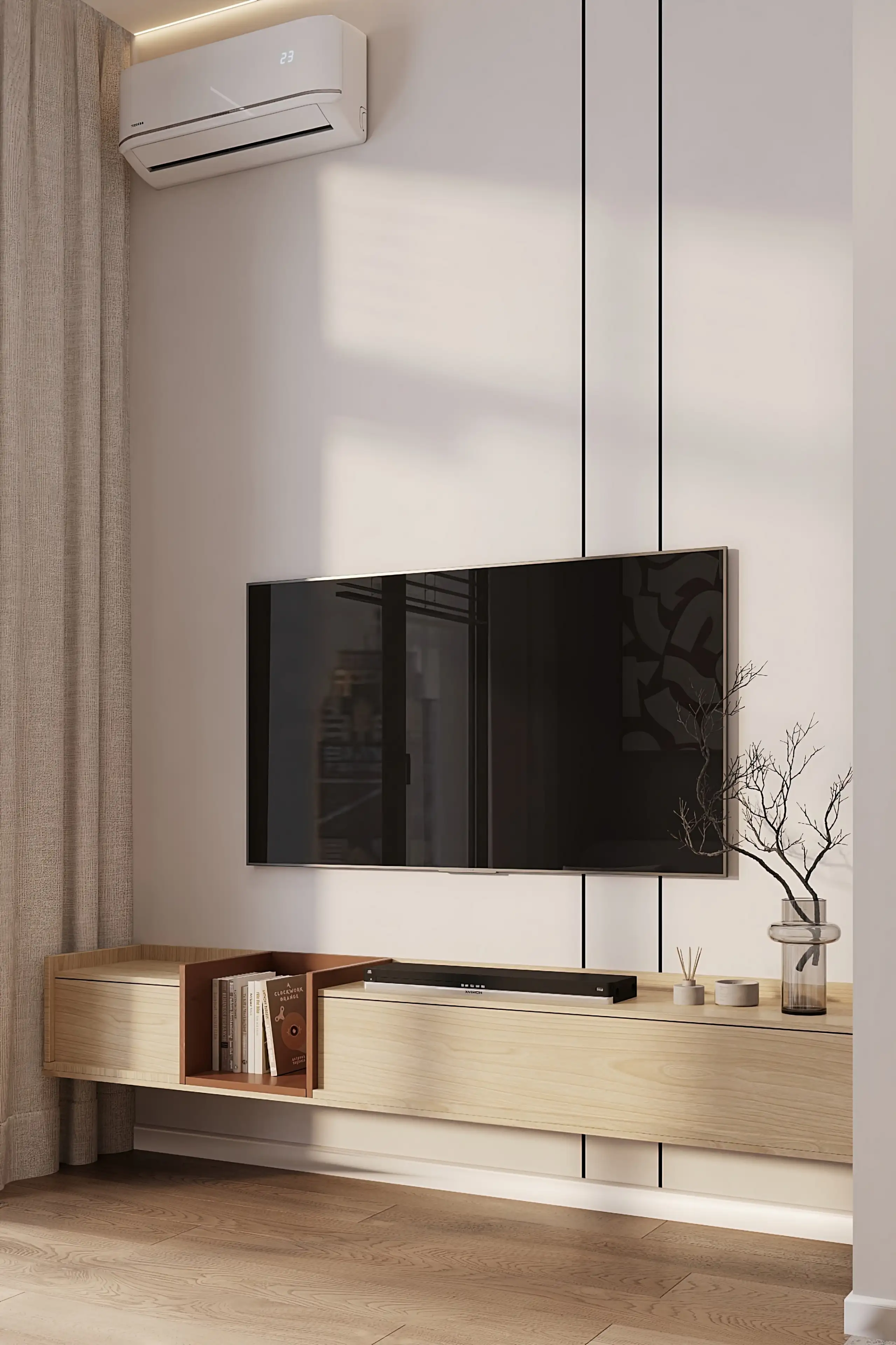 Гостиная естественно продолжает кухонное пространство, составляя с ним единую светлую зону. Подвесная тумба цвета светлого дерева подчёркивает горизонталь и визуально облегчает стену, а небольшой декор на полке добавляет интерьеру домашнее тепло.