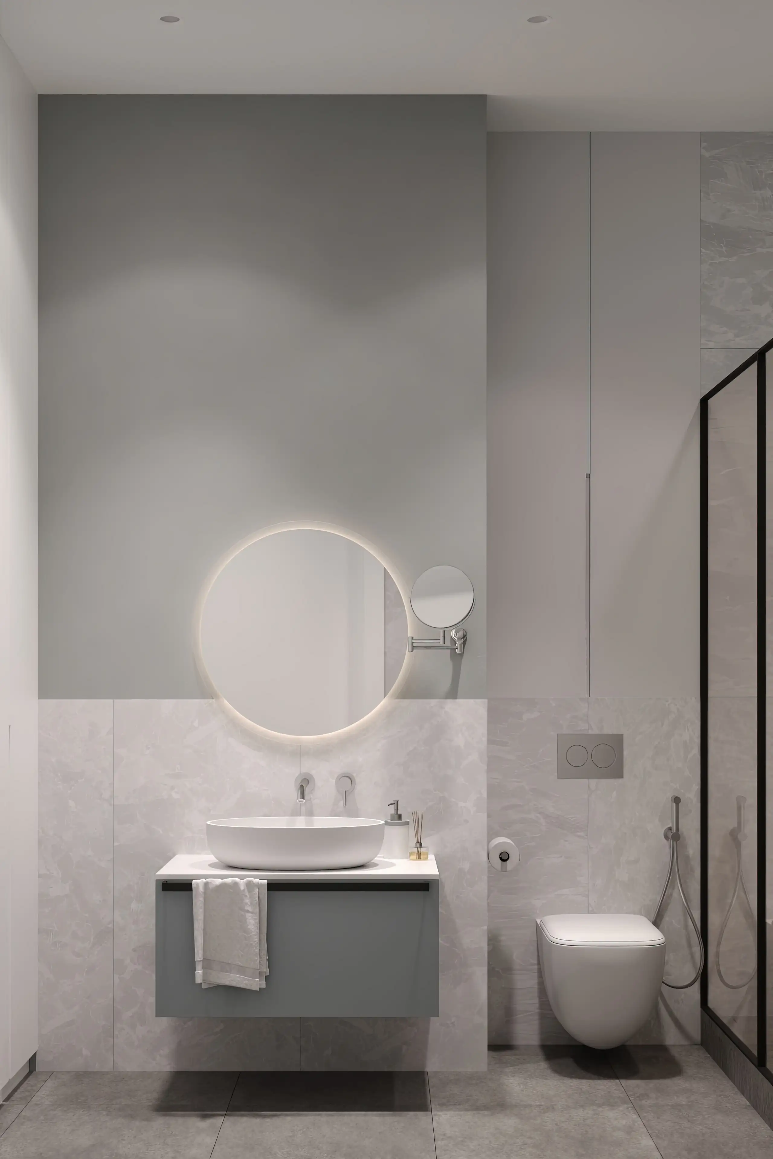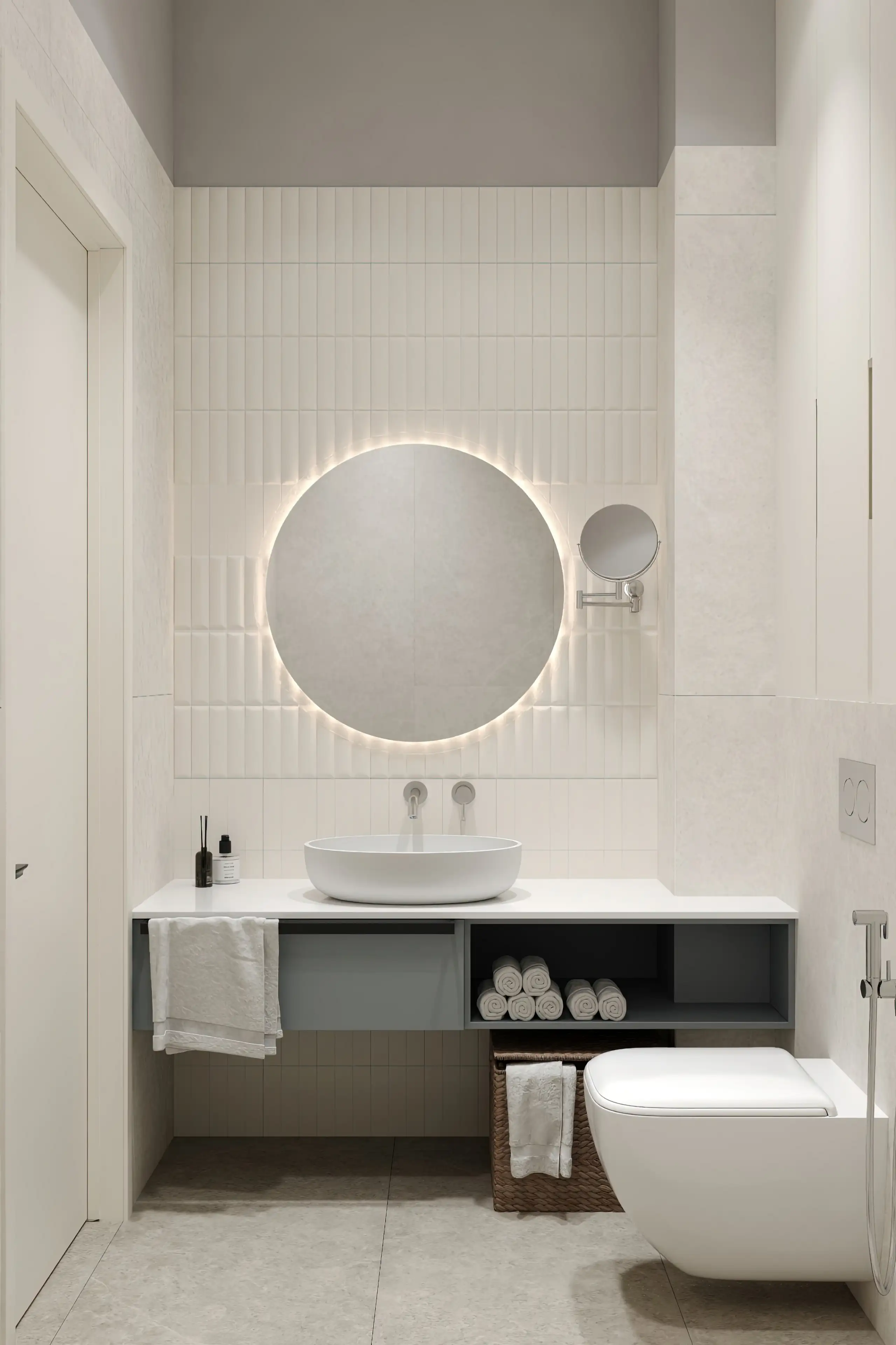Мастер-санузел выполнен в белой и светло-серой холодной гамме. Круглое зеркало с подсветкой даёт достаточно света для уходовых процедур и смягчает строгую геометричность линий. Вертикальная белоснежная плитка на стене за раковиной добавляет помещению кристально-чистое сияние.