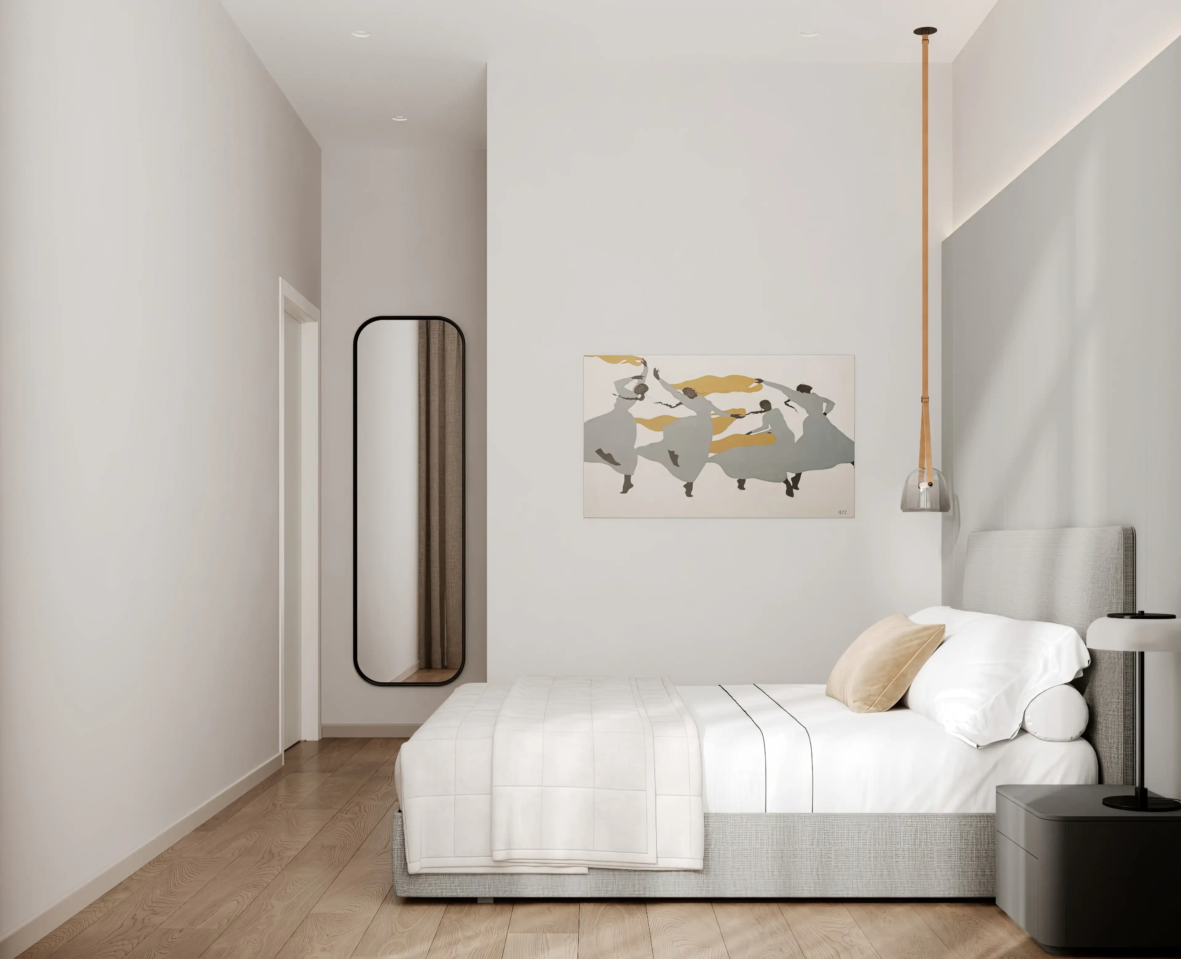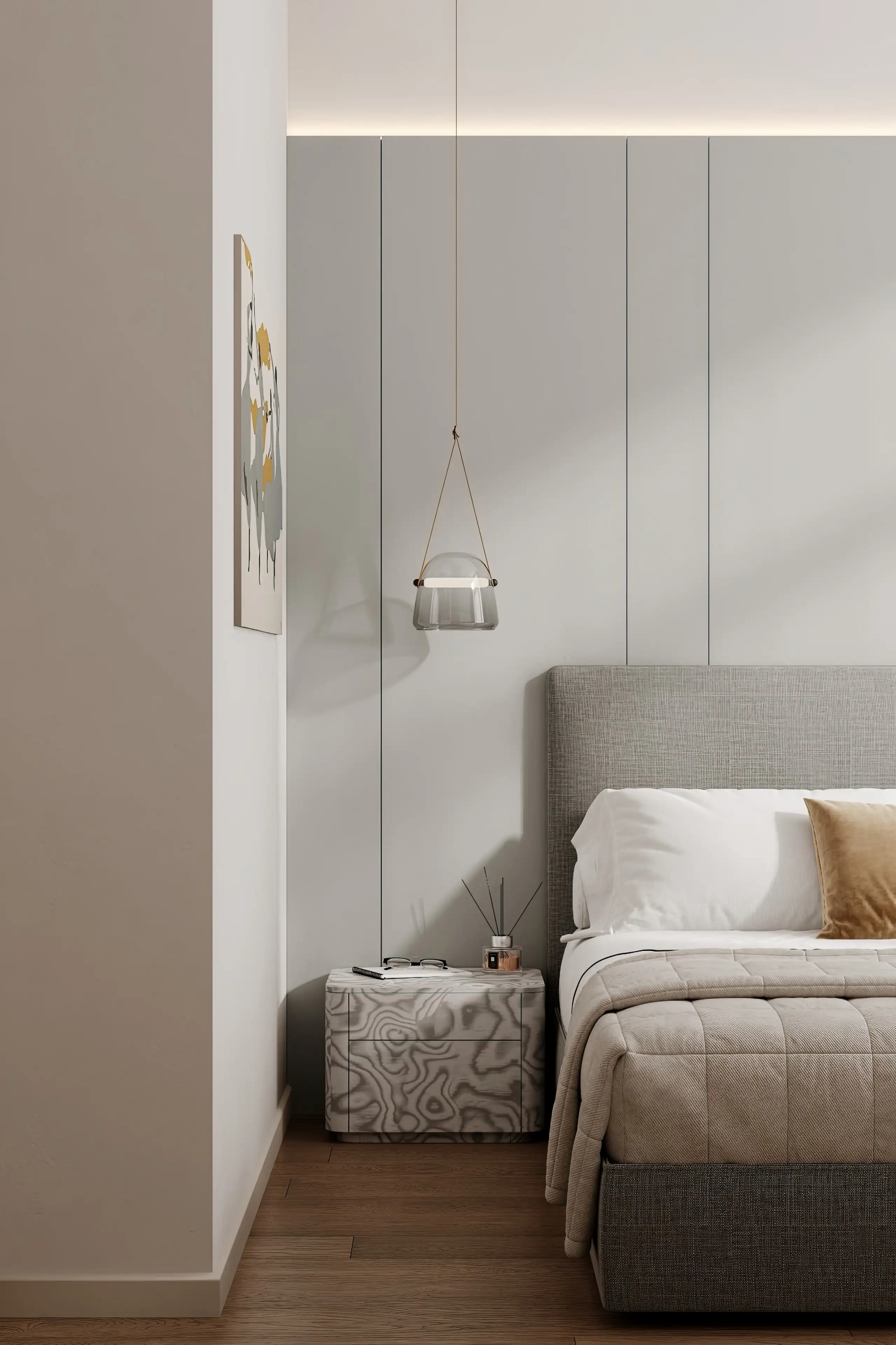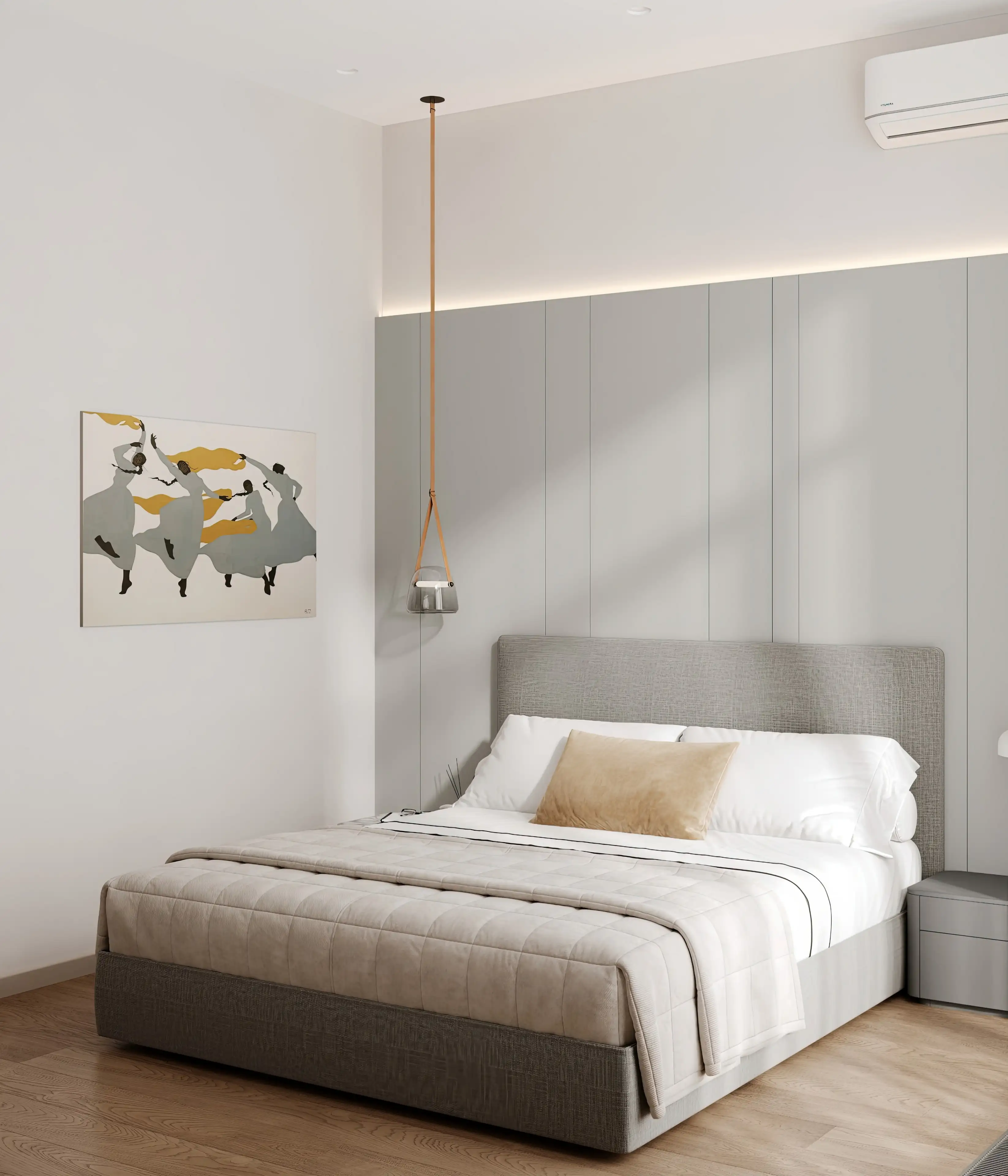 Спальня выдержана в гармоничной молочно-серой палитре. Мягкое изголовье кровати, выделенное светло-серой акцентной панелью по стене, визуально структурирует пространство и создаёт ощущение защищённости.