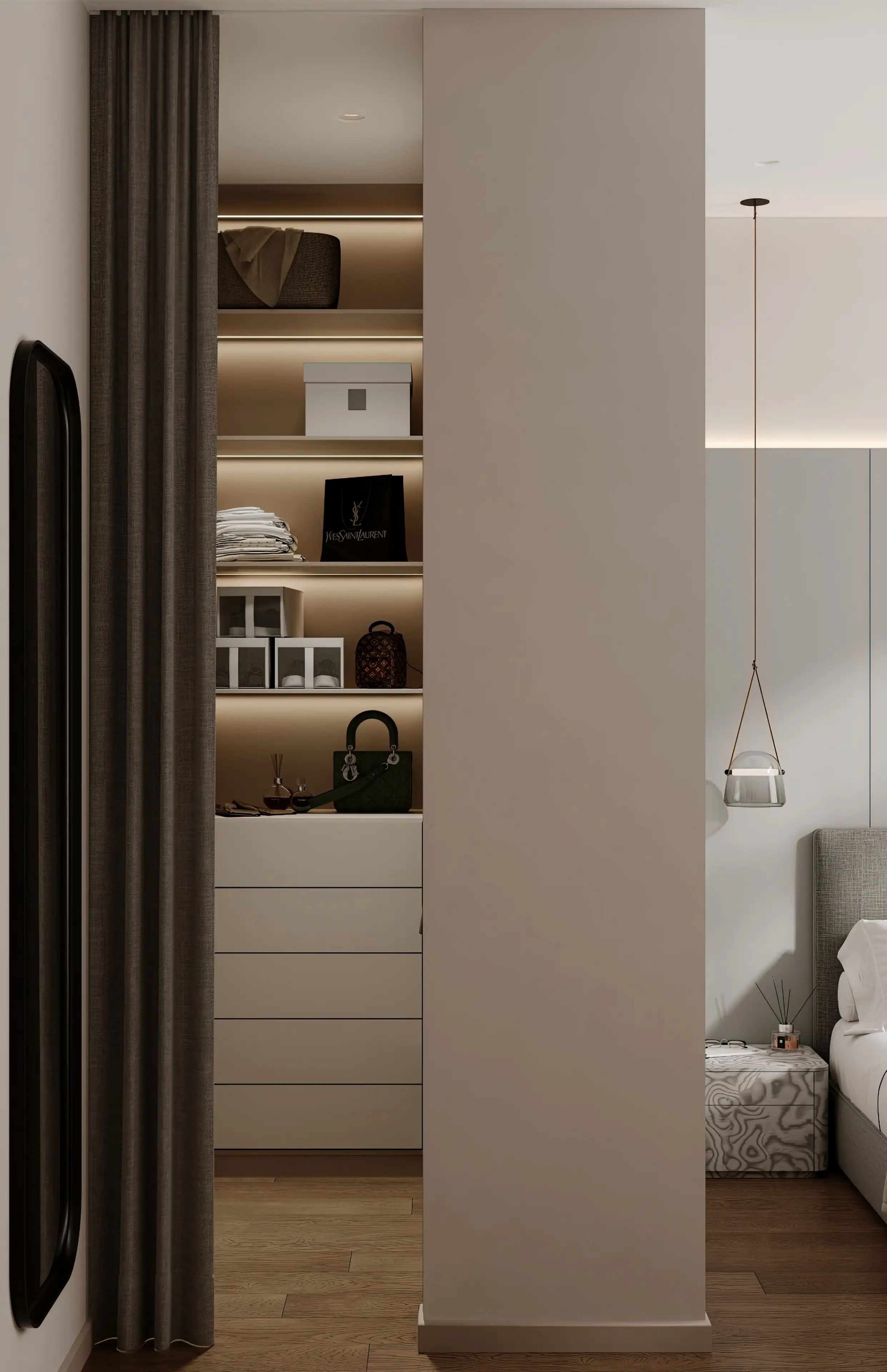 Гардеробную мы скрыли за шторой, чтобы не загромождать помещение и сохранить общую минималистичную концепцию. Всё необходимое всегда рядом, но при этом в спальне царит идеальный порядок.
