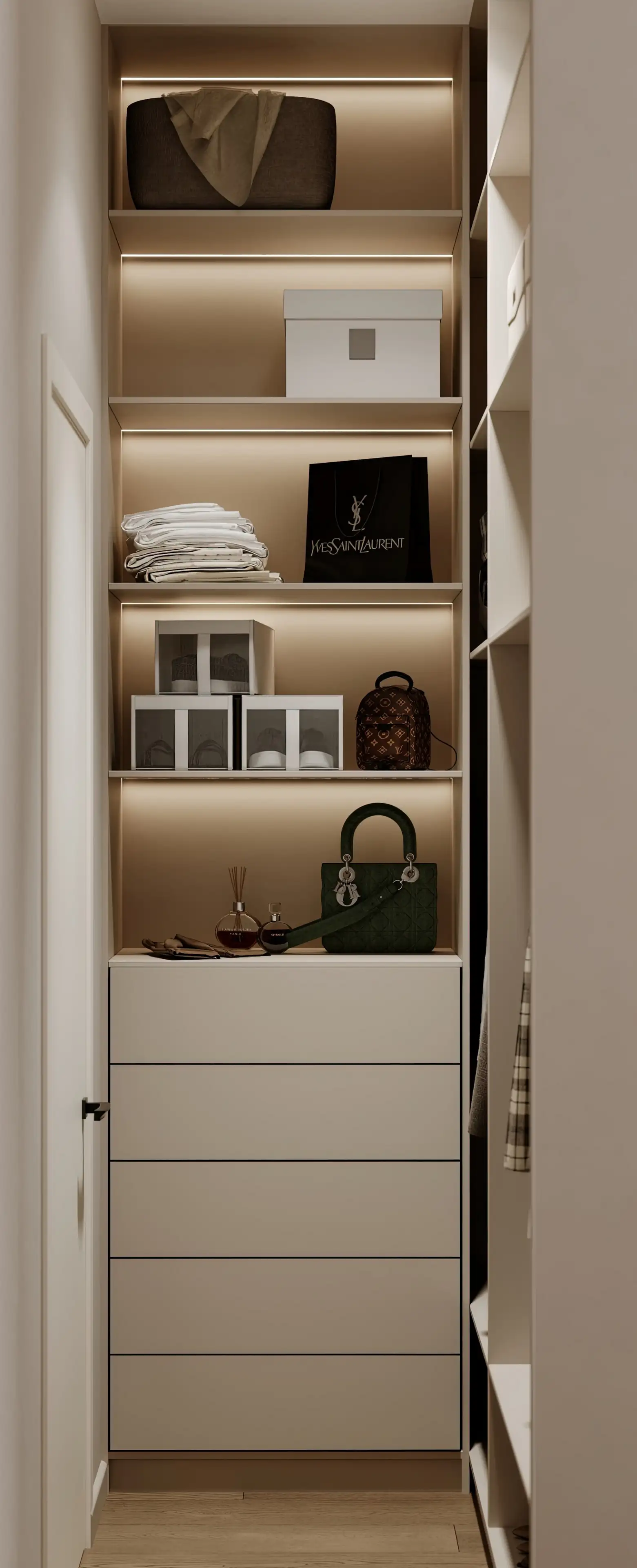 Гардеробная получилась очень функциональной. Светодиодная подсветка установлена по всей длине полок. Всё их содержимое идеально видно, поэтому утренние сборы на работу будут происходить в разы быстрее.