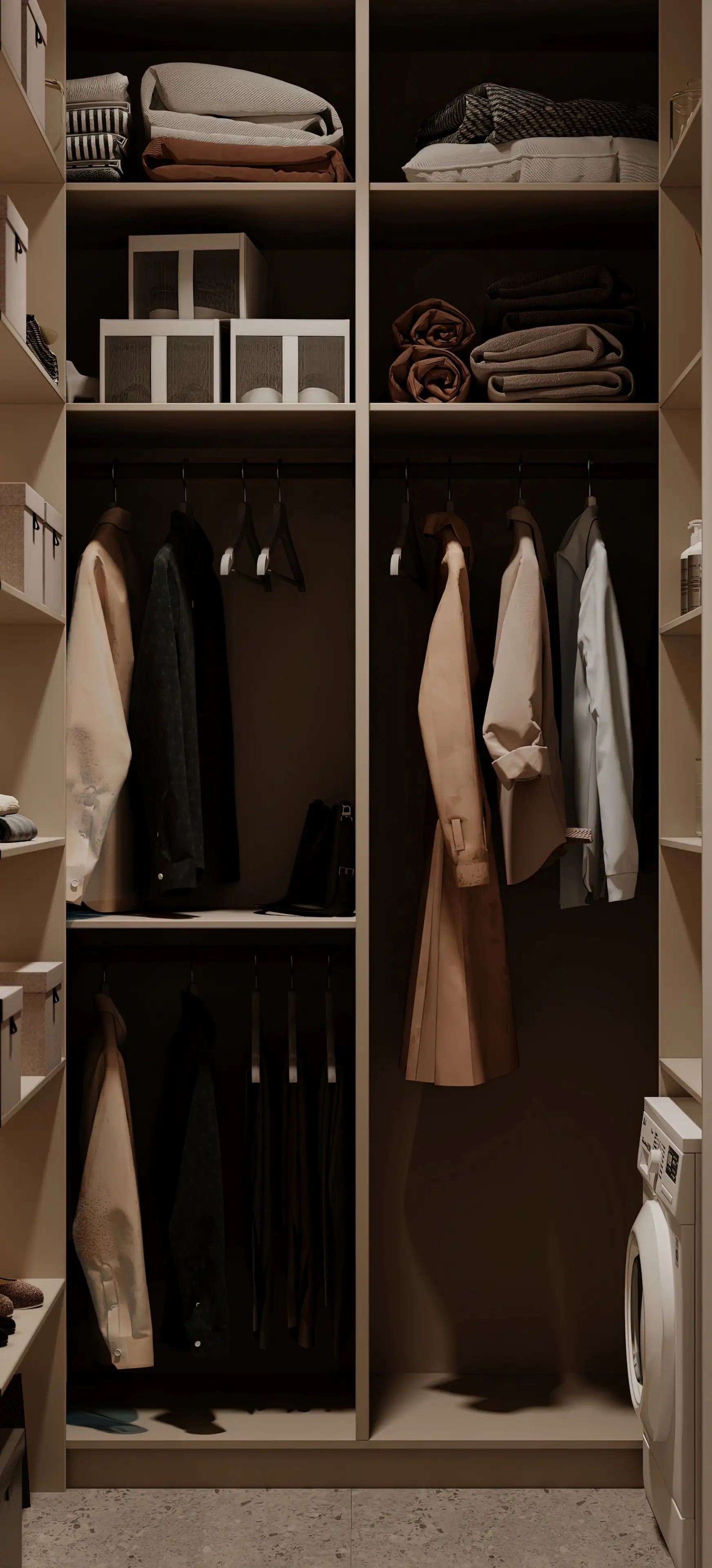 Гардеробная, совмещённая с постирочной, помимо шкафов и полок для одежды дополнена вместительными встроенными полками, на которых удобно хранить белье, бытовую химию и хозяйственные принадлежности. Цвета этого помещения — бежевый и светлое дерево.