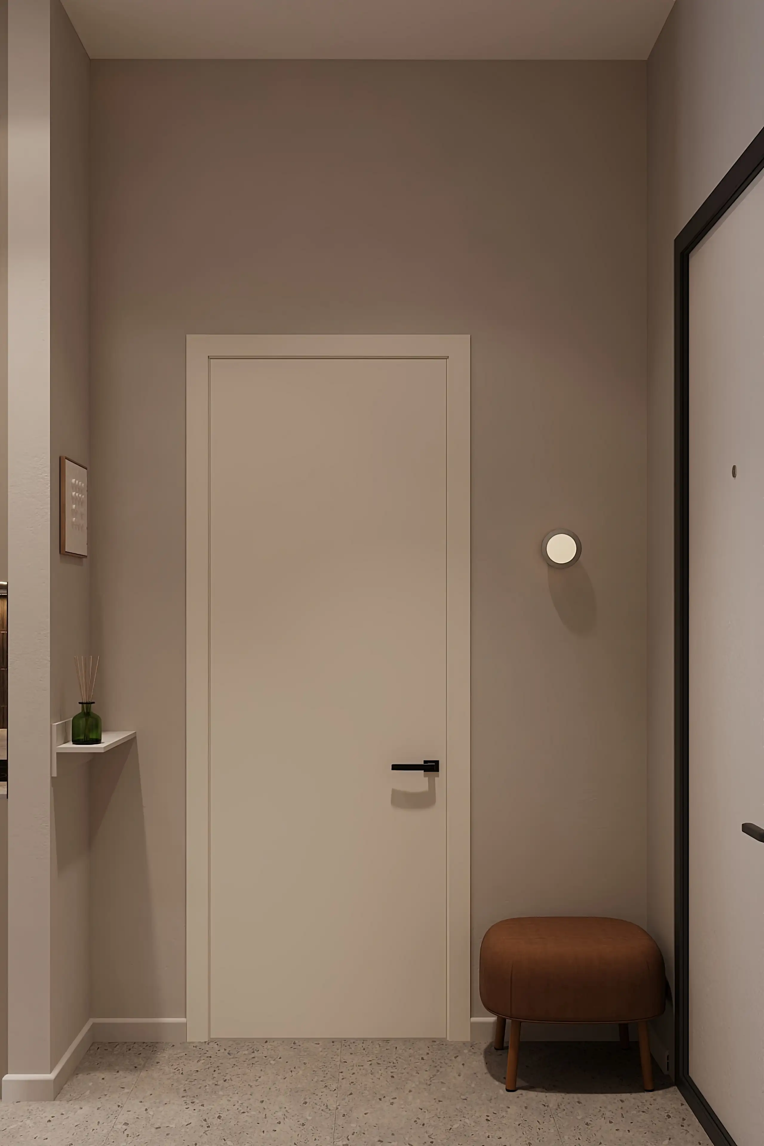 Молочная дверь мягко сливается со стеной цвета крем-брюле, не нарушая общую гармонию. Освещение здесь также точечное — света достаточно, а интерьер не перегружен лишними конструкциями.
