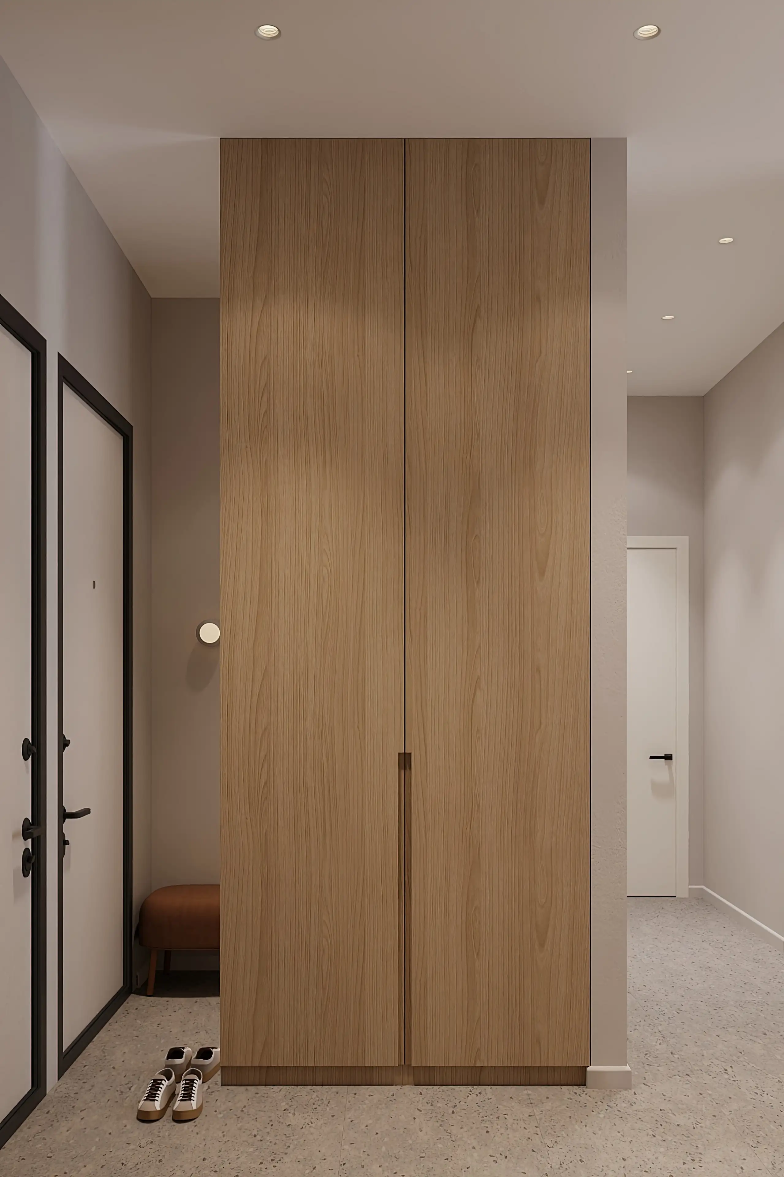 Интерьер прихожей лаконичный, при его создании мы вдохновлялись японской эстетикой: минимум деталей — максимум смысла. Украшением и одновременно ярким акцентом в прихожей служит терракотовый пуфик для переобувания.