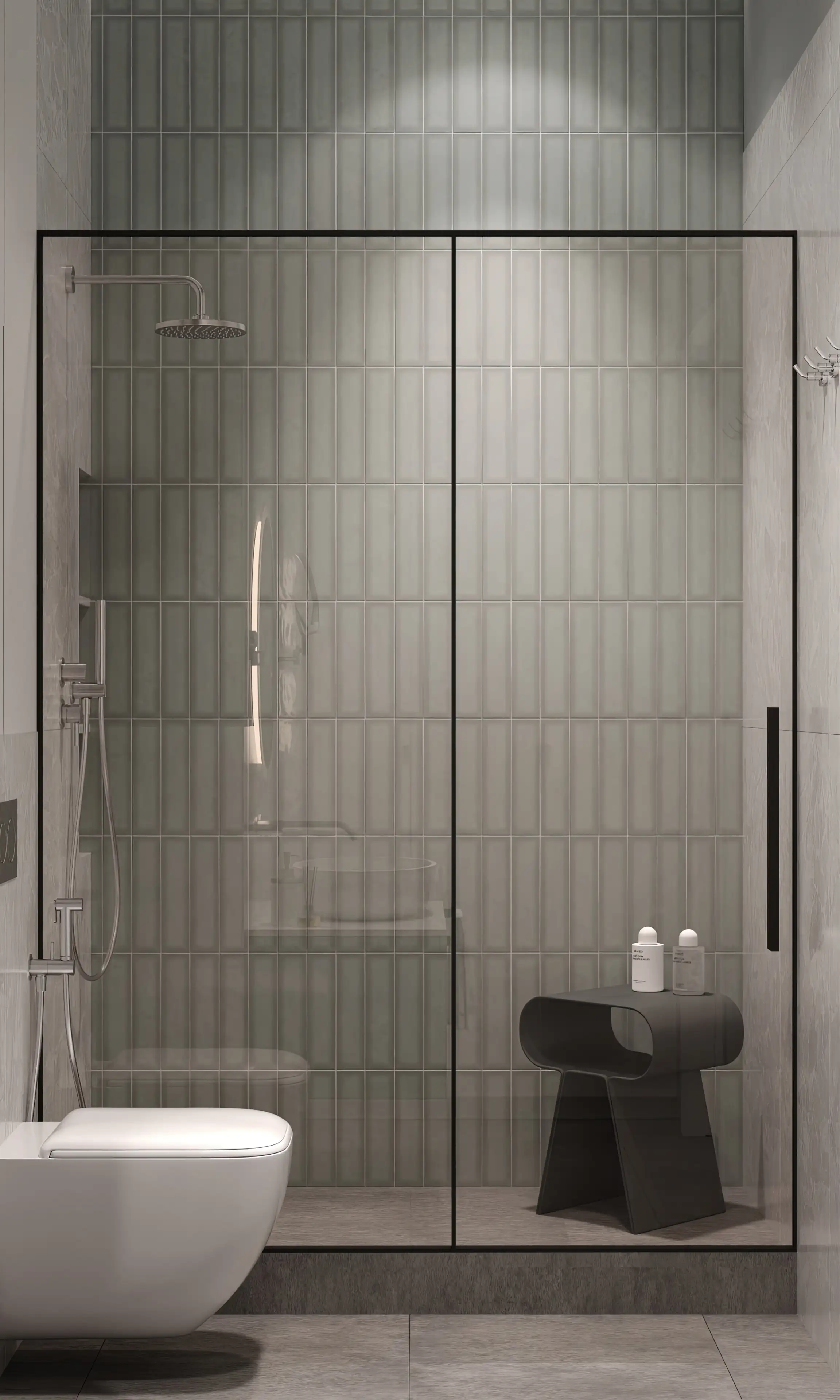 Стены в душевой зоне выделены мелкой вертикальной плиткой мятно-серого цвета с рельефом, что делает интерьер более динамичным. Душевую мы оградили прозрачными перегородками: стекло не скрадывает пространство, а контрастные профили добавляют интерьеру графичность.