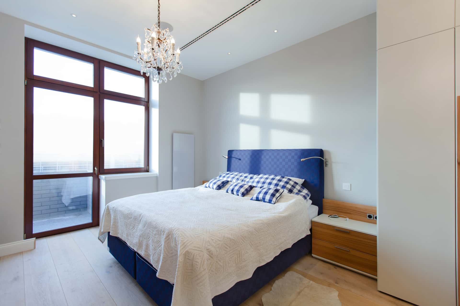 Минималистическая спальня представляет собой идеальное место для сна. Мягкая клетчатая кровать цвета индиго, две тумбы и вместительный шкаф – вот и вся мебель, которая была размещена в этой комнате. Белые стены и огромное балконное окно делают помещение максимально светлым, жизнерадостным и комфортным.