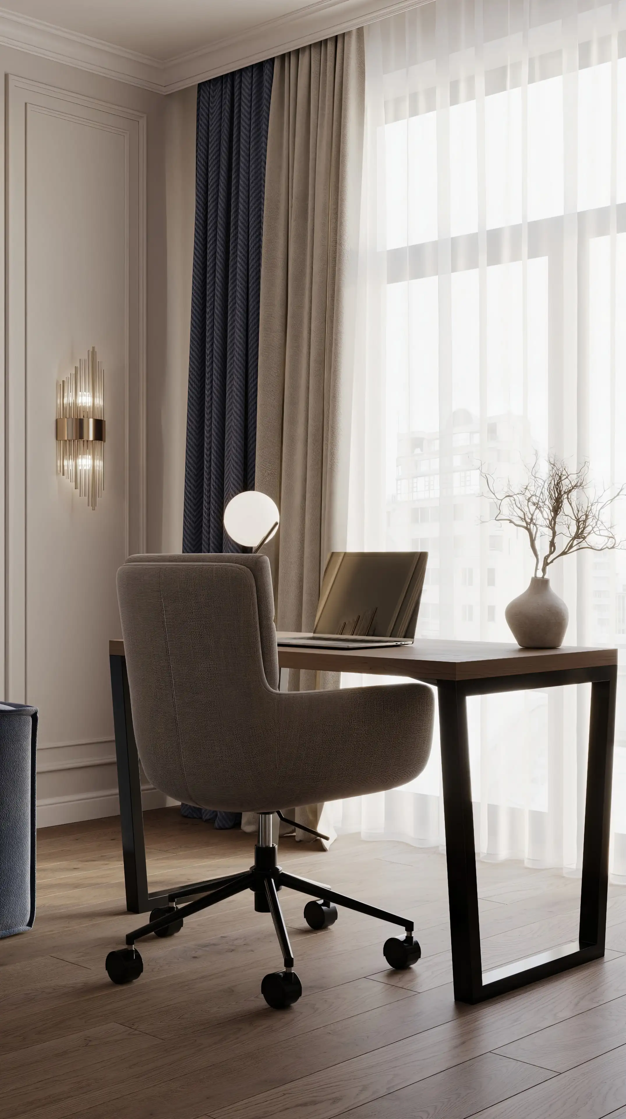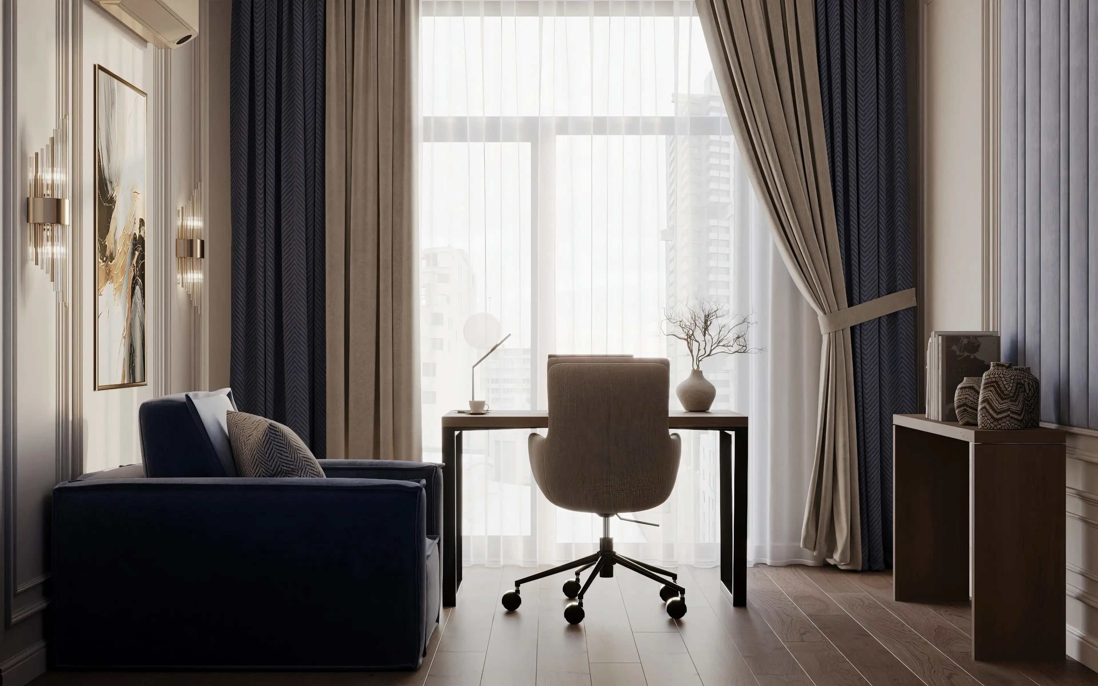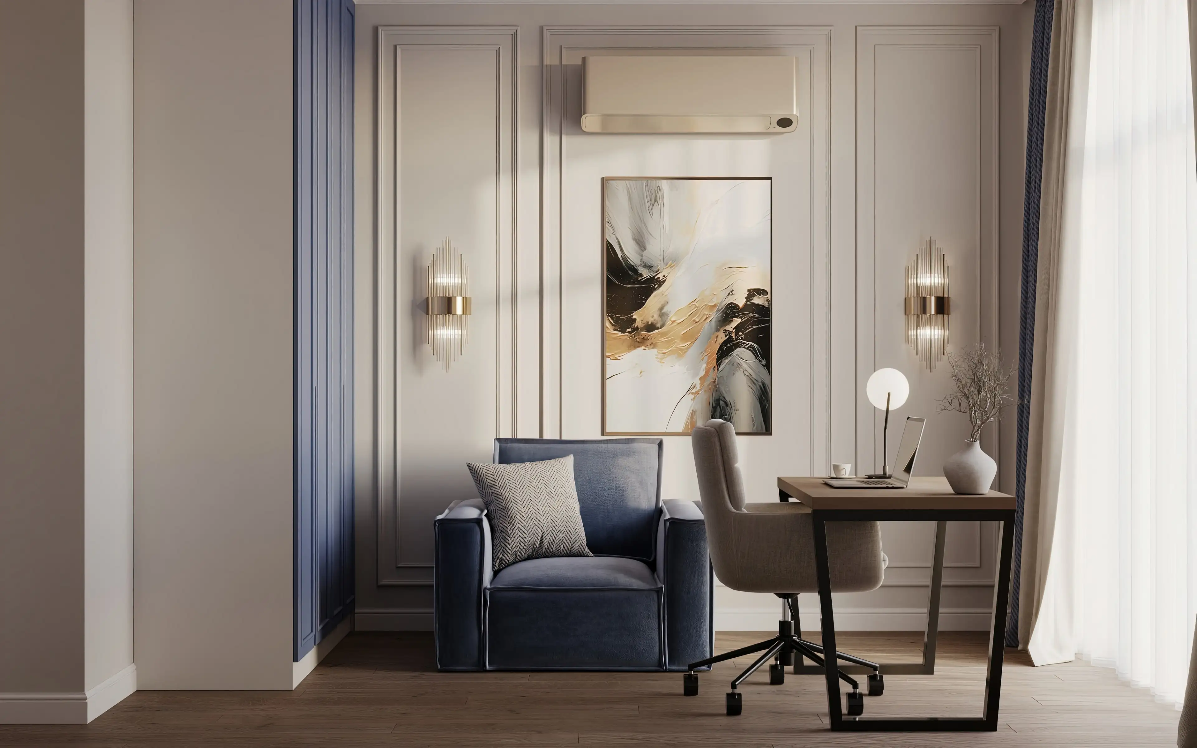 Золотистые бра с изящными линиями подчеркивают элёгантность интерьера, добавляя ему глубину и уют. Светильник на рабочем столе – более лаконичный, настраивающий на рабочий лад.