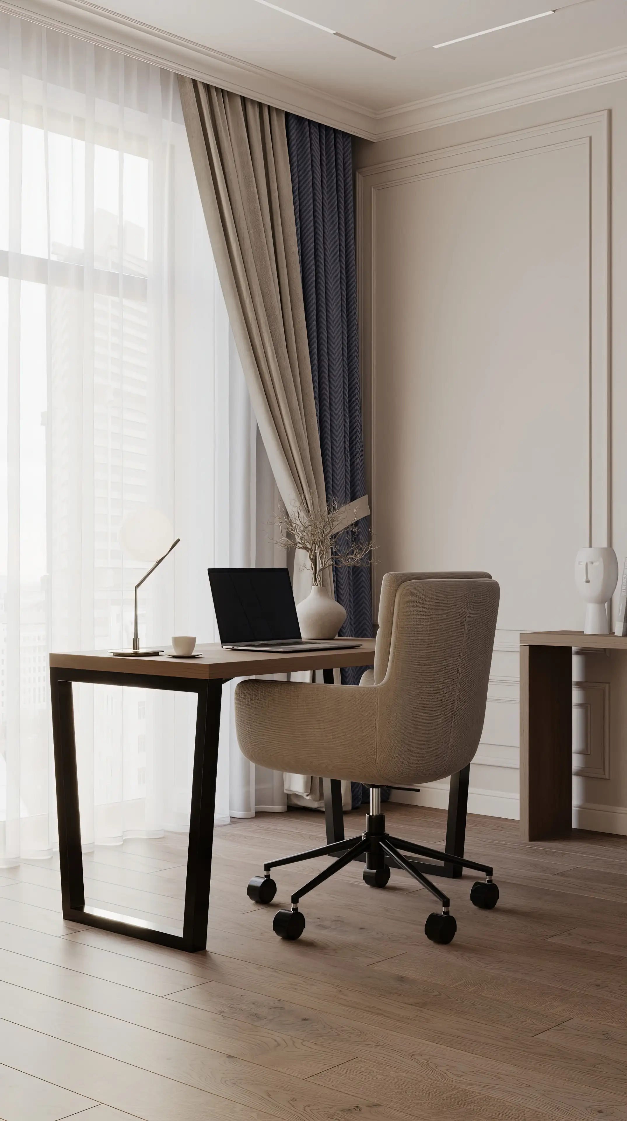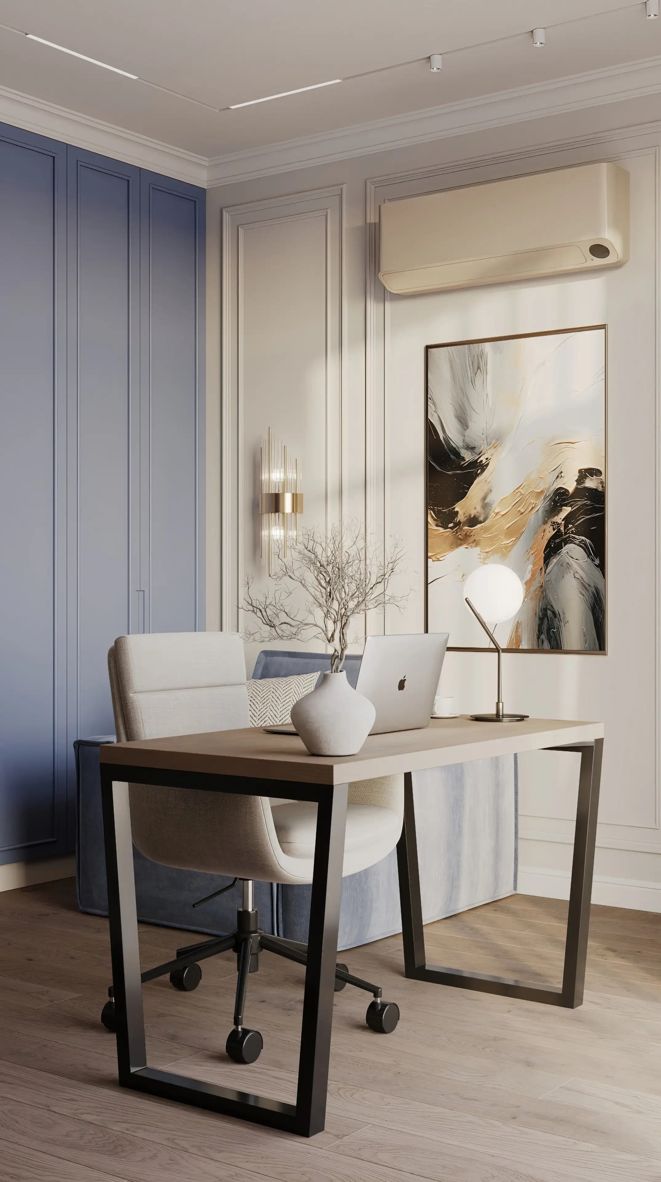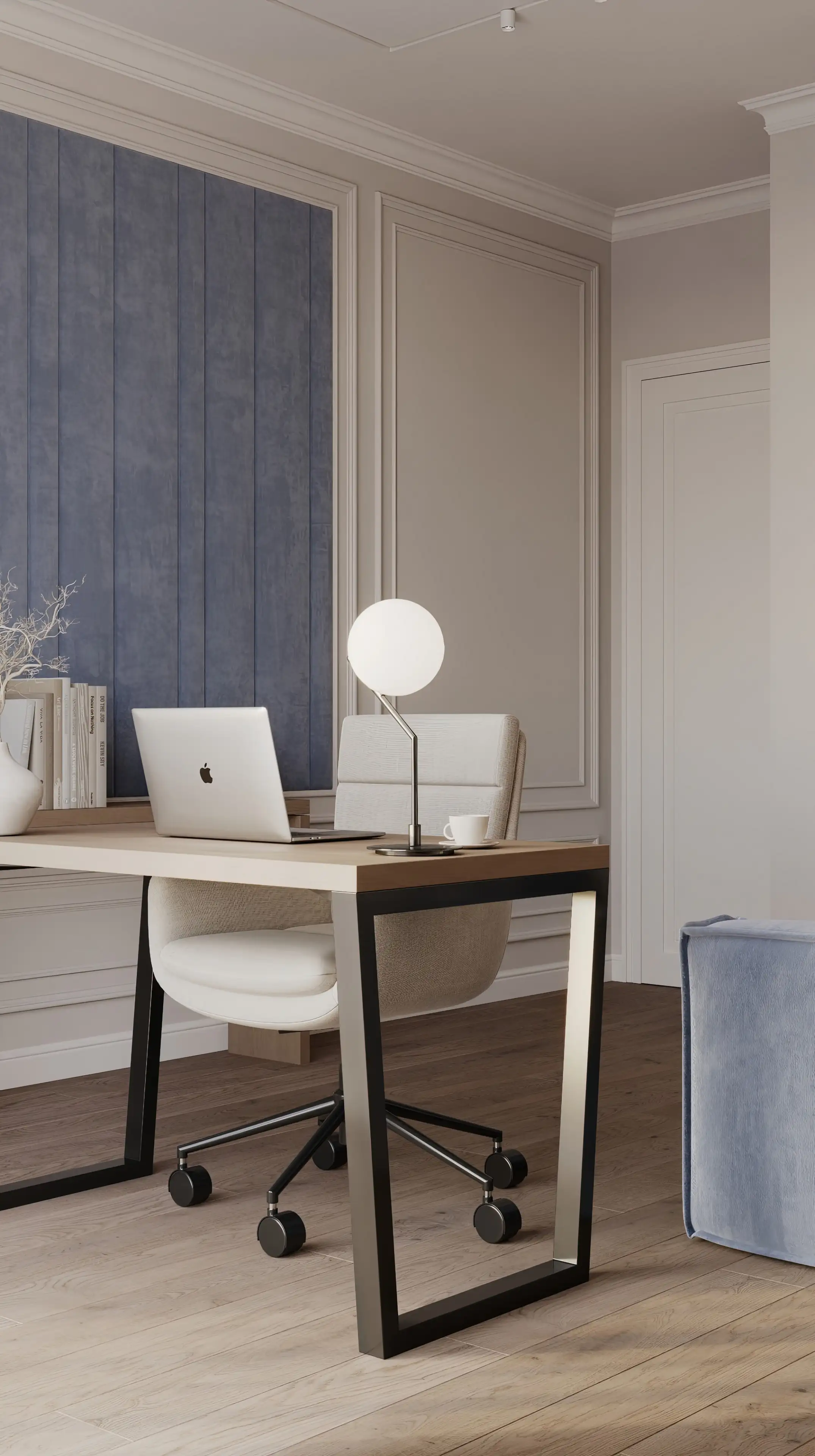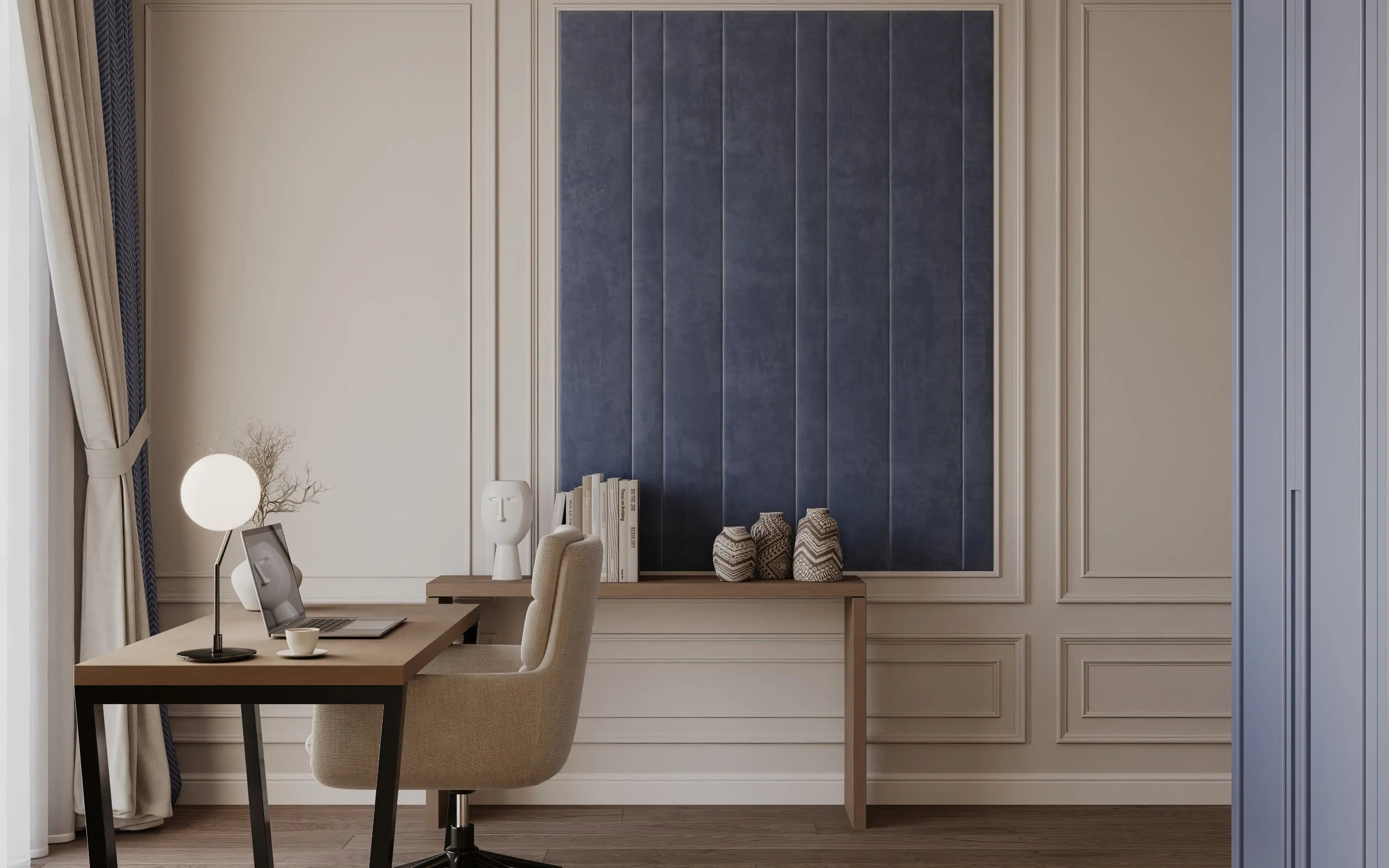 Инженерная доска на полу кабинета и лаконичные молдинги задают элегантную базу. Светло-бежевую гамму нарушают сочные акценты – приглушённо-синее кресло, дверцы шкафа и декоративная панель на стене. Интерьер выглядит стильно, но не пафосно, работать здесь одно удовольствие.