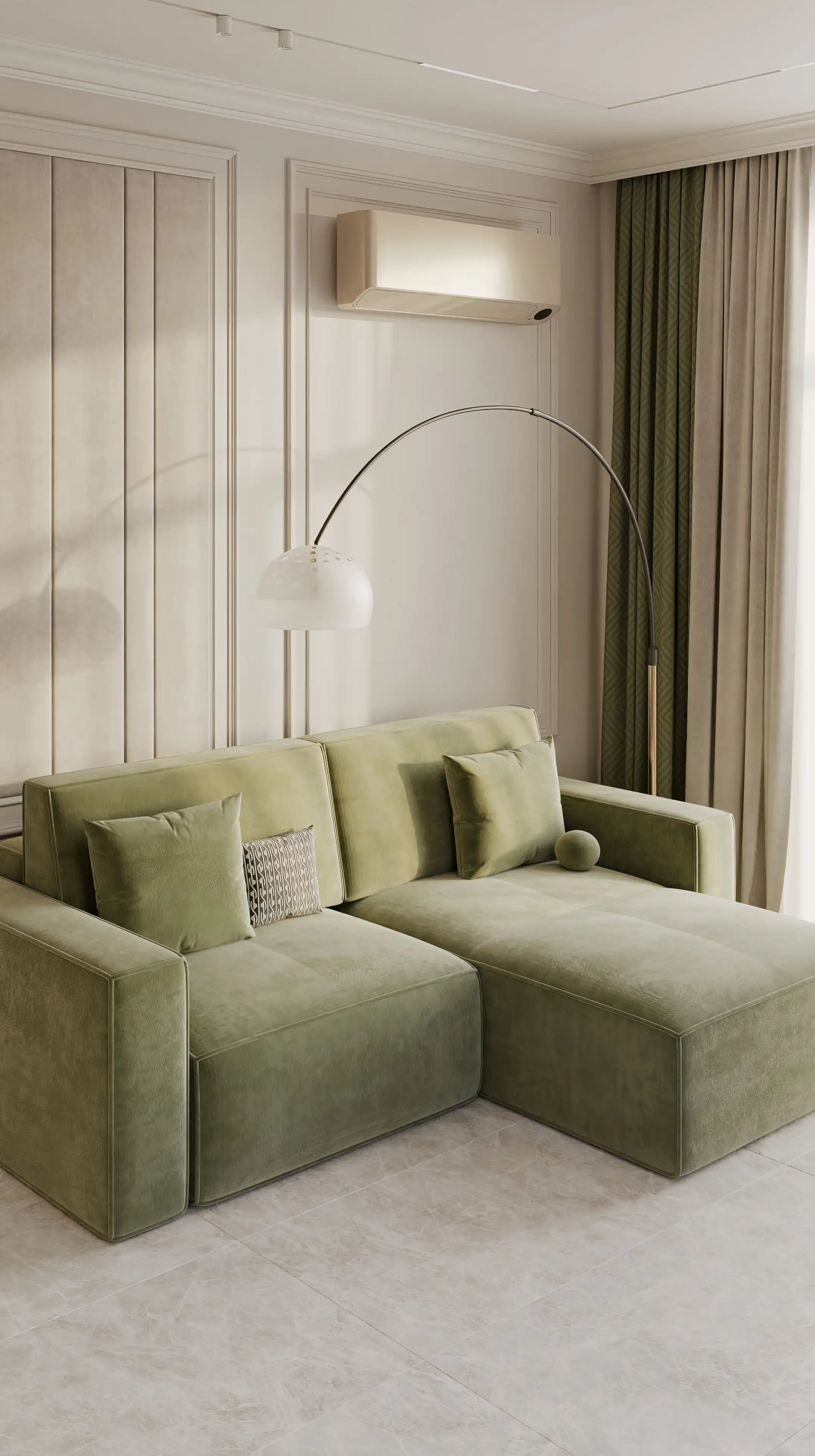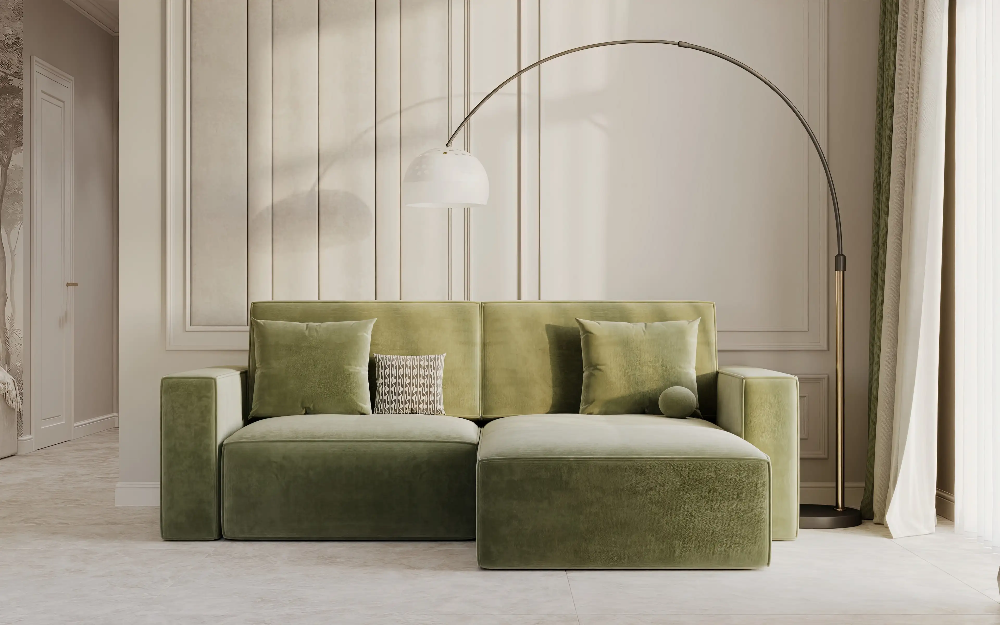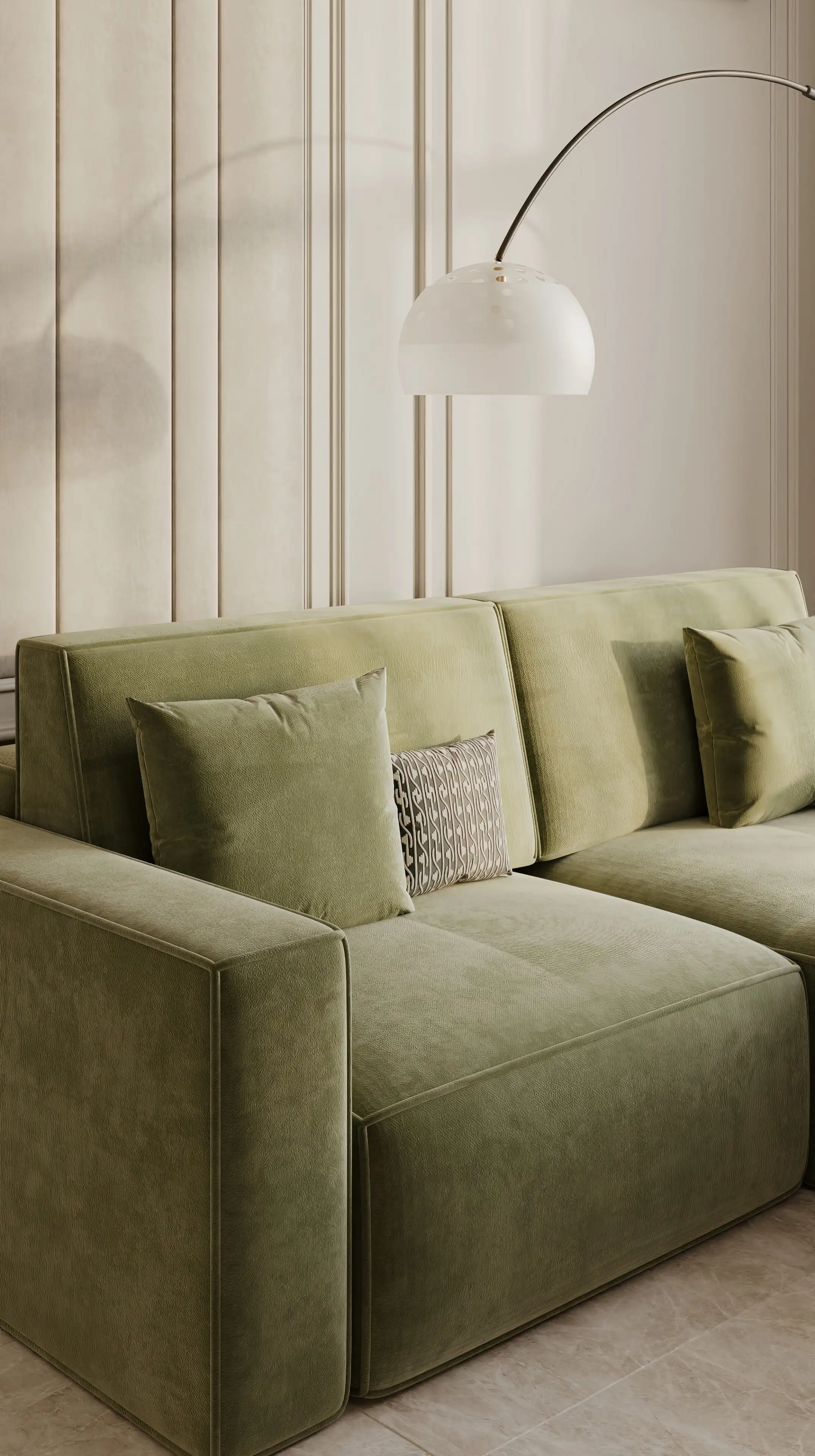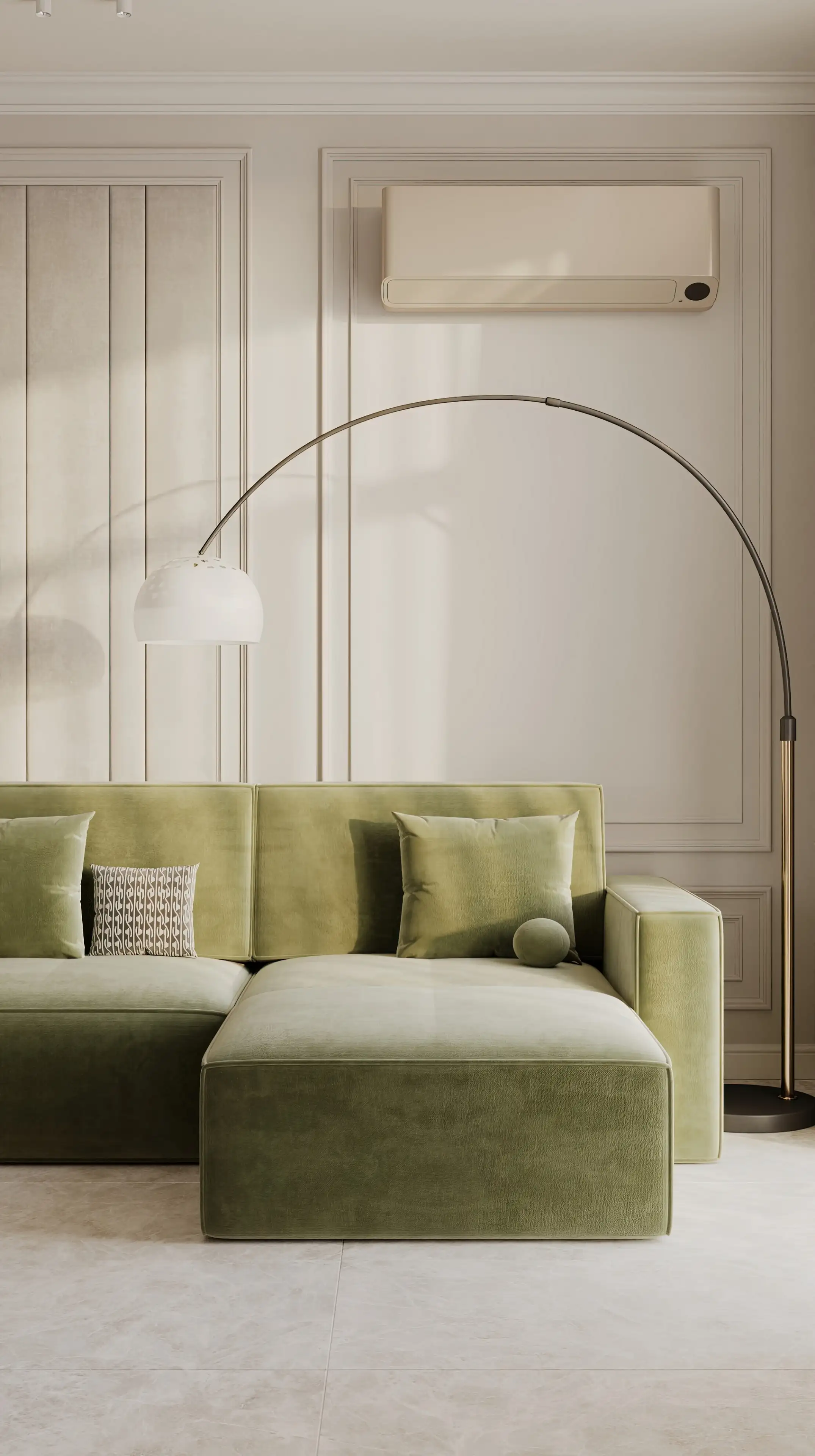 Большой полукруглый торшер создаёт уют в зоне отдыха, а его округлая ножка смягчает строгую геометрию молдингов.