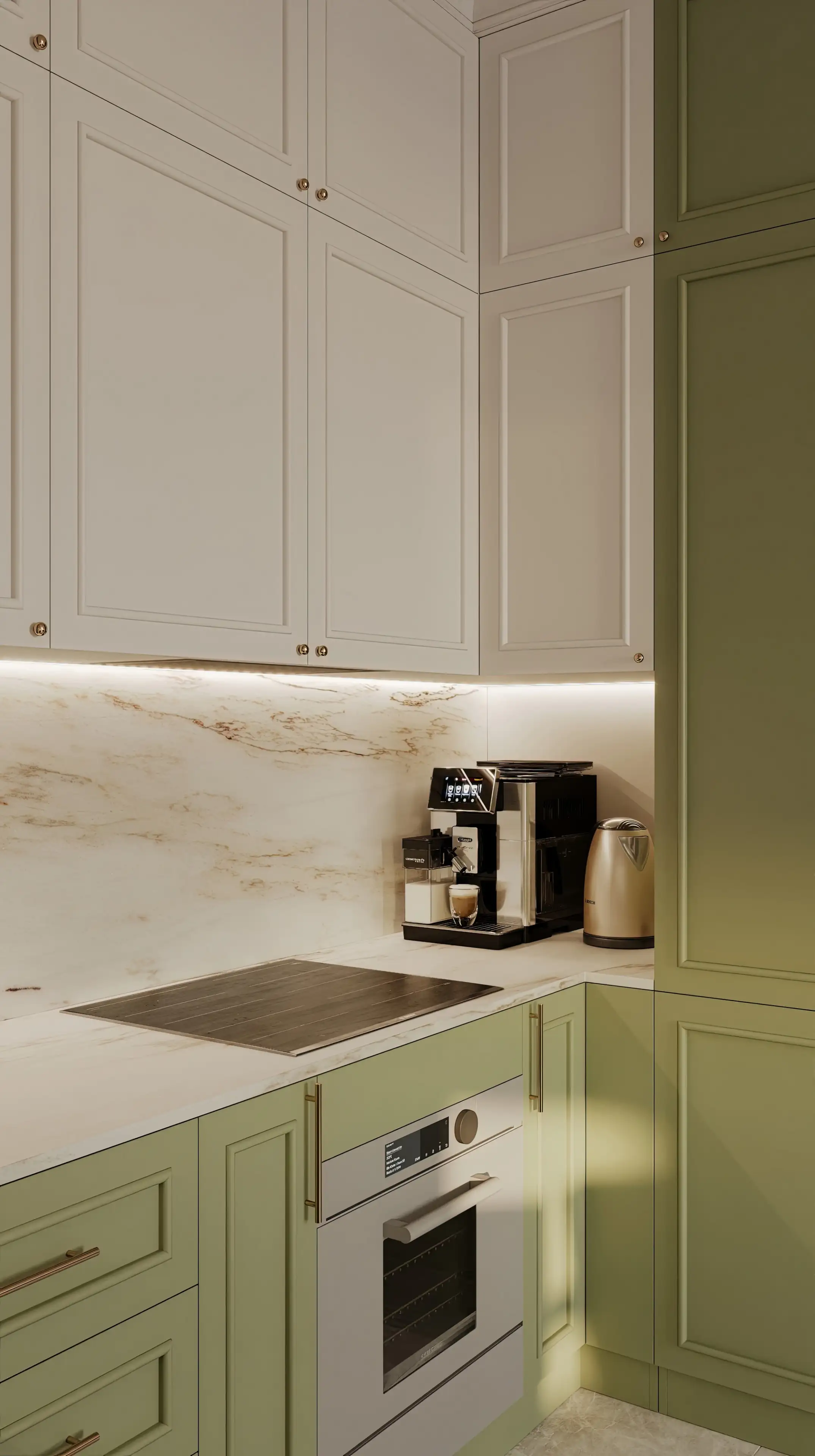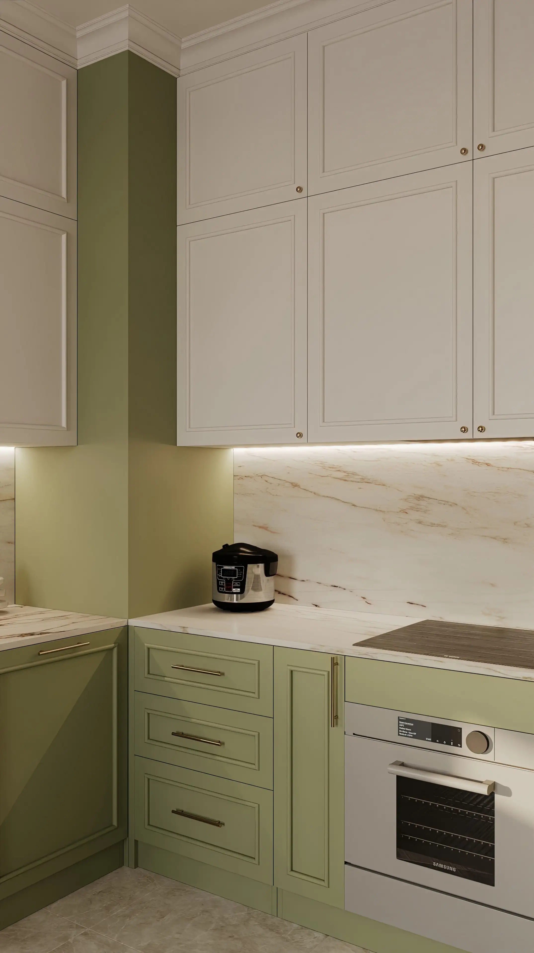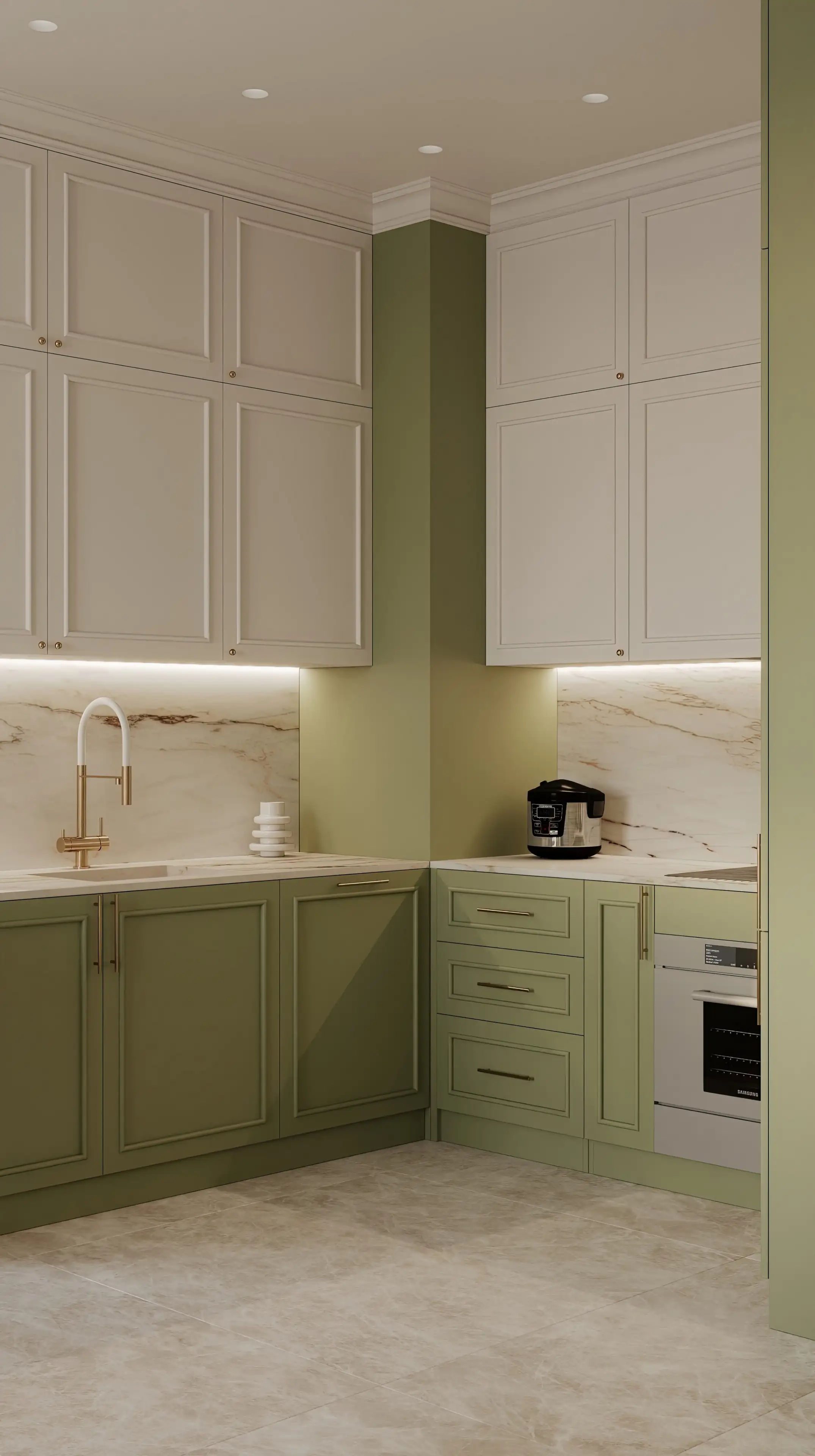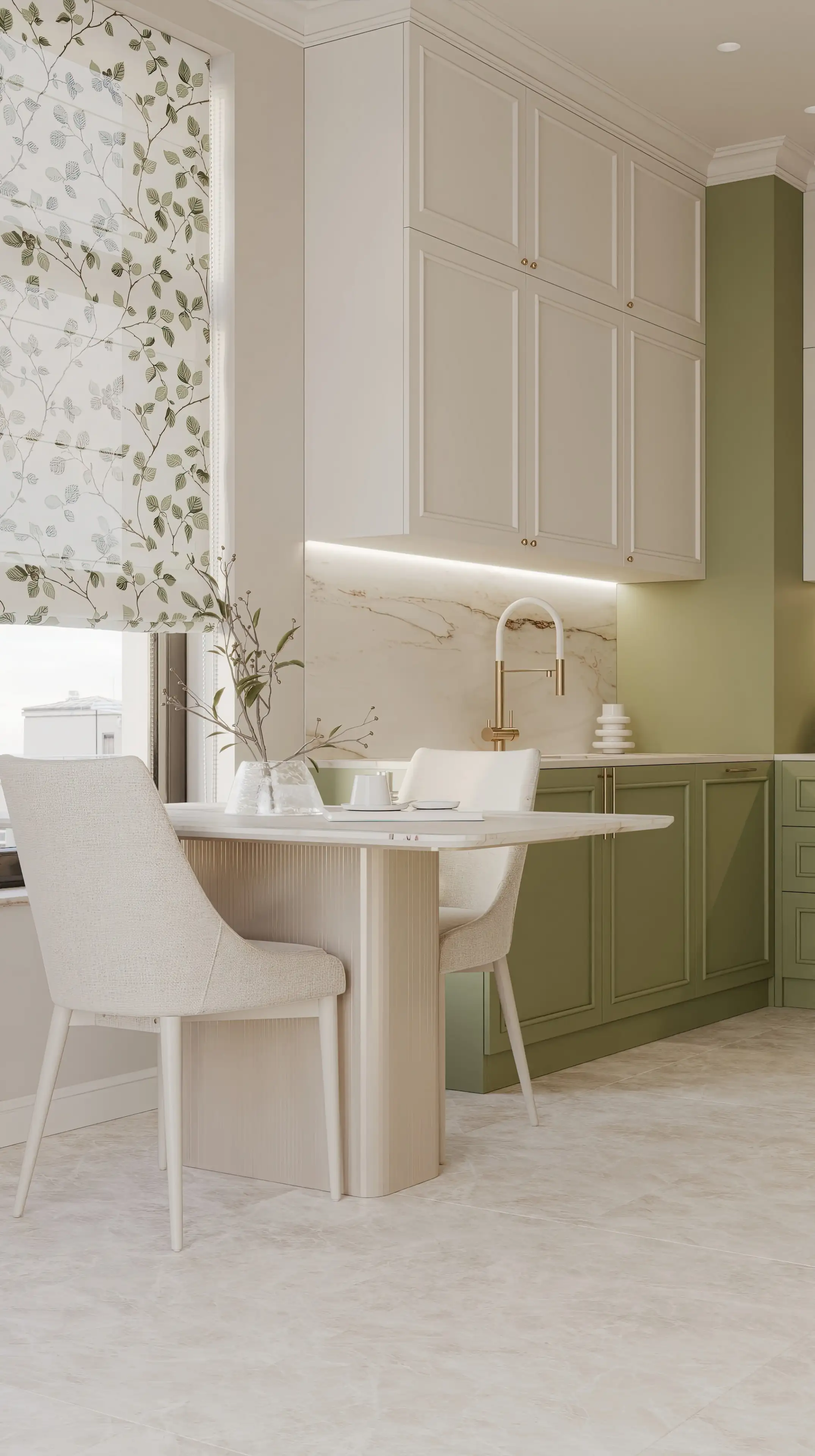 Кухонные фасады тоже украшены молдингами, так гарнитур легко вписался в общий стиль неоклассики. Мраморный оттенок фартука и столешницы перекликается с рисунком керамогранита на полу.