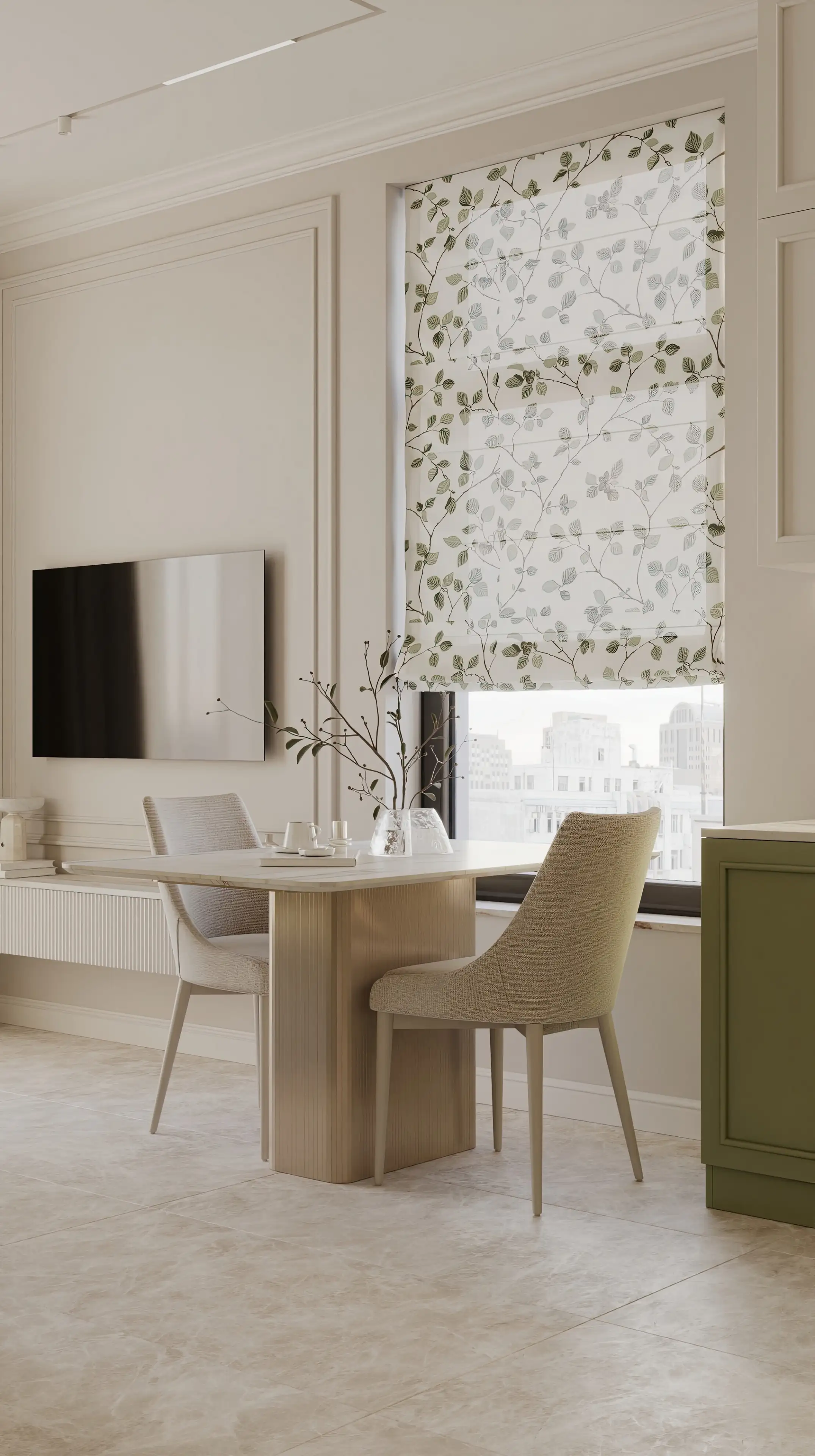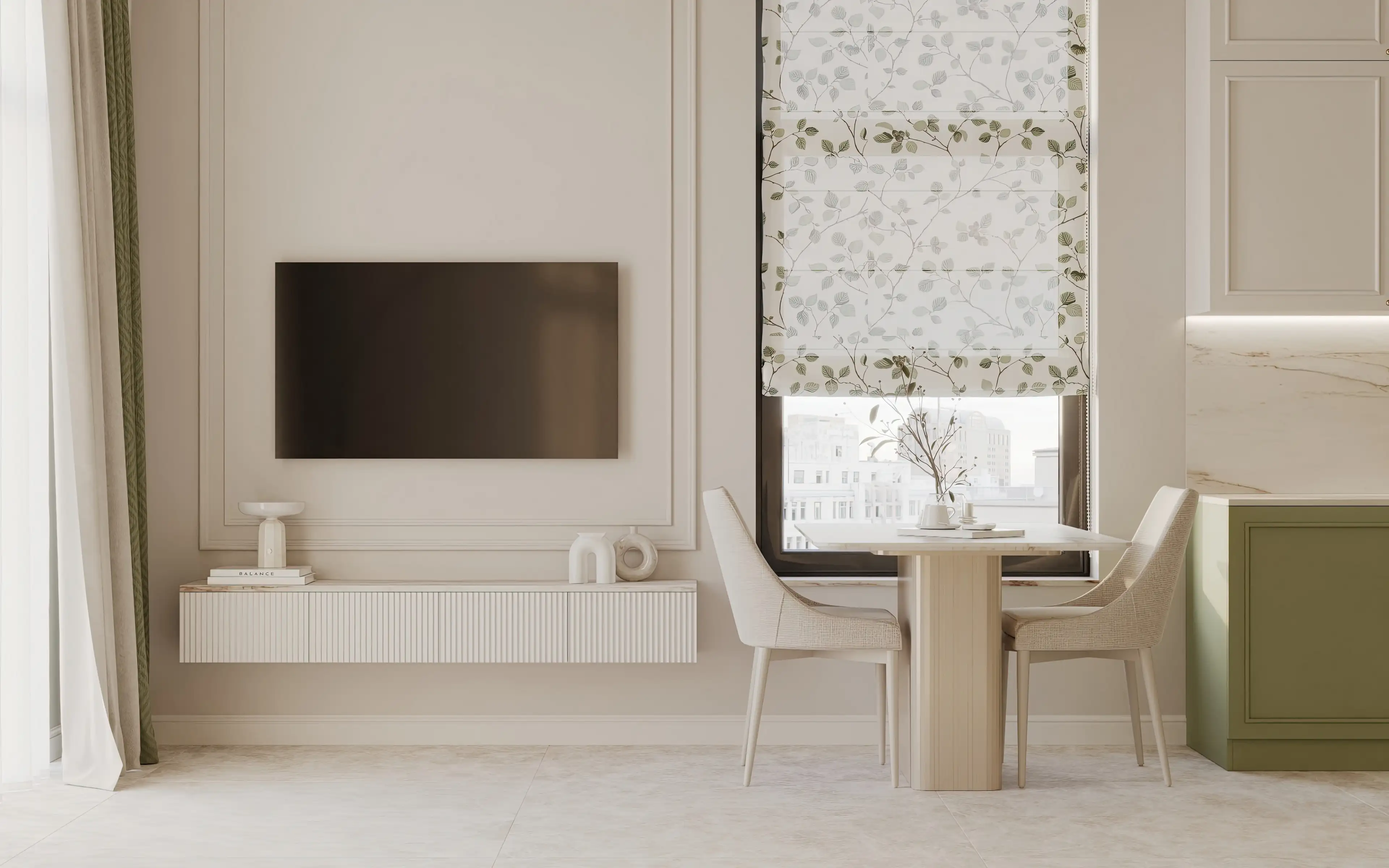 Телевизор также оформлен молдингами, а римская штора с цветочным орнаментом дарит помещению расслабленное настроение.