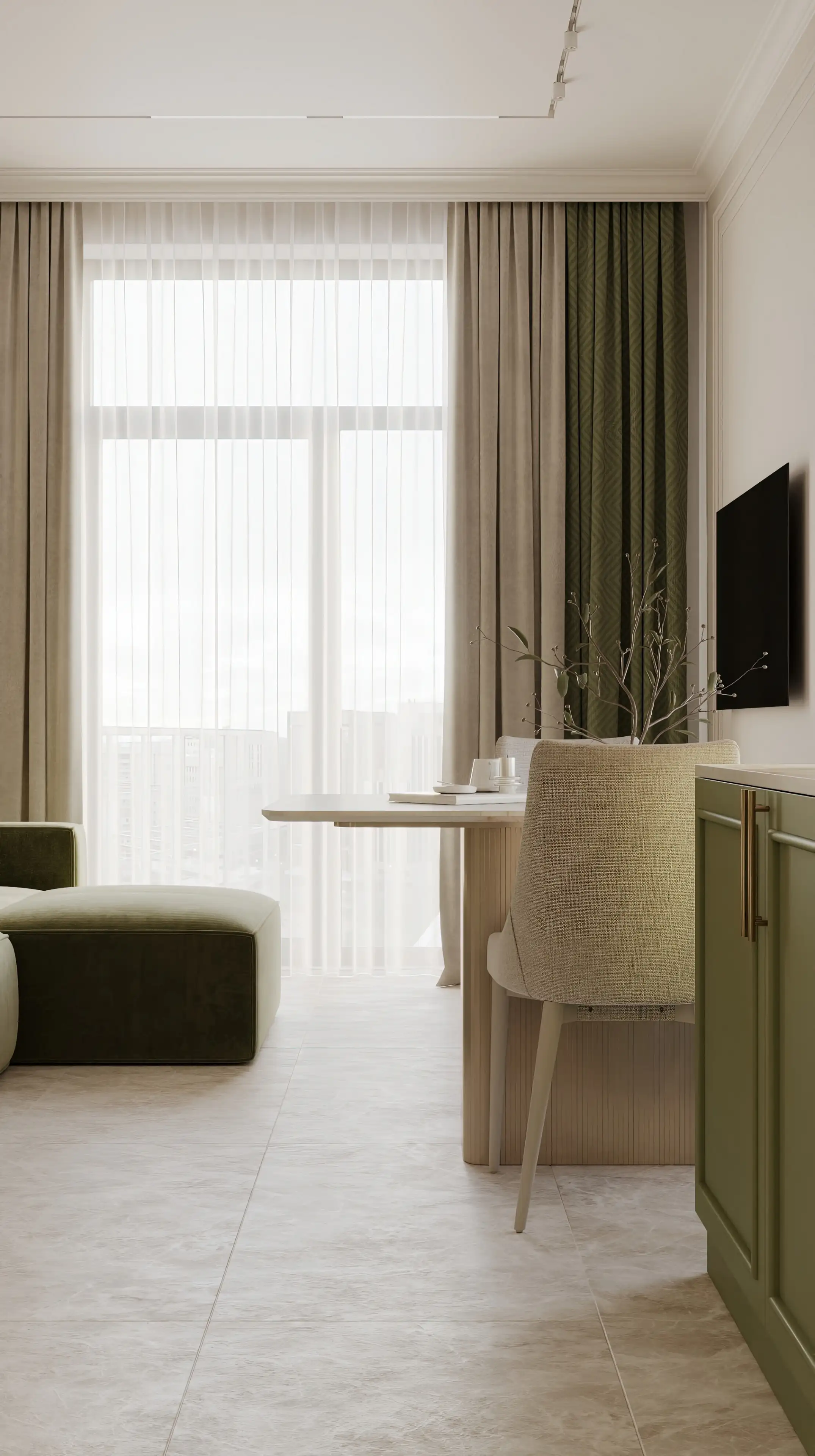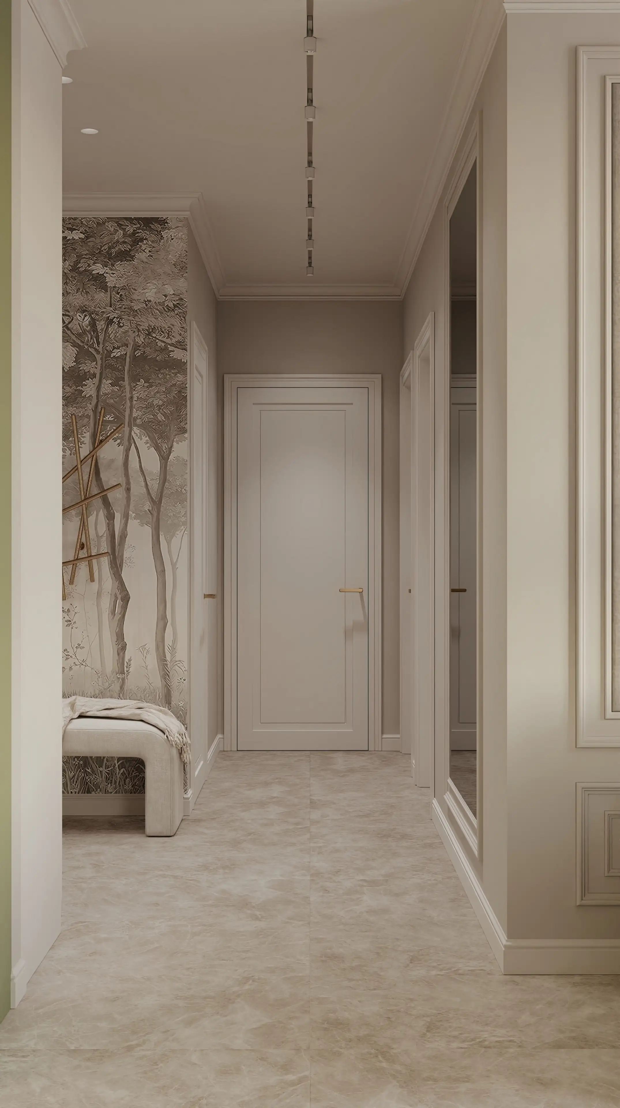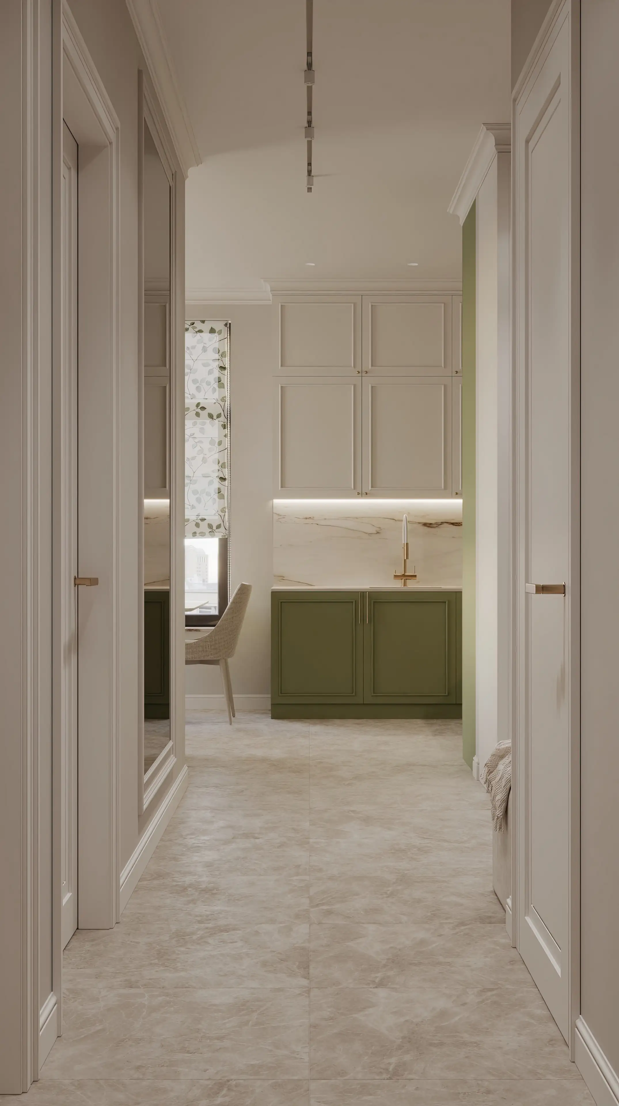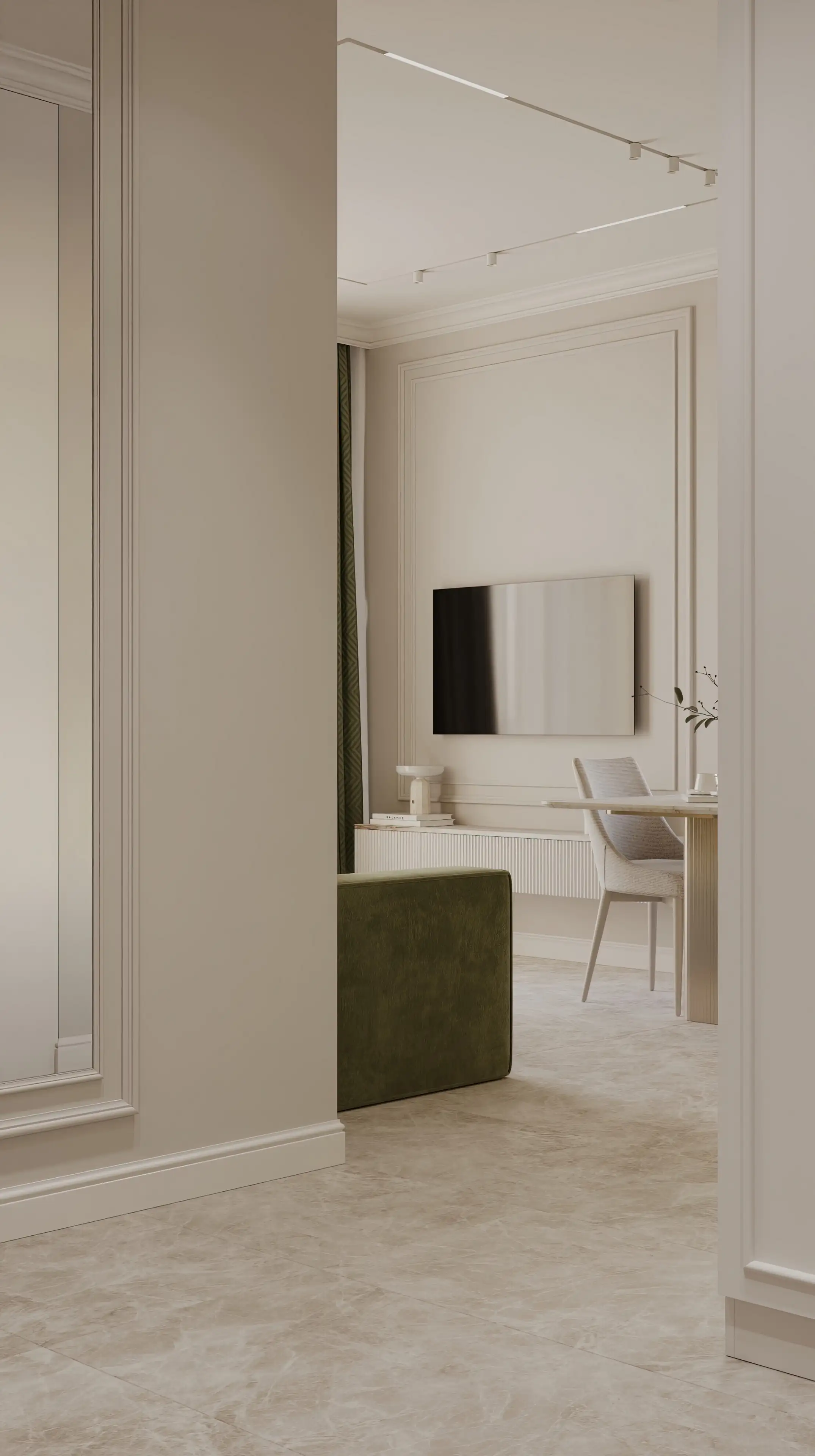 Встроенный шкаф на тон темнее стен с молдингами в цвет фасадов сохраняет цельность, но читается объёмно. Рядом располагается акцентная стена с белыми молдингами, что добавляет пространству контраст и ритм.