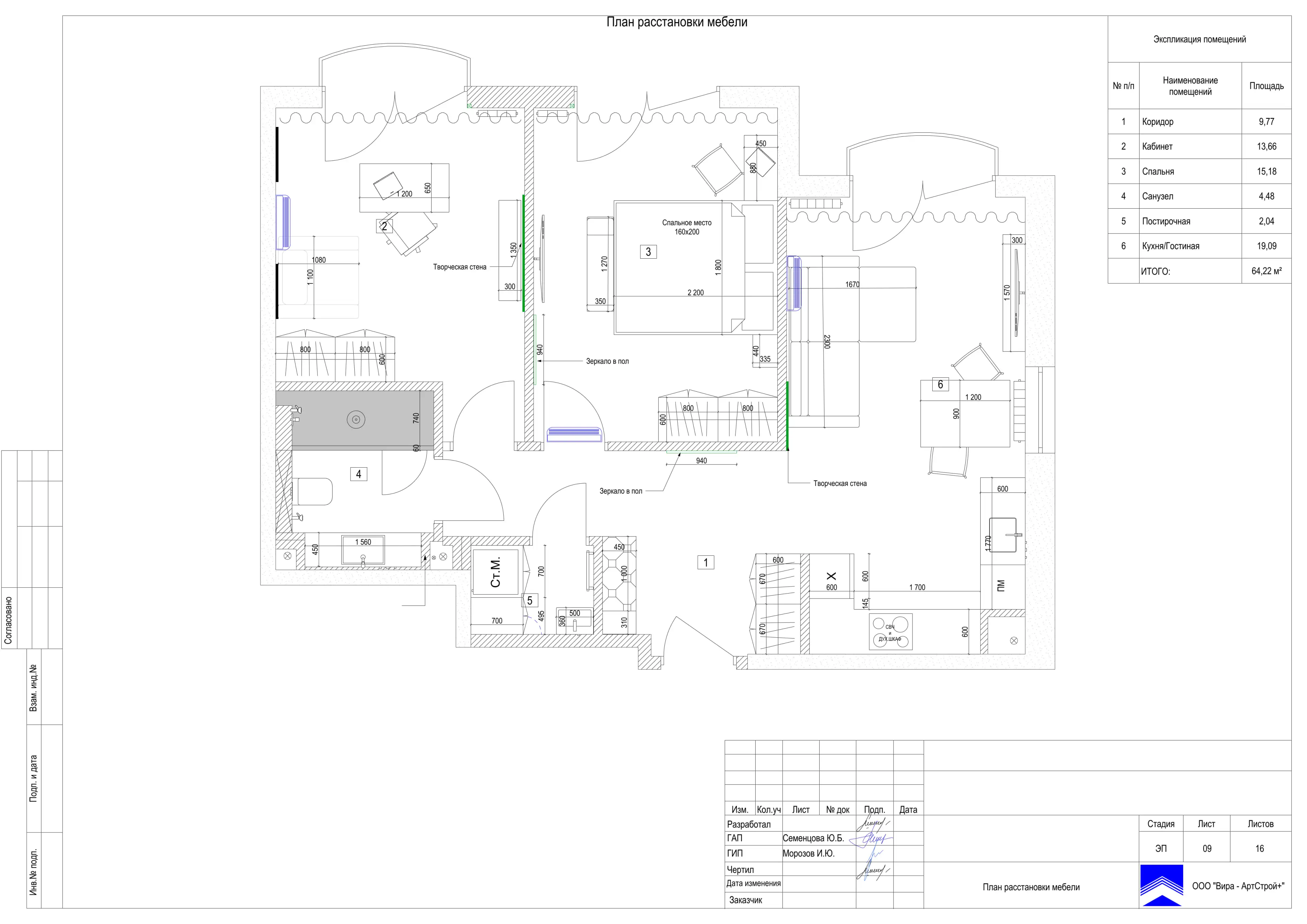 Рядом со спальным местом находится второй рабочий стол, чтобы хозяева квартиры могли располагаться по отдельности и не мешать друг другу. Над рабочим местом мы расположили шкаф с подсветкой для хранения документов или личных вещей.