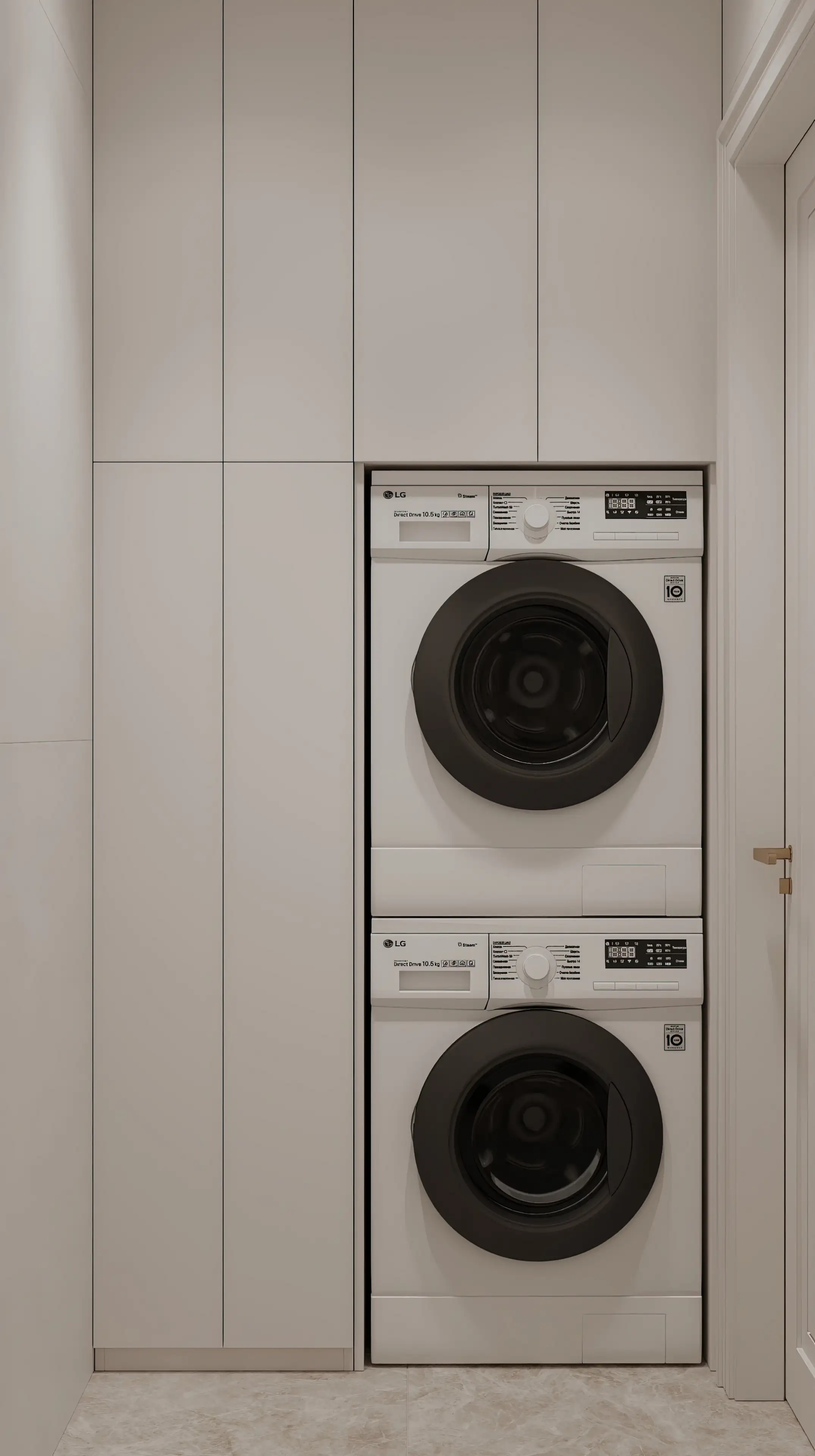 Ровные линии светлых встроенных шкафов до потолка сочетаются с тёмными круглыми дверцами стиральной и сушильной машин. Это создаёт современный геометричный акцент в стиле ар-деко, который интересно контрастирует с общим интерьером квартиры.