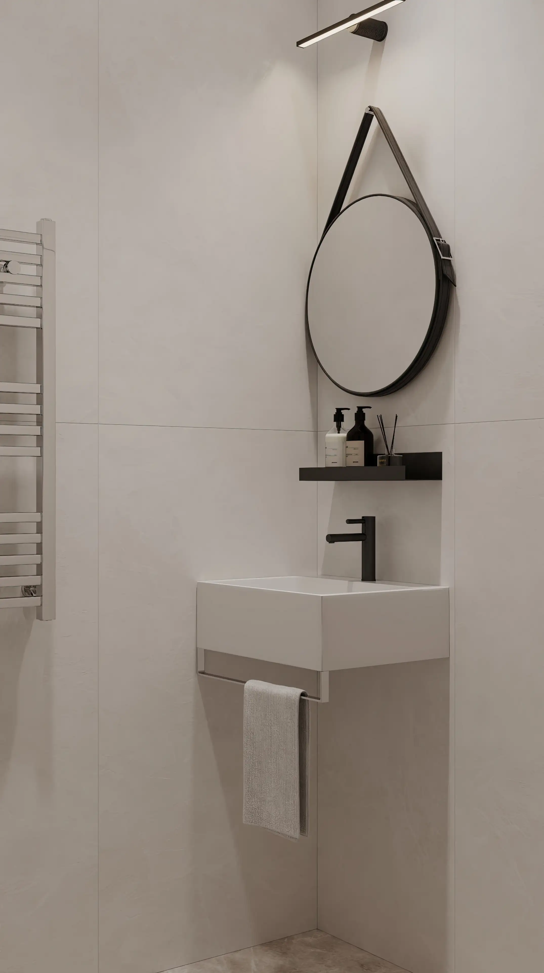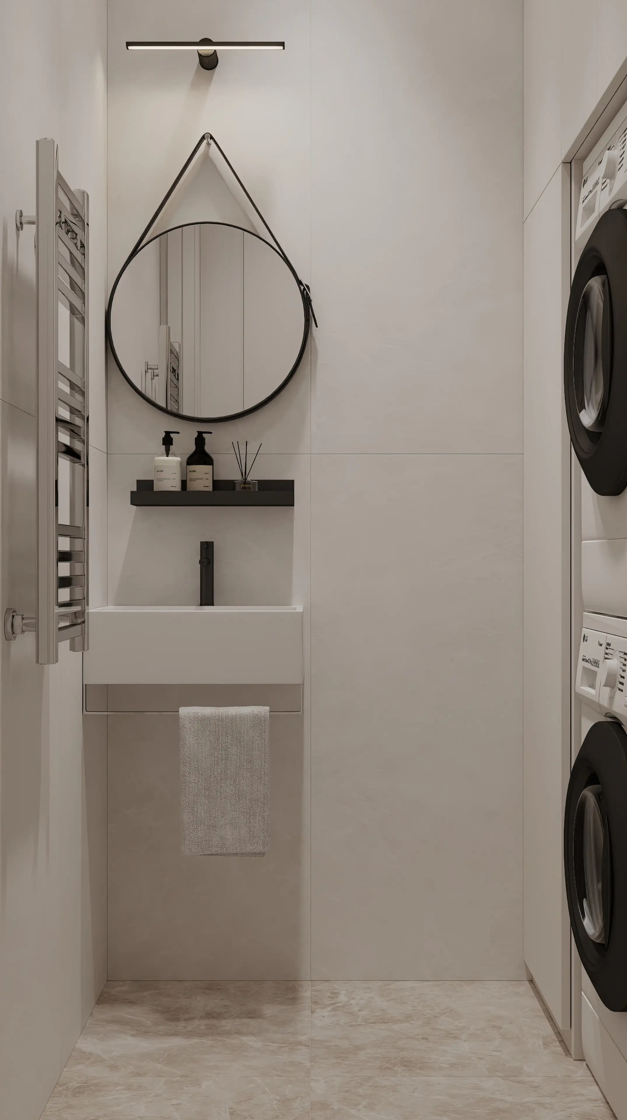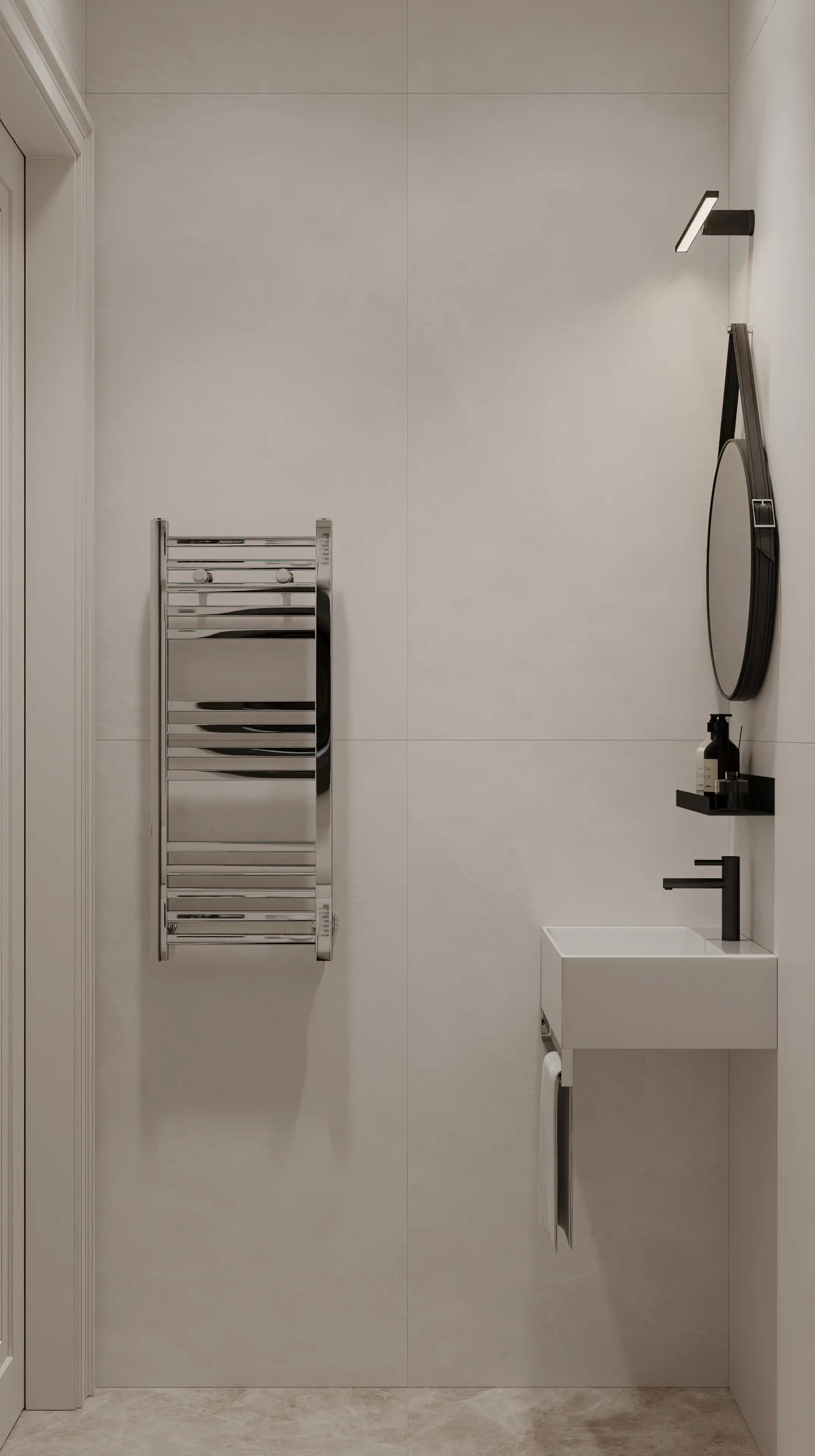Строгие прямые линии серебристого полотенцесушителя стали ещё одним выразительным акцентом. Мы отказались от привычной подсветки по периметру зеркала, заменив её на статичный прожектор, который создаёт идеальное бестеневое освещение.