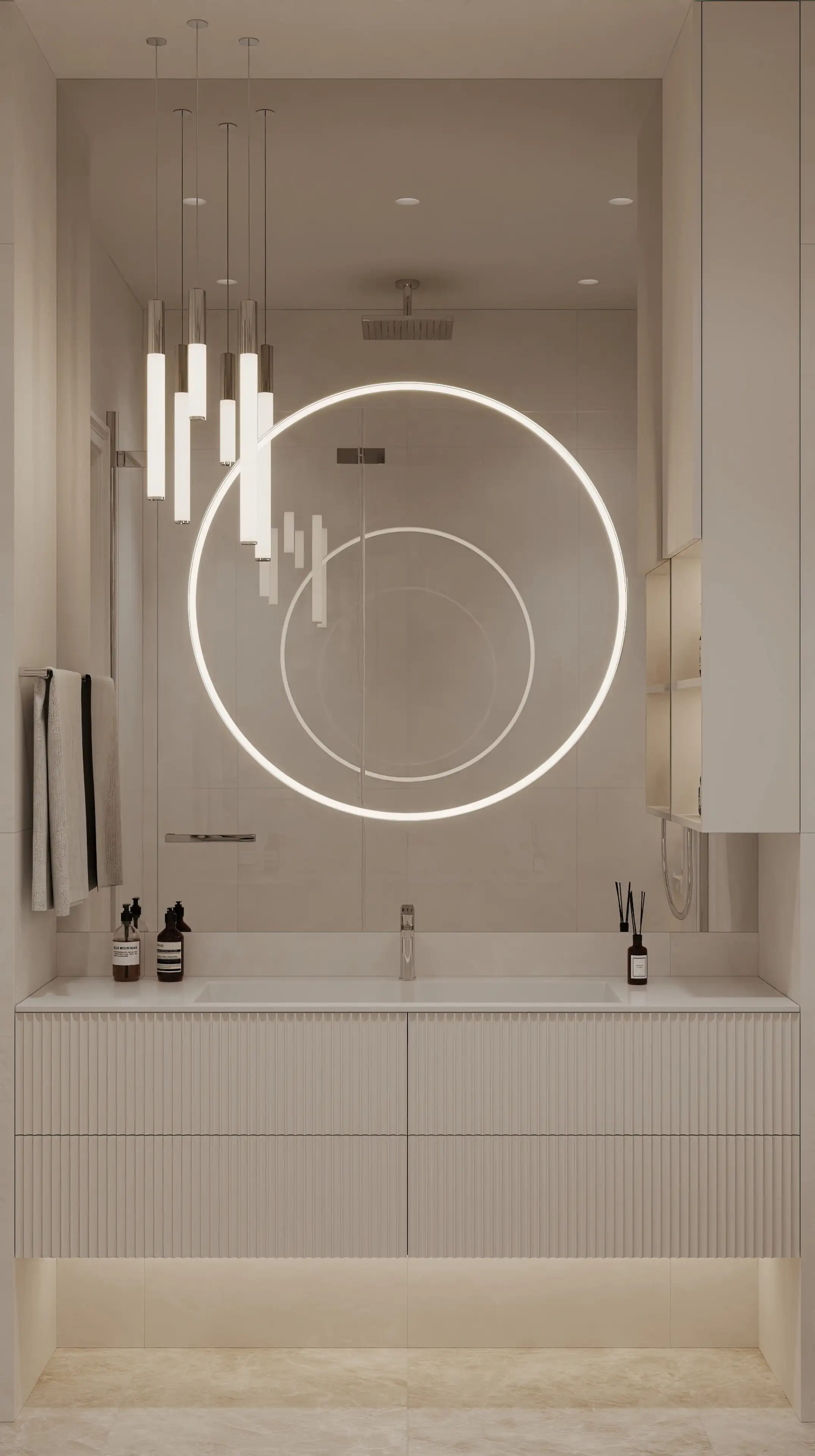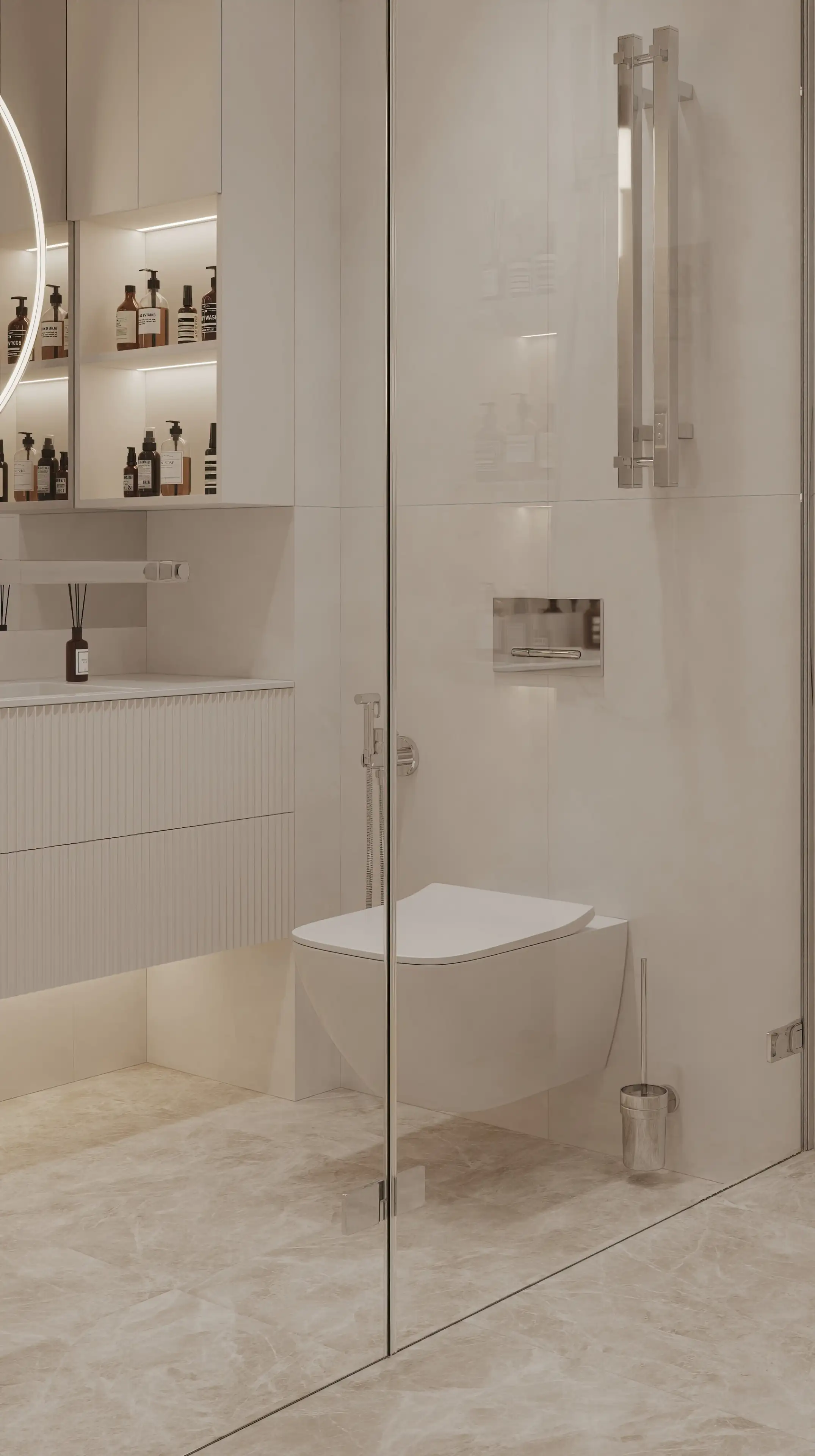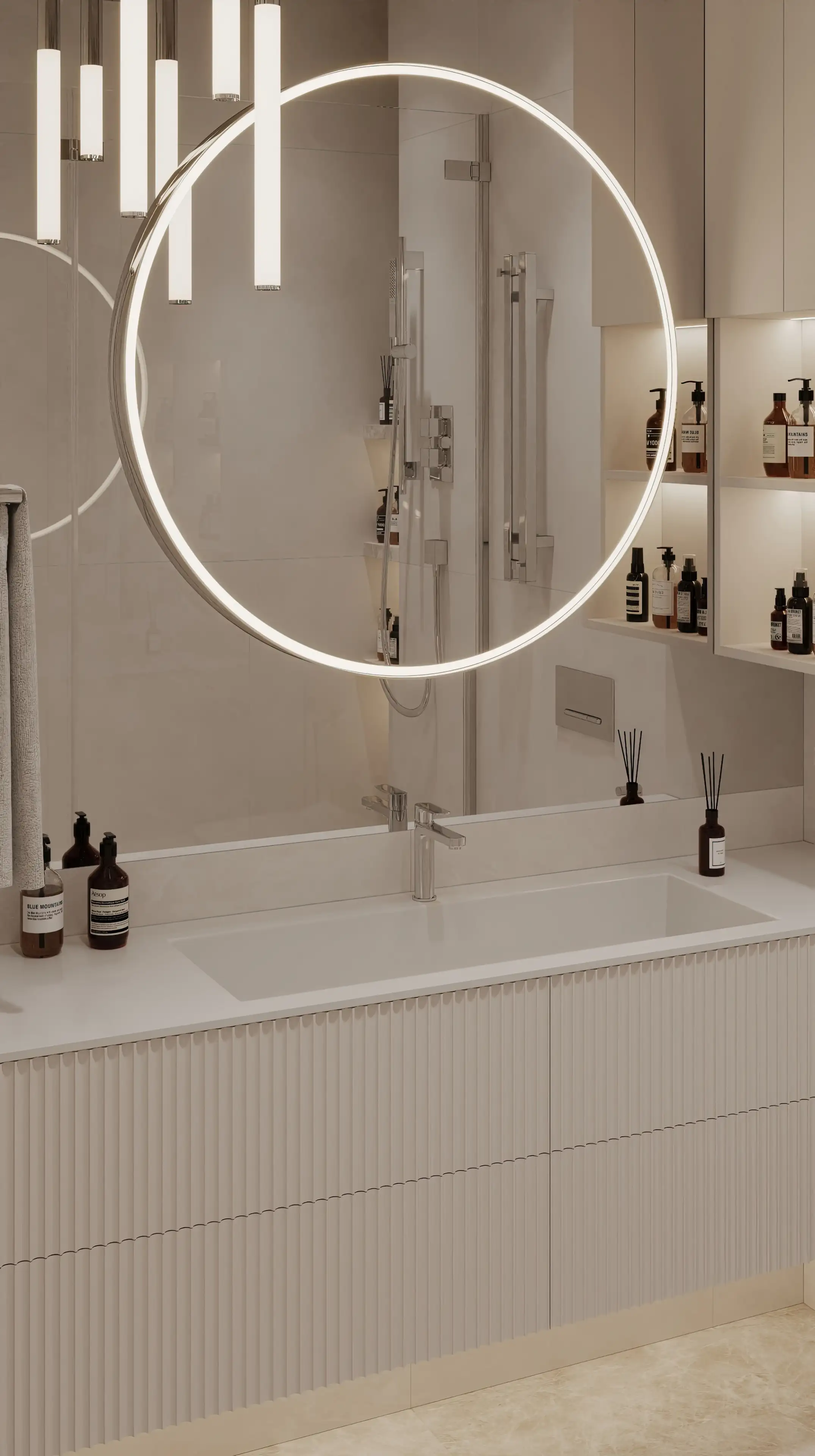 Строгие прямые линии серебристого полотенцесушителя стали ещё одним выразительным акцентом. Мы отказались от привычной подсветки по периметру зеркала, заменив её на статичный прожектор, который создаёт идеальное бестеневое освещение.