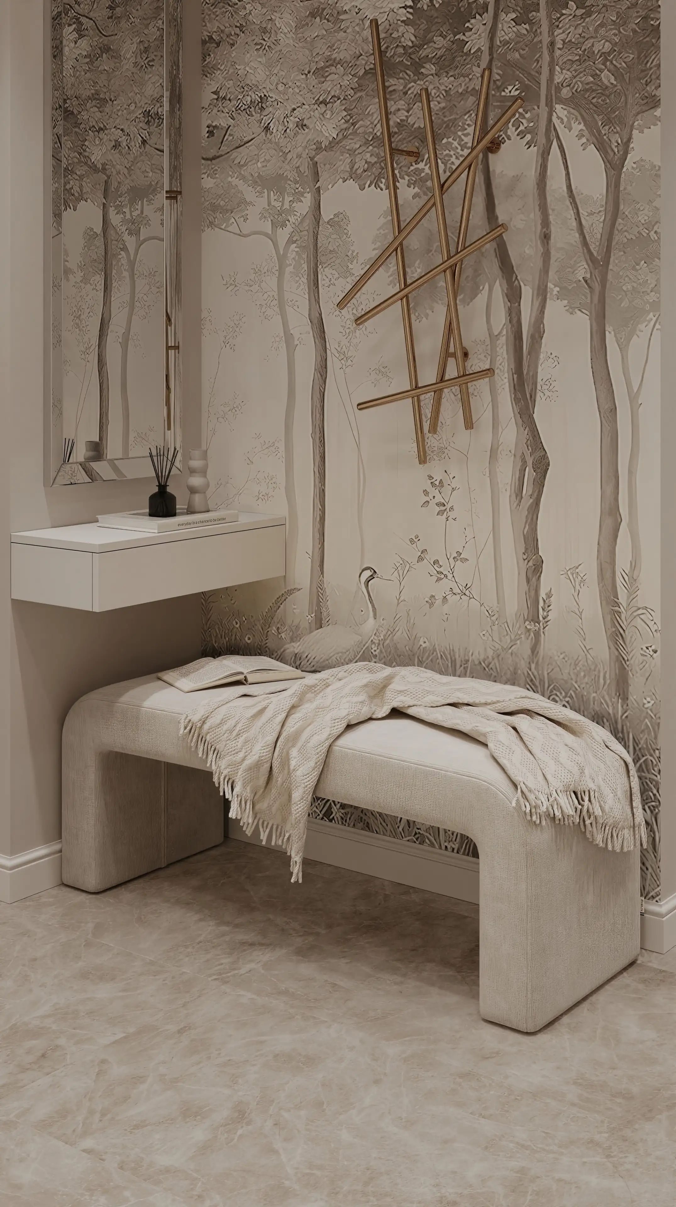 Второе зеркало расположено над изящной полочкой для ключей и мелочей. Вместе с пуфиком и акцентной стеной с фреской оно создаёт удобный и законченный ансамбль.