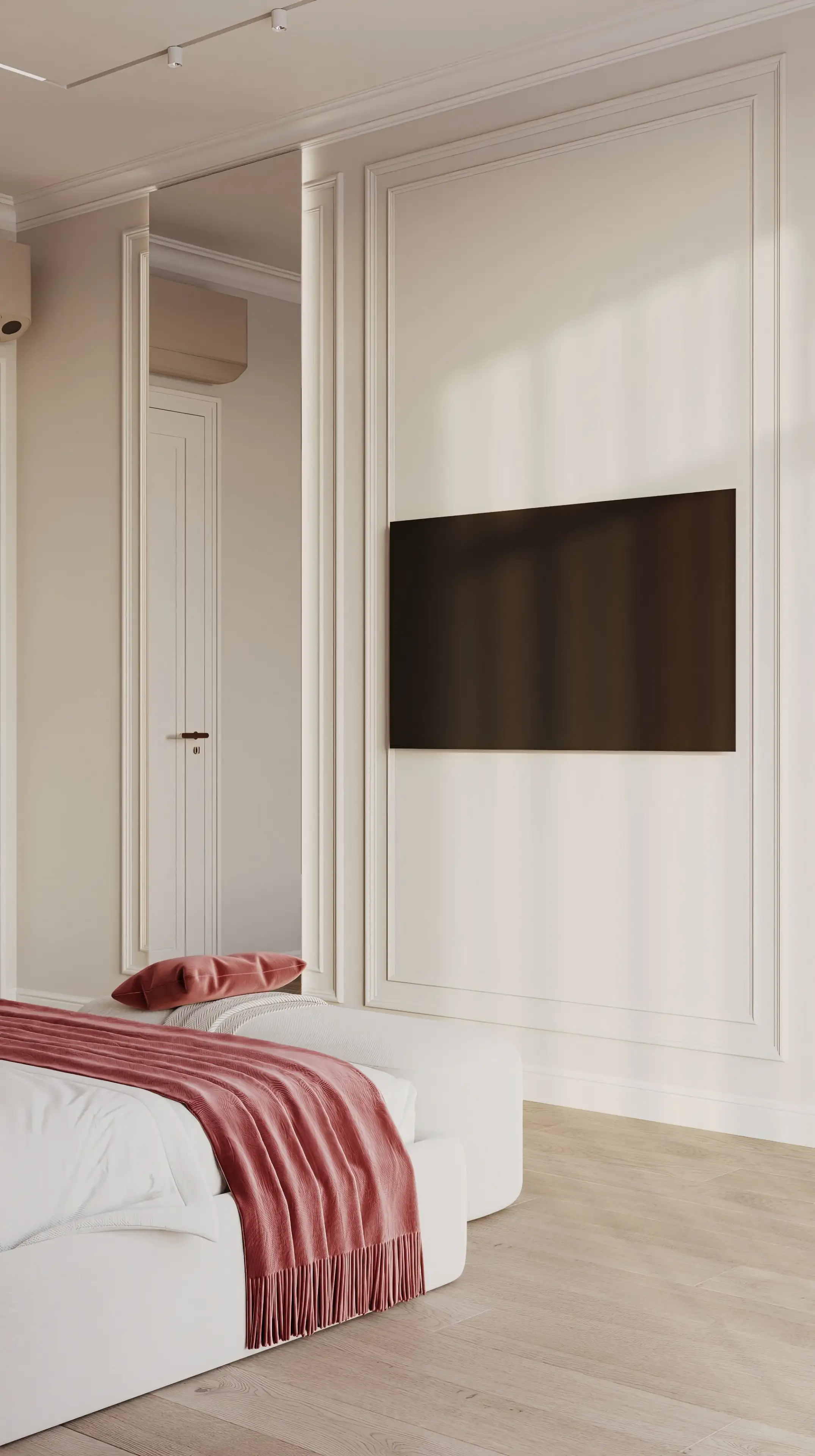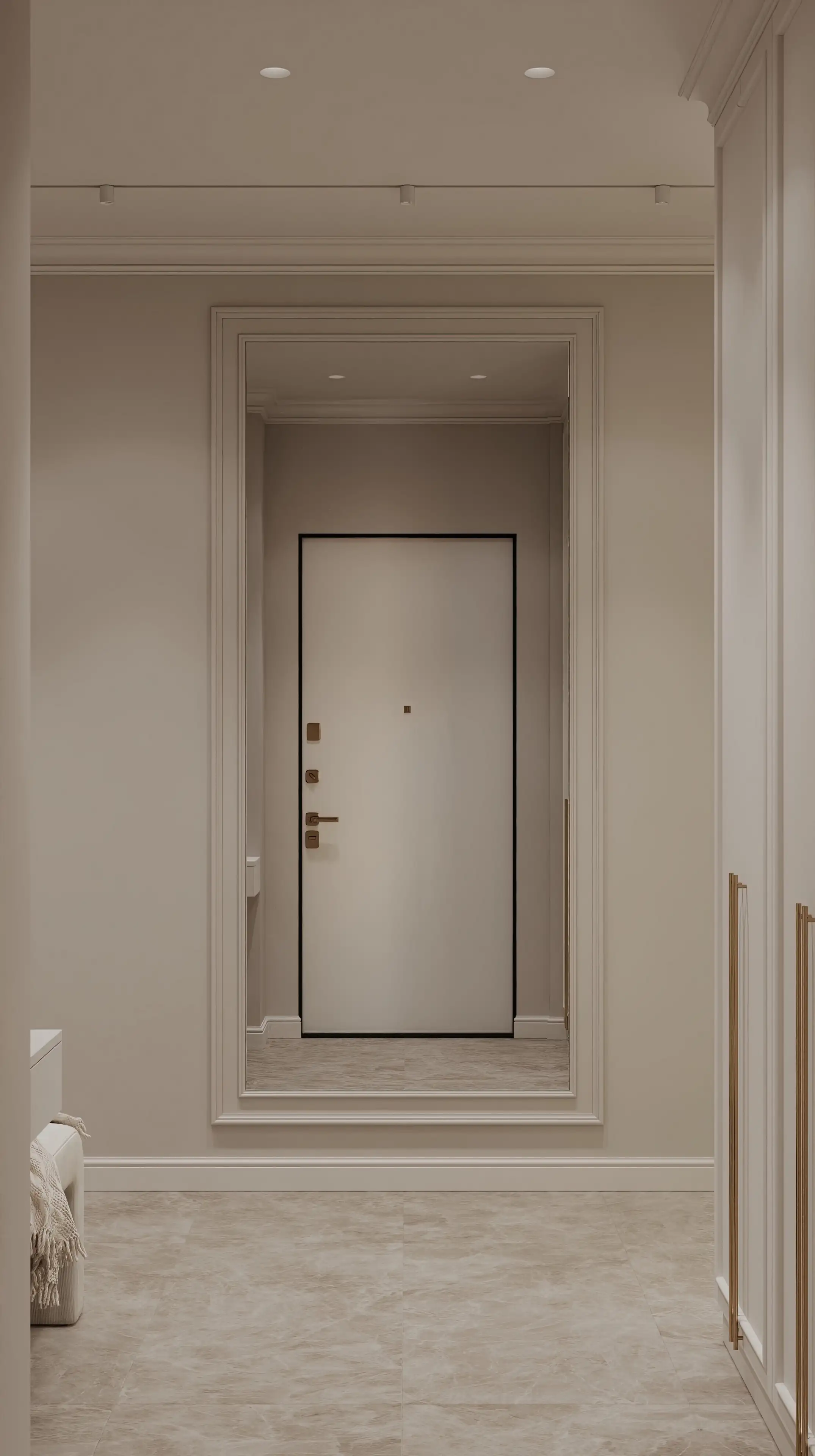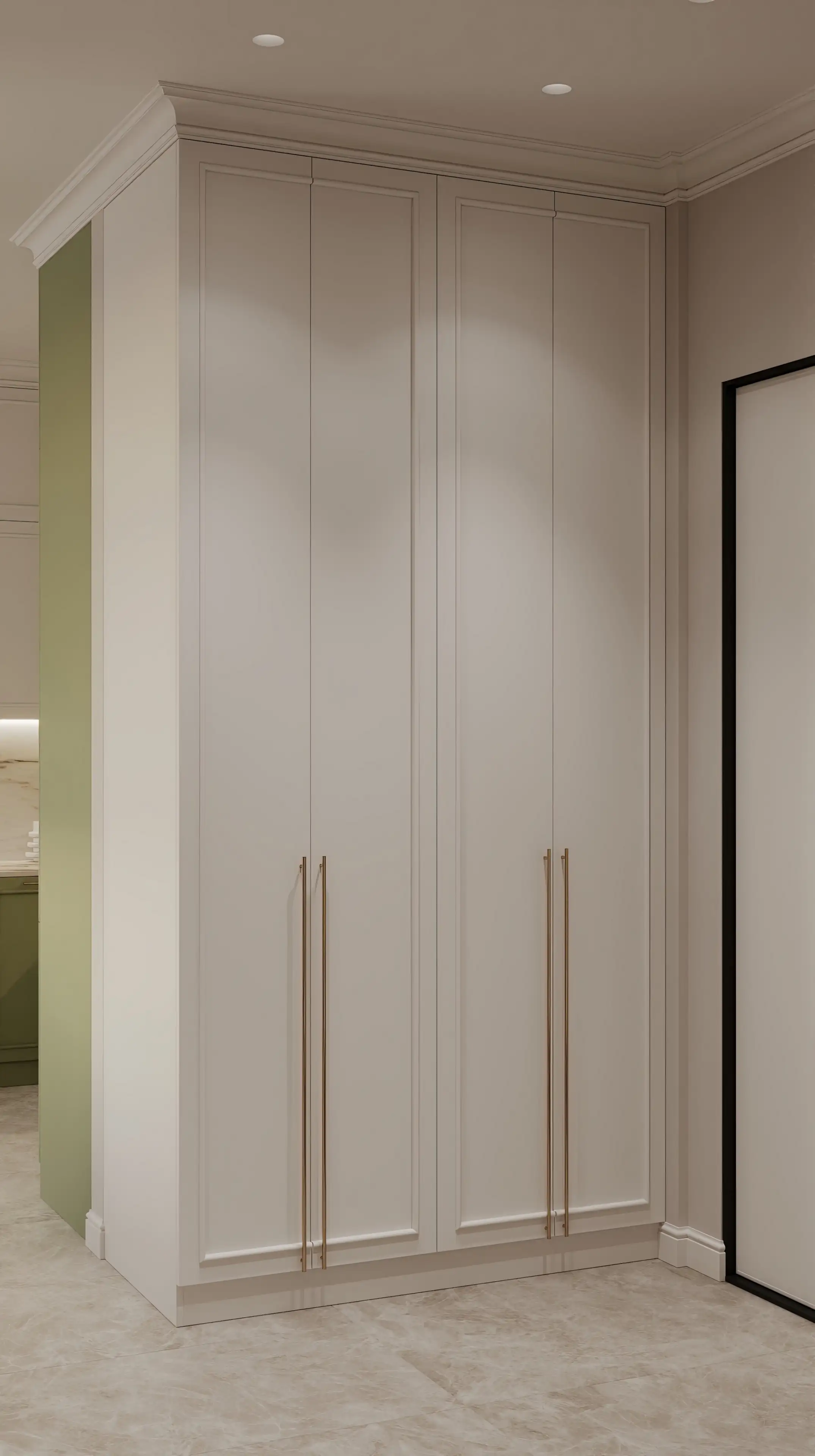 Белый встроенный шкаф до потолка с тонкими молдингами одновременно решает практические задачи и задаёт стилистику всего пространства. Золотистые ручки, как ювелирные акценты, подчеркивают статусность интерьера, созвучную с эстетикой неоклассики.