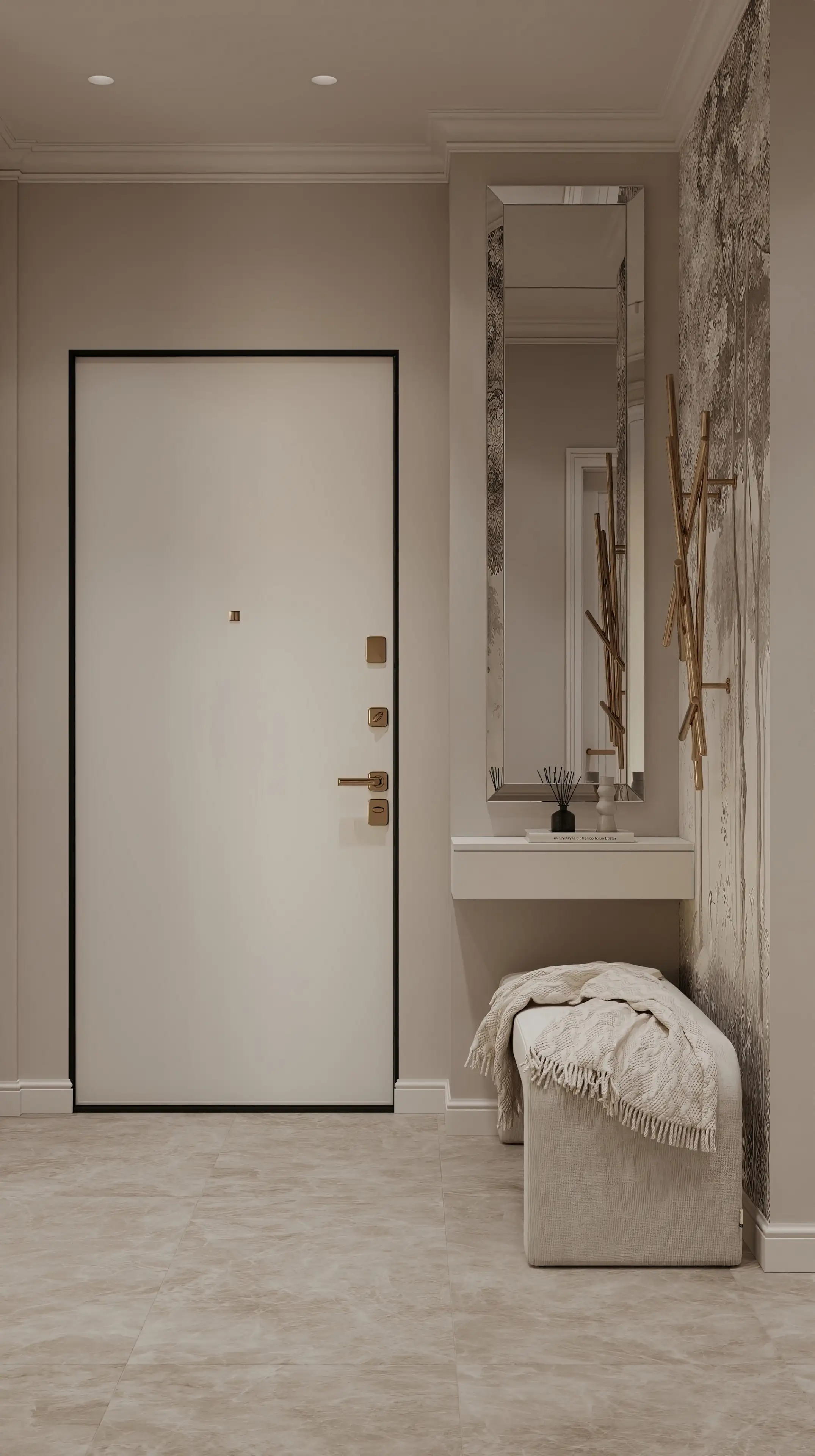 Тонкая чёрная окантовка входной двери контрастирует с лаконичными светлыми оттенками стен, придавая интерьеру завершённость.