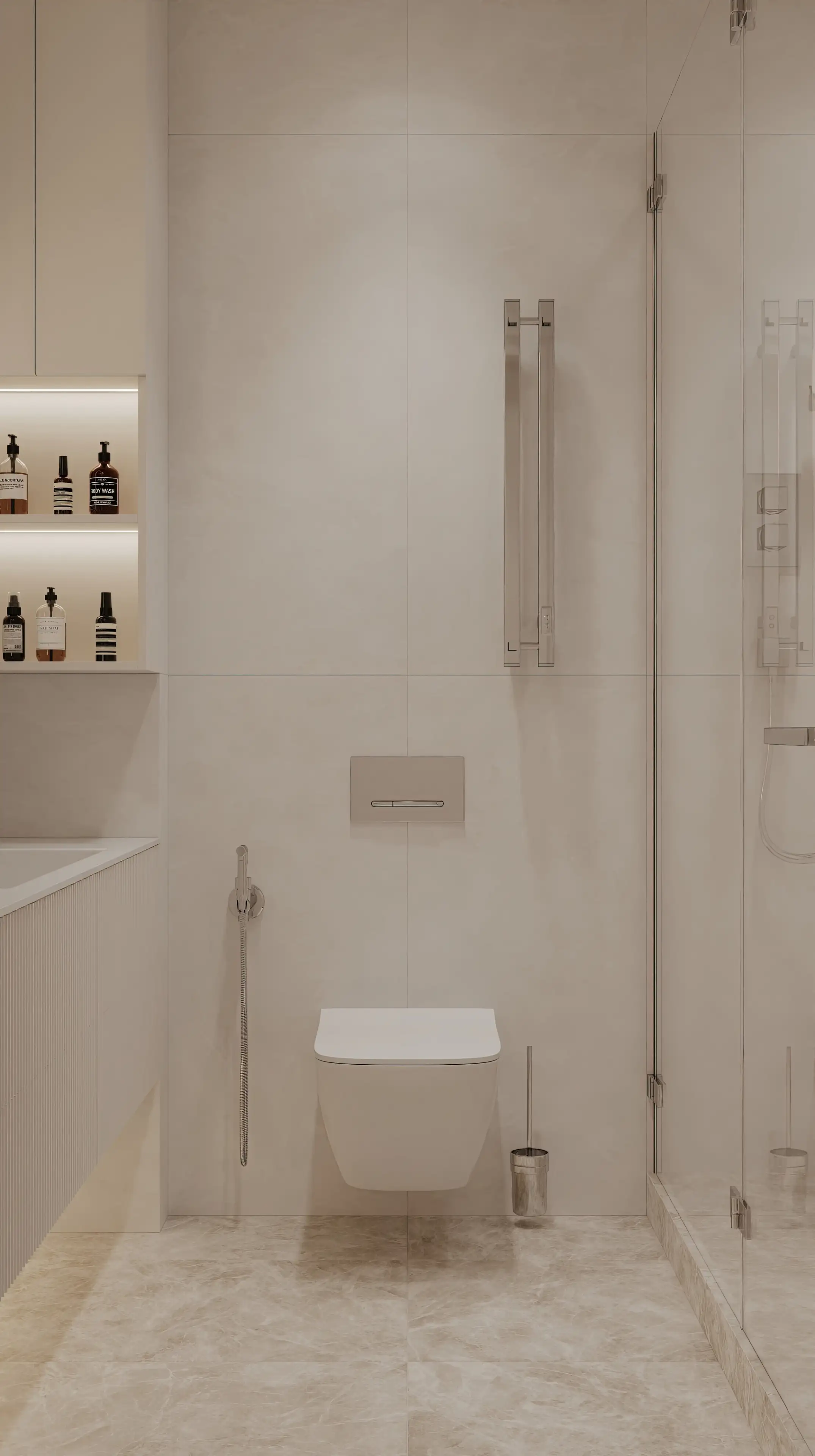 Подсветка под встроенной тумбой для раковины создает эффект парящей мебели, визуально увеличивая площадь санузла. Ночью она может работать как деликатный ночник, позволяя ориентироваться без включения основного света.