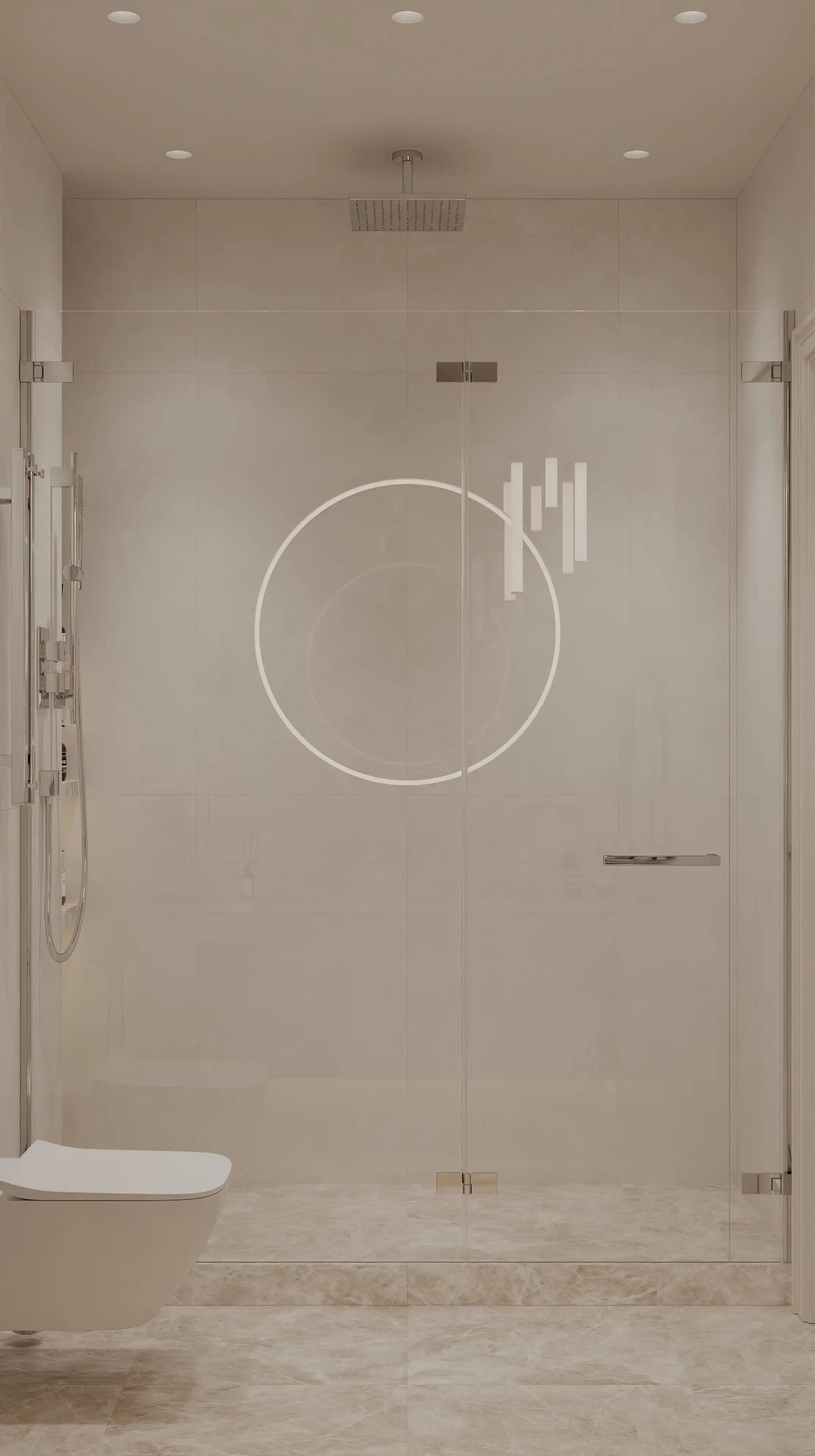 Полностью стеклянные дверцы душевой кабины буквально растворяют границы, делая пространство светлее и визуально просторнее. Отсутствие заметных контуров и фурнитуры превращает душевую зону в часть общего интерьера, а не в обособленную конструкцию.