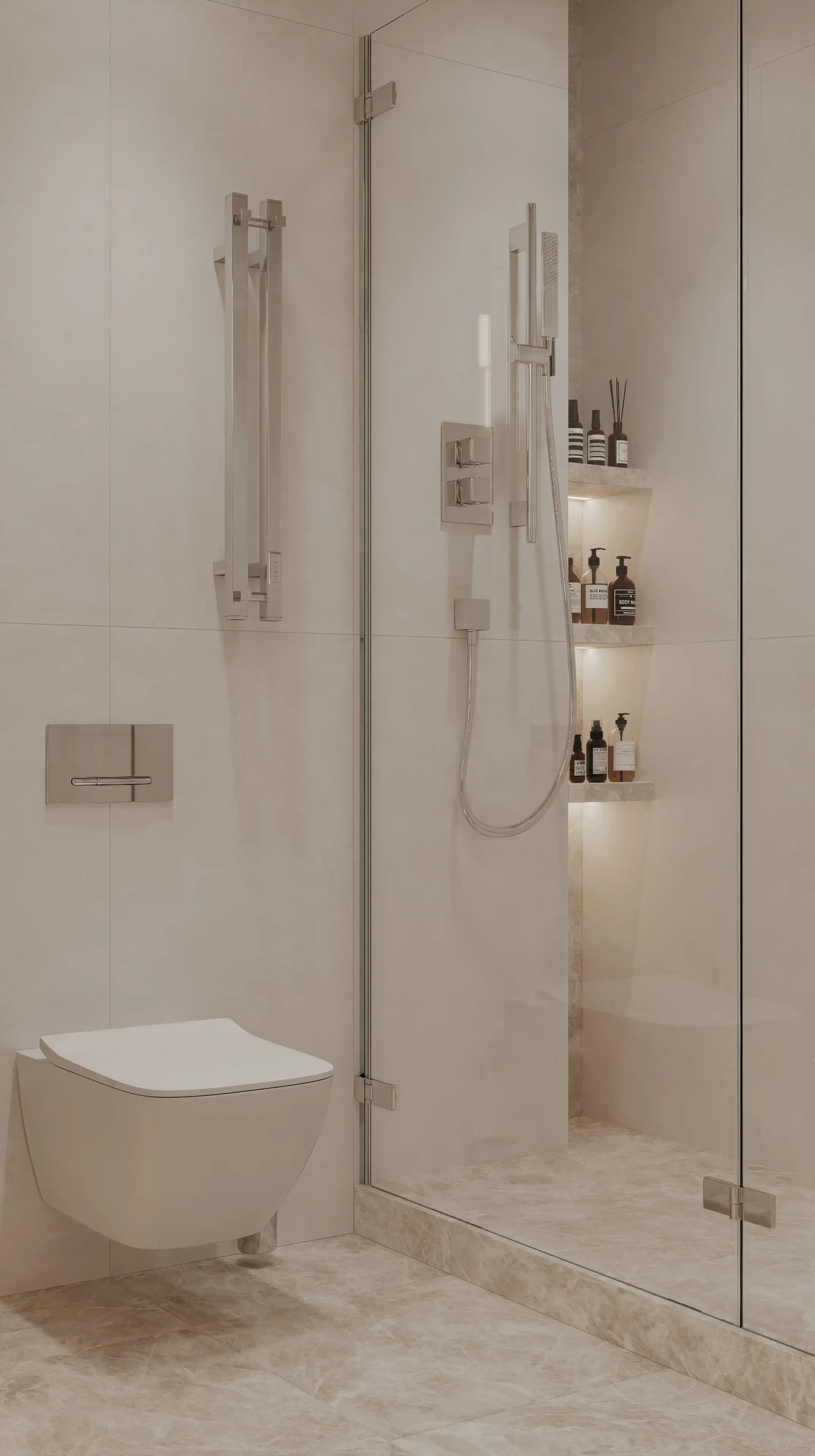 Лейка душа с чёткими графичными линиями продолжает общий замысел, подчёркивая лаконичность стиля. Встроенная ниша с подсветкой скрывает из поля зрения уходовые средства и подсвечивает пространство душевой уютным светом.