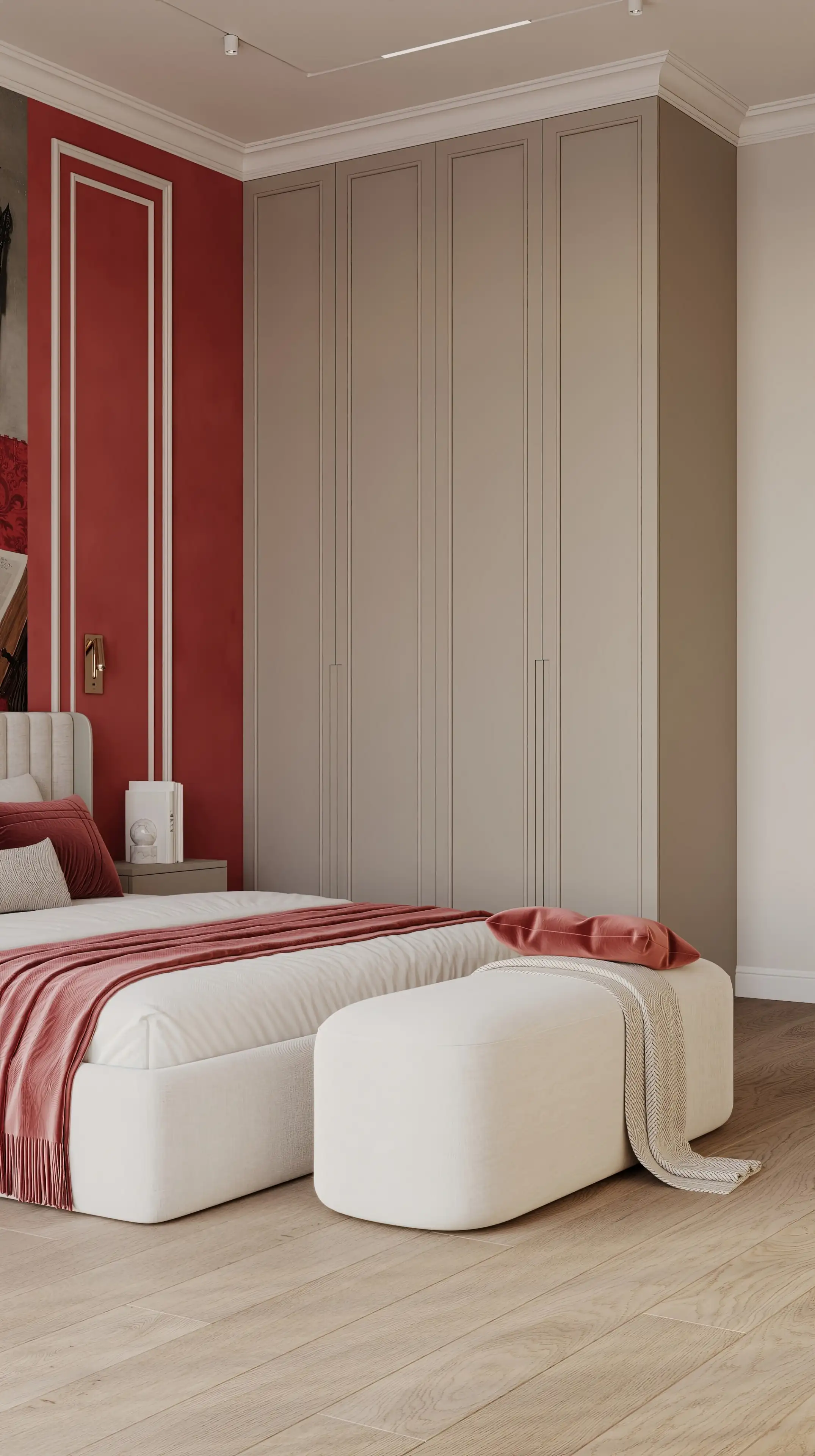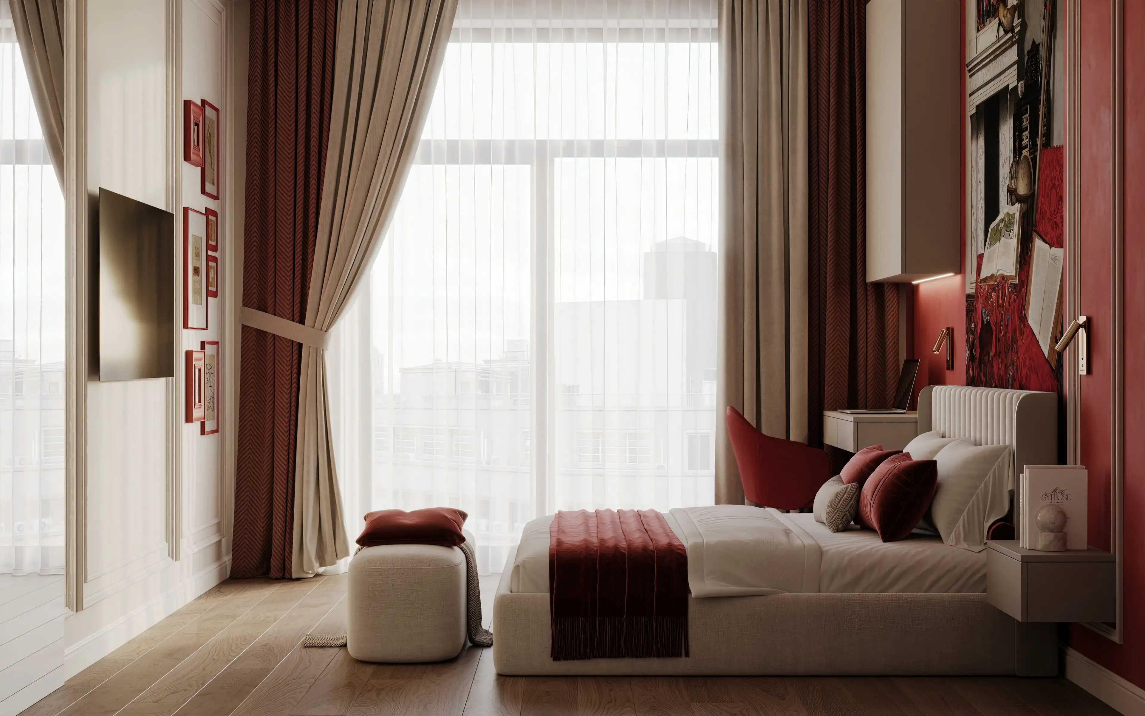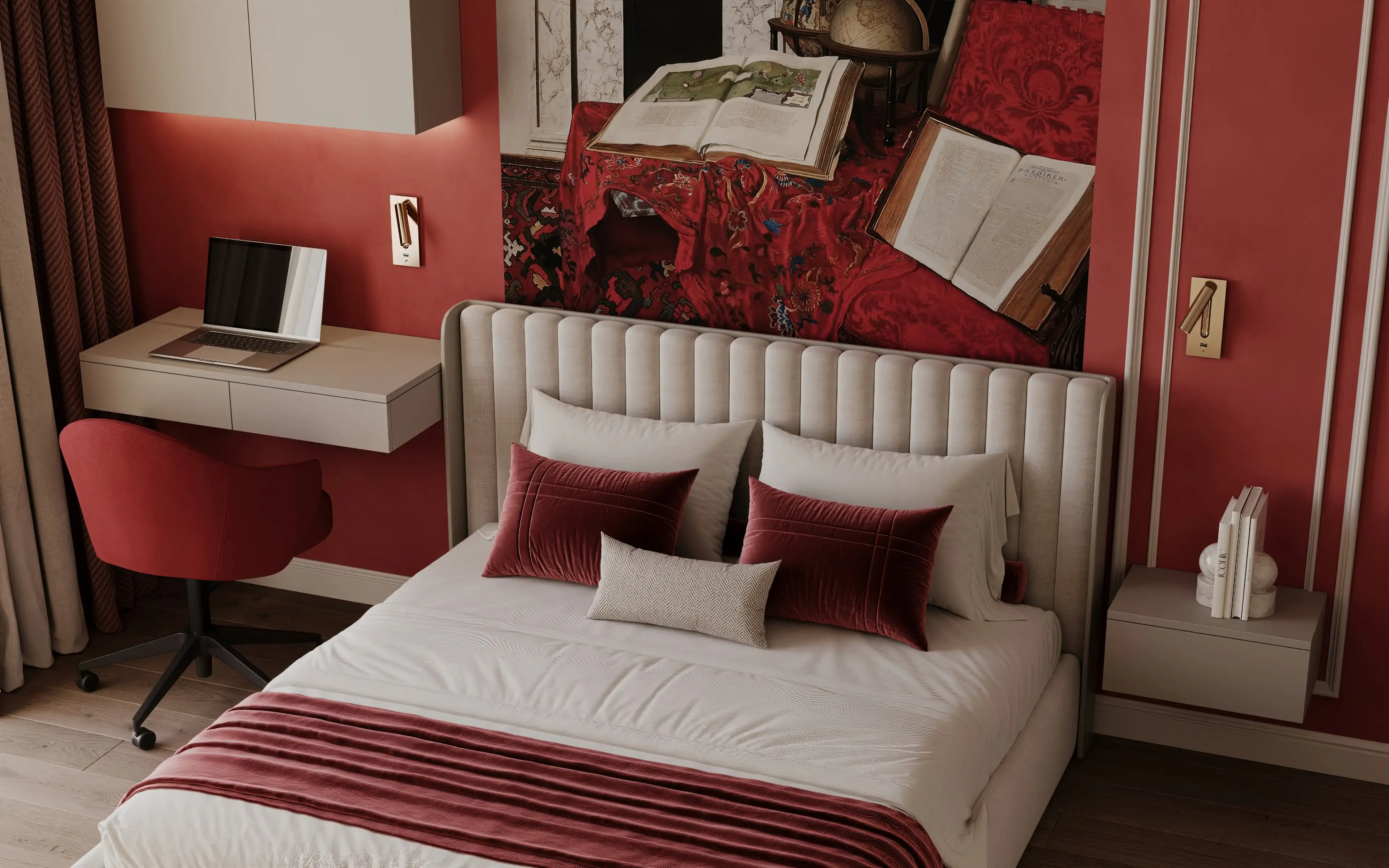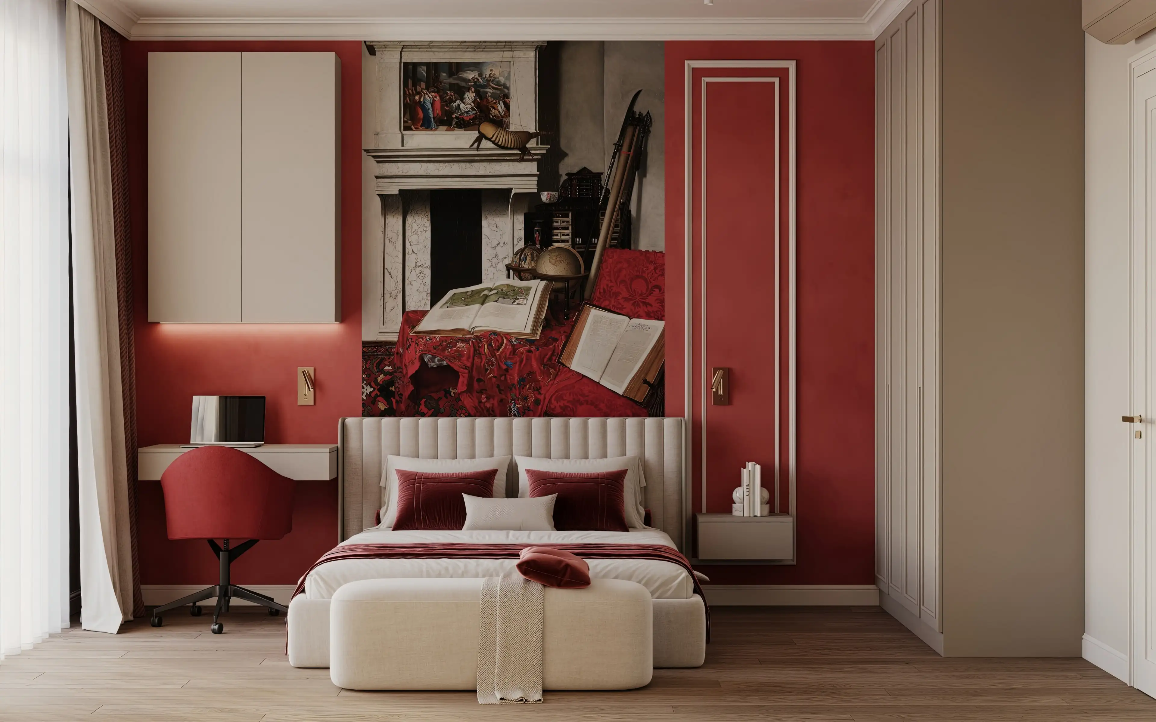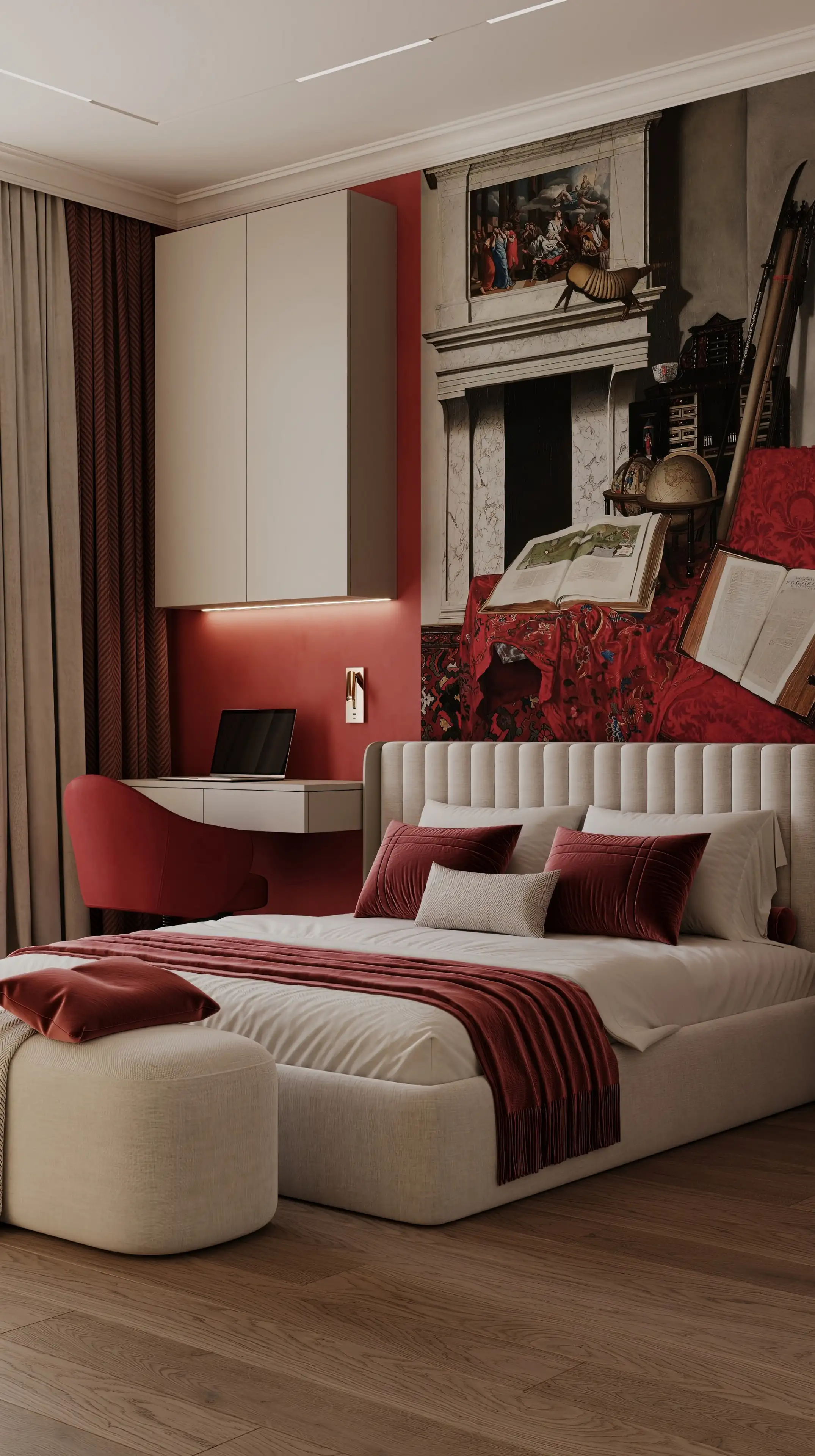 В спальне мы добавили смелые акценты: насыщенная красная стена и выразительная фреска за изголовьем мгновенно преображают пространство. В сочетании с нейтральным фоном красный создаёт интенсивный, но не утомительный контраст, помогая переключиться с рабочего ритма на личное общение.