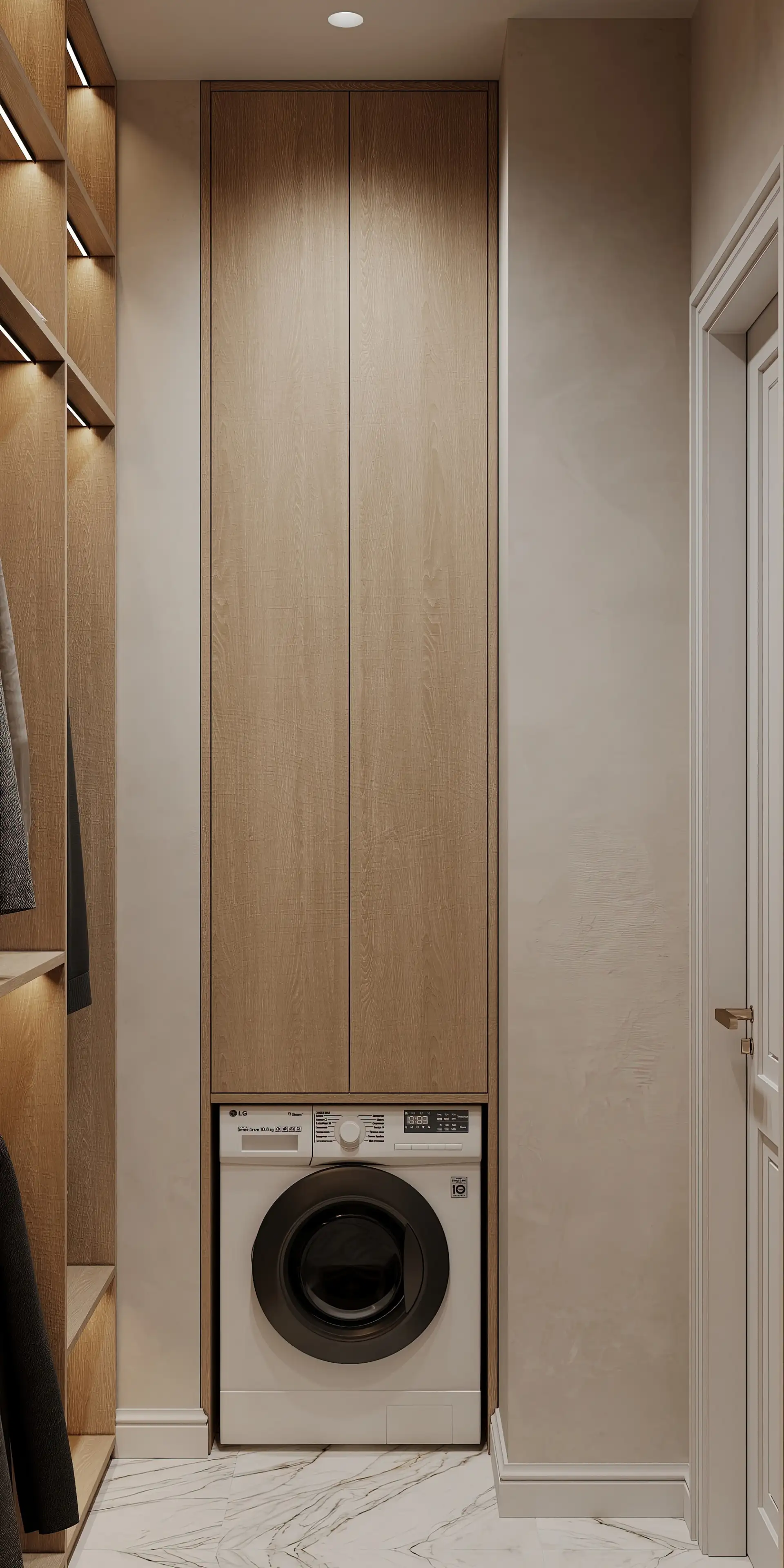 В высокий встроенный шкаф над стиральной машиной можно поместить всё, что нужно, а благодаря лаконичным светлым дверцам он смотрится частью стены. Светодиодная подсветка полочек не греется, не расходует много электроэнергии, но при этом позволяет быстро найти все необходимое.