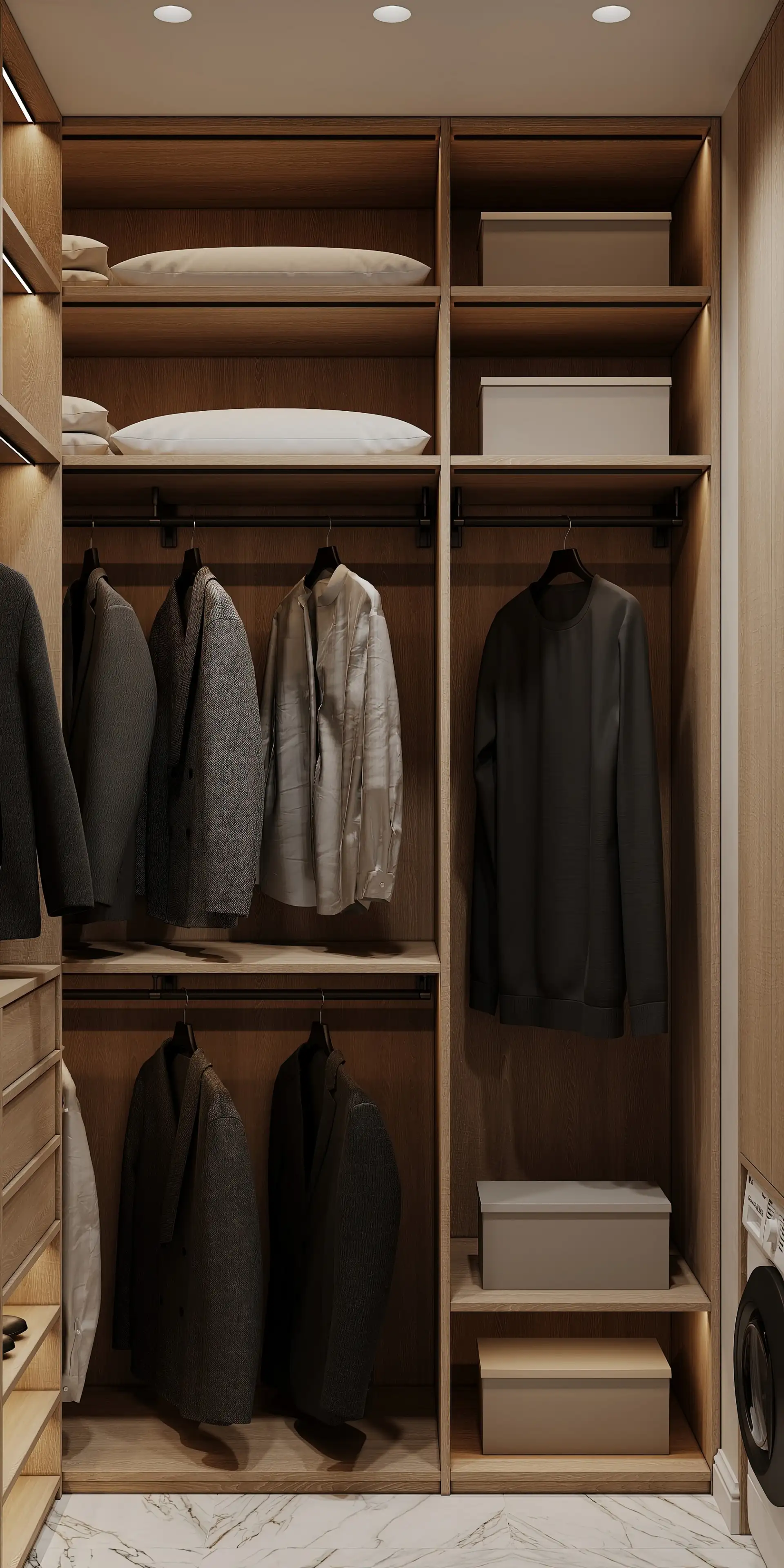 Рядом со спальней мы расположили гардеробную с функцией постирочной Это закрытое и защищенное от пыли пространство, поэтому все полки здесь открытые. Это позволяет сэкономить место и сразу же видеть, где что лежит.