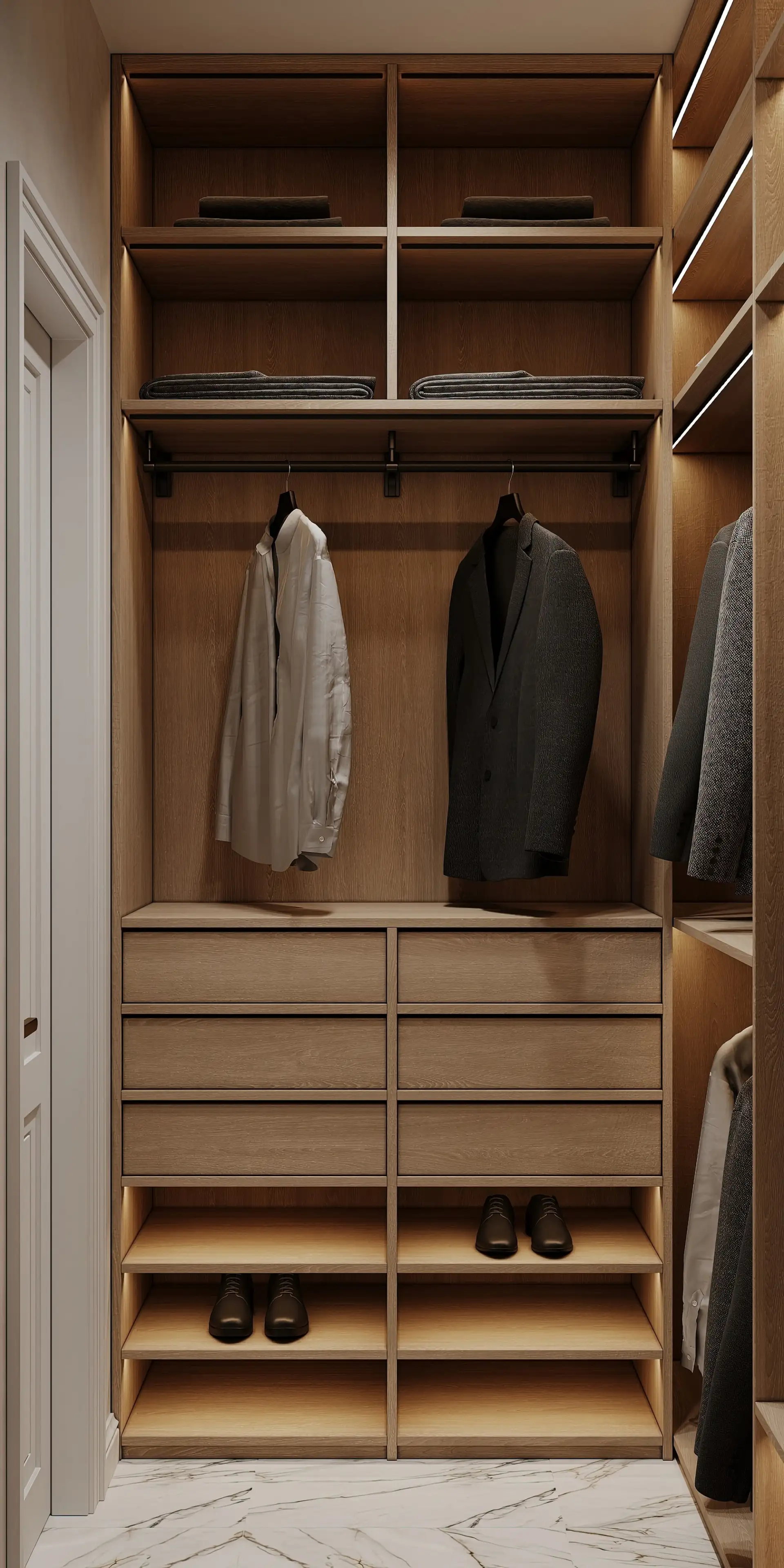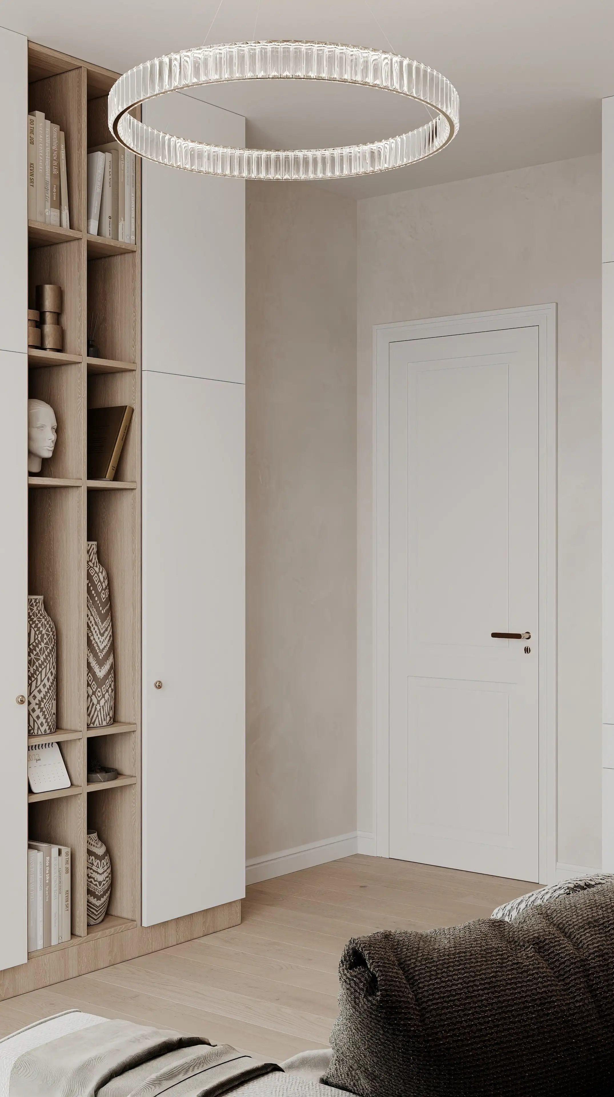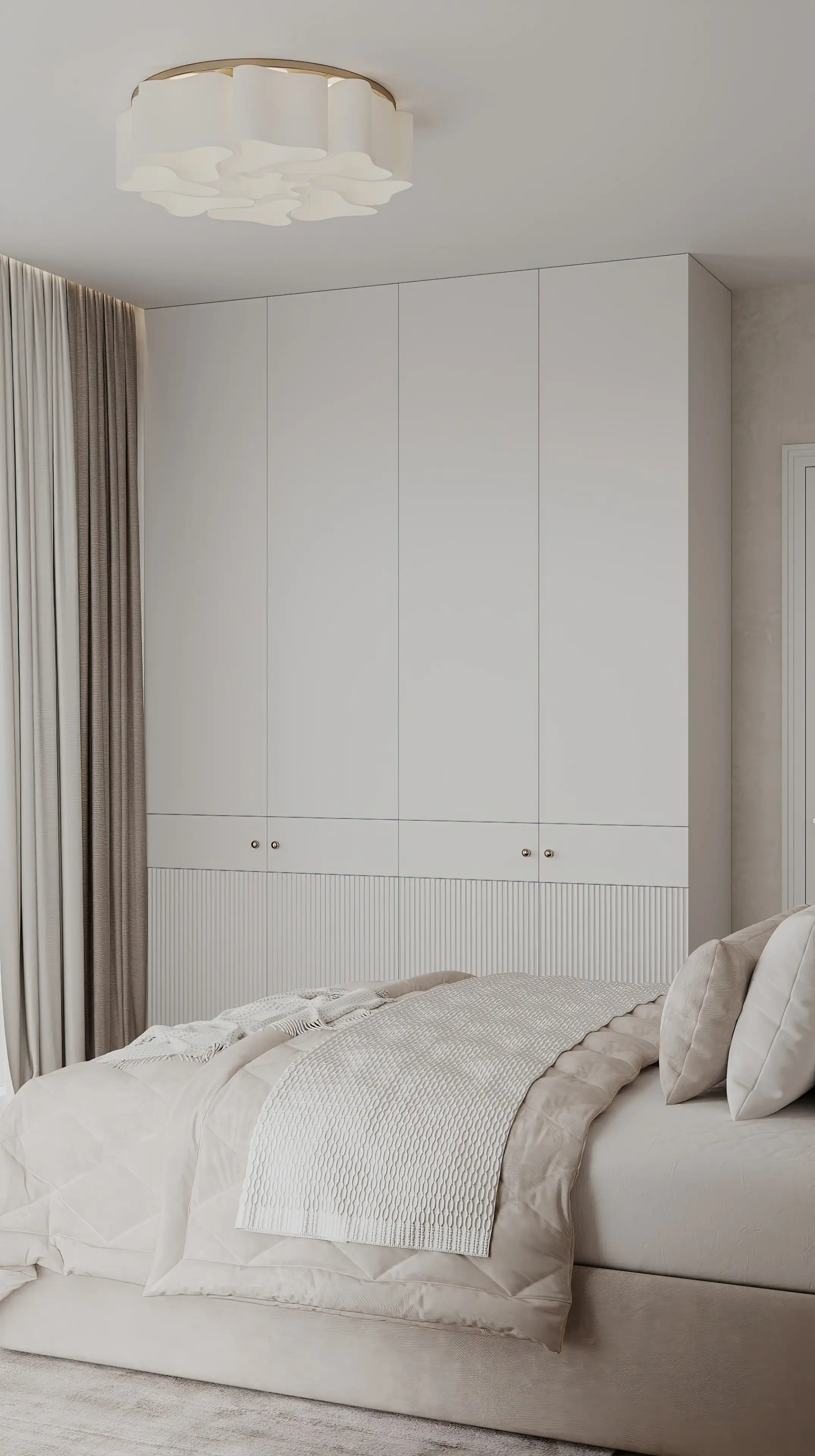 Светлый шкаф до потолка почти сливается со стеной, но рифлёные панели на нижних створках добавляют интерьеру лёгкую динамику. Шкаф не широкий, но его высота позволяет разместить всё необходимое, не загромождая пространство.