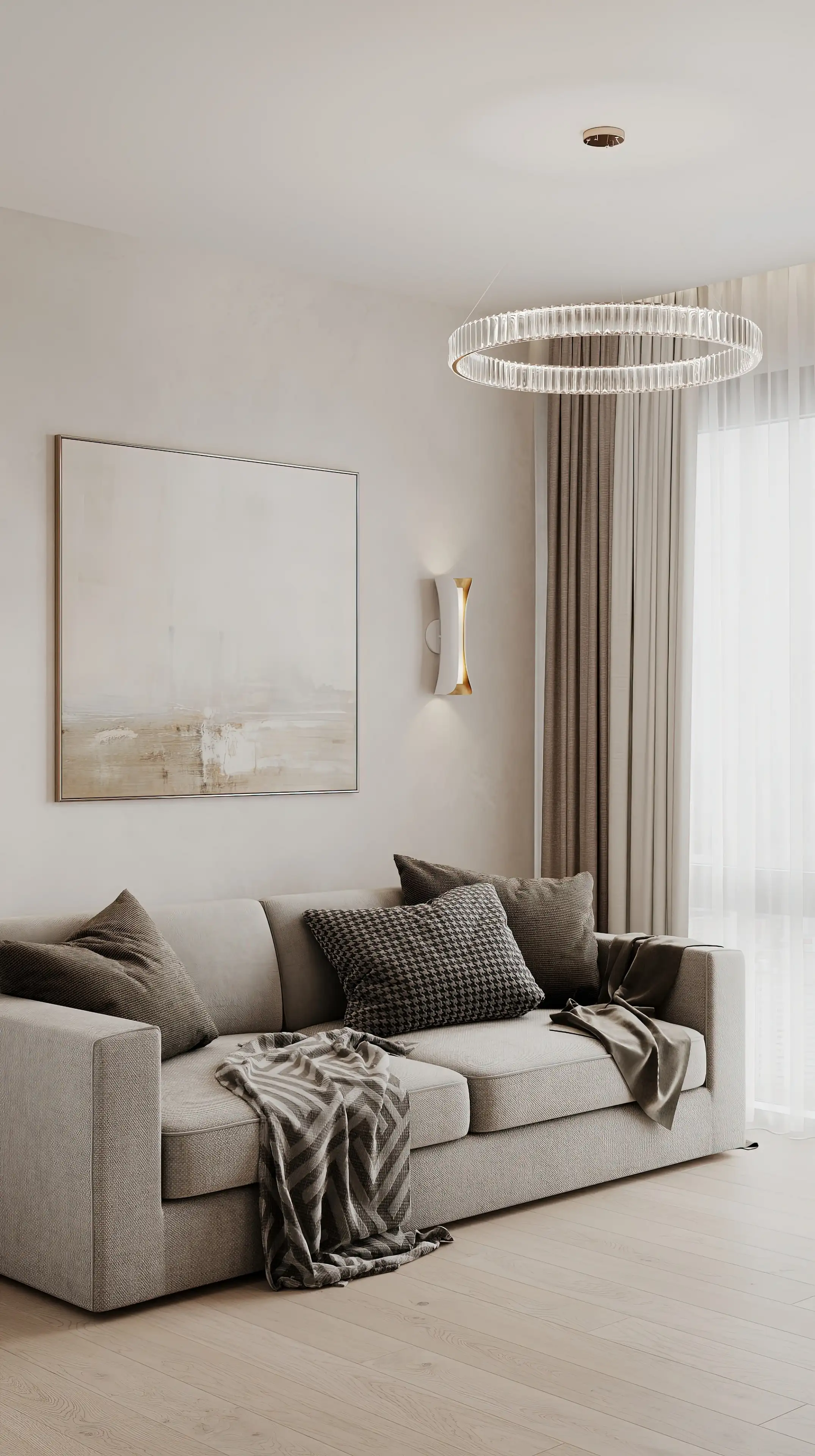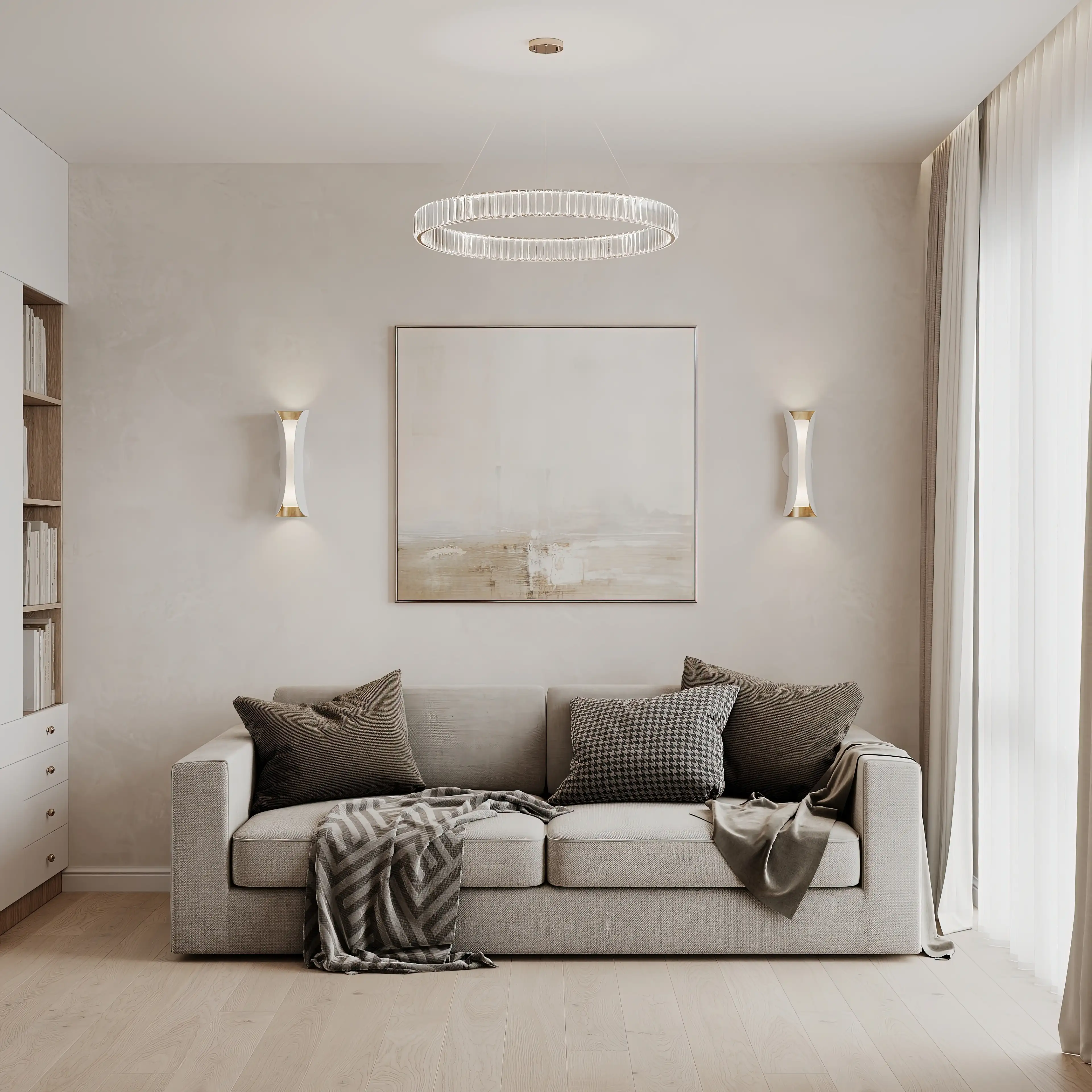 Кабинет мы сделали тоже очень светлым и уютным. Бархатистая обивка дивана приятно контрастирует с гладкостью стен и паркетной доски, а его бежево-серый цвет не бросается в глаза, поэтому пространство выглядит цельным. Большая люстра-кольцо и два вертикальных настенных светильника создают интересный геометрический контраст и позволяют использовать разные сценарии освещения.