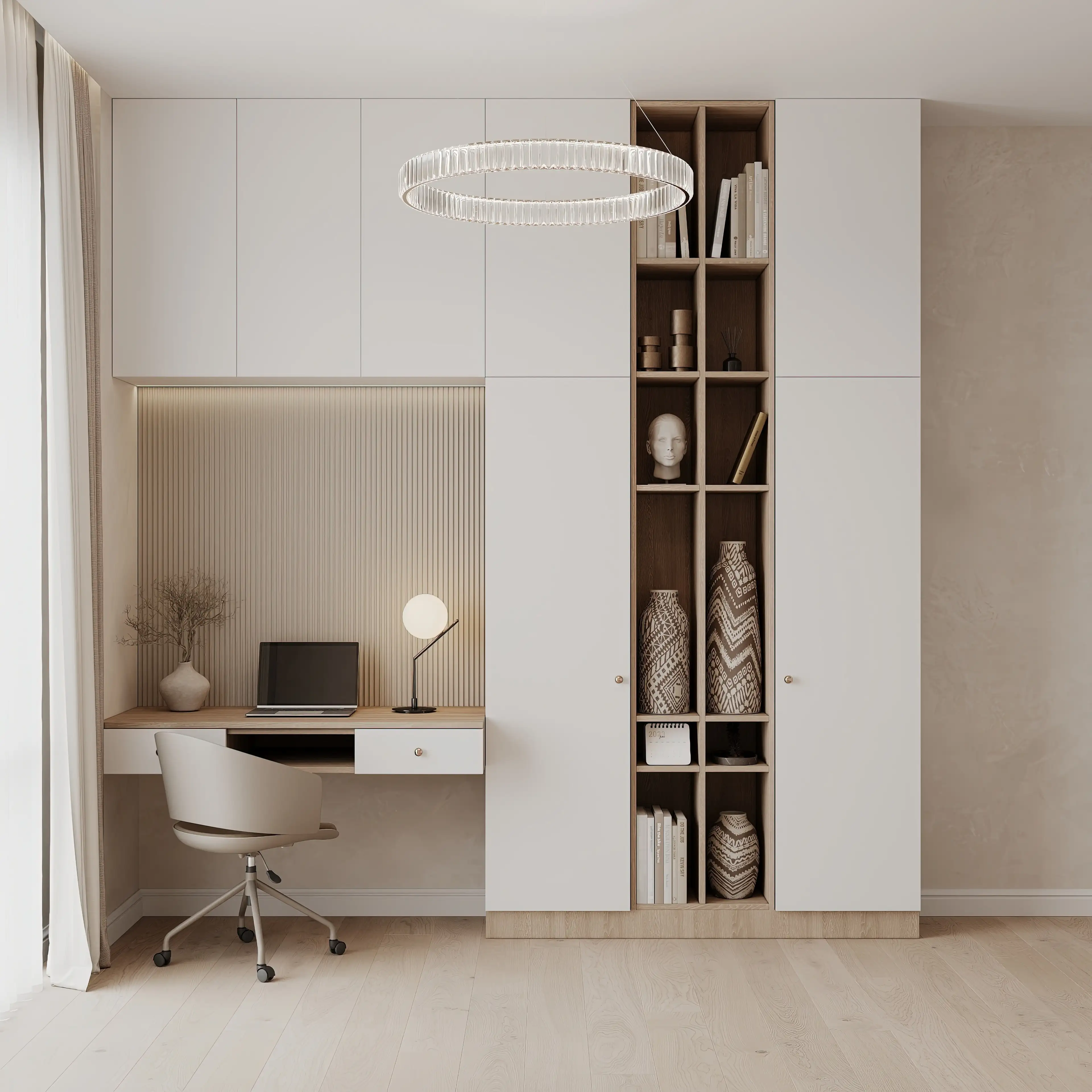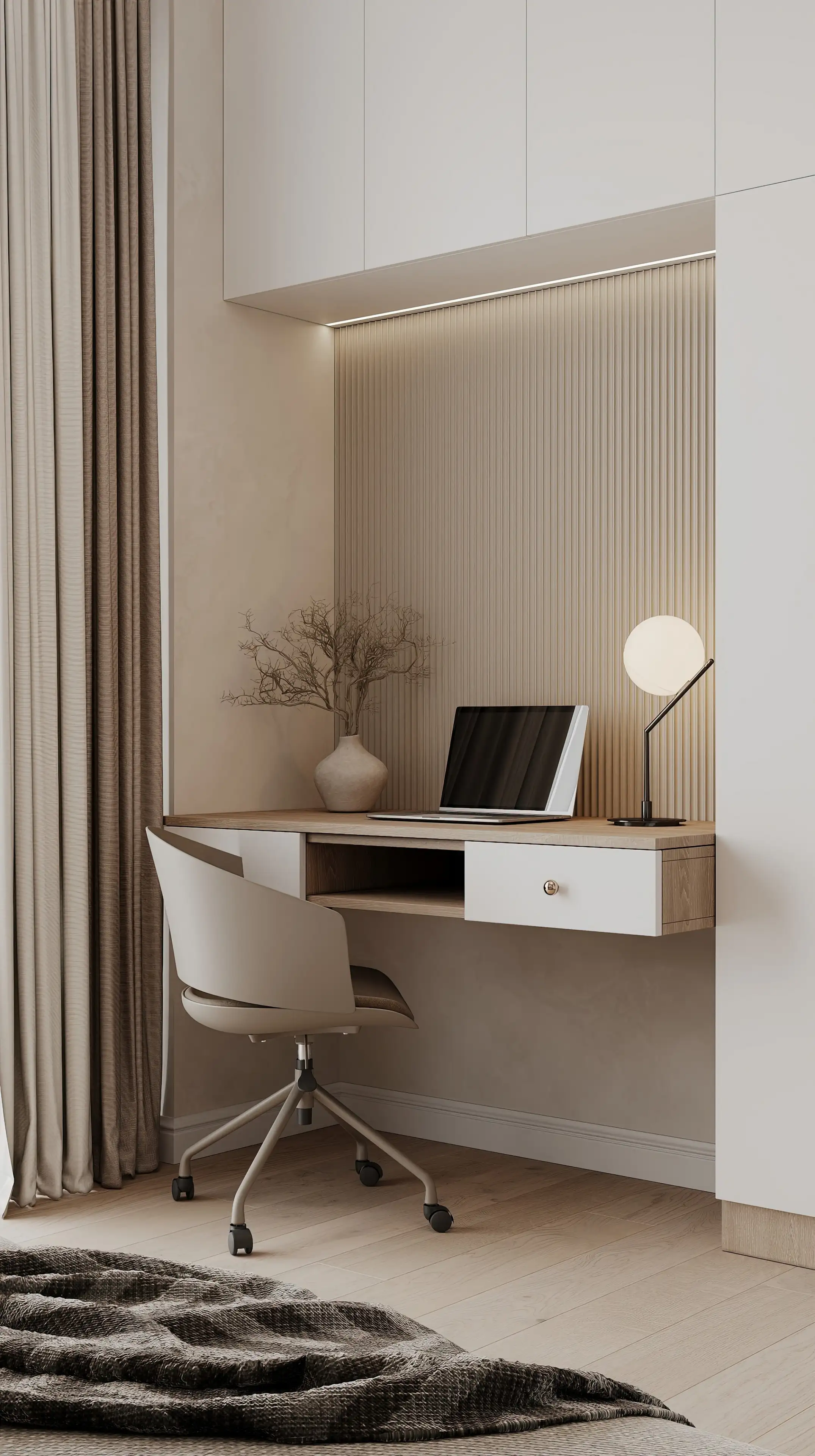 Рабочая зона оборудована в нише встроенного шкафа, поэтому в помещении остается много свободного места. Лаконичные белые дверцы выглядят как часть стены, а гофрированная панель над столом визуально выделяет рабочее место.
