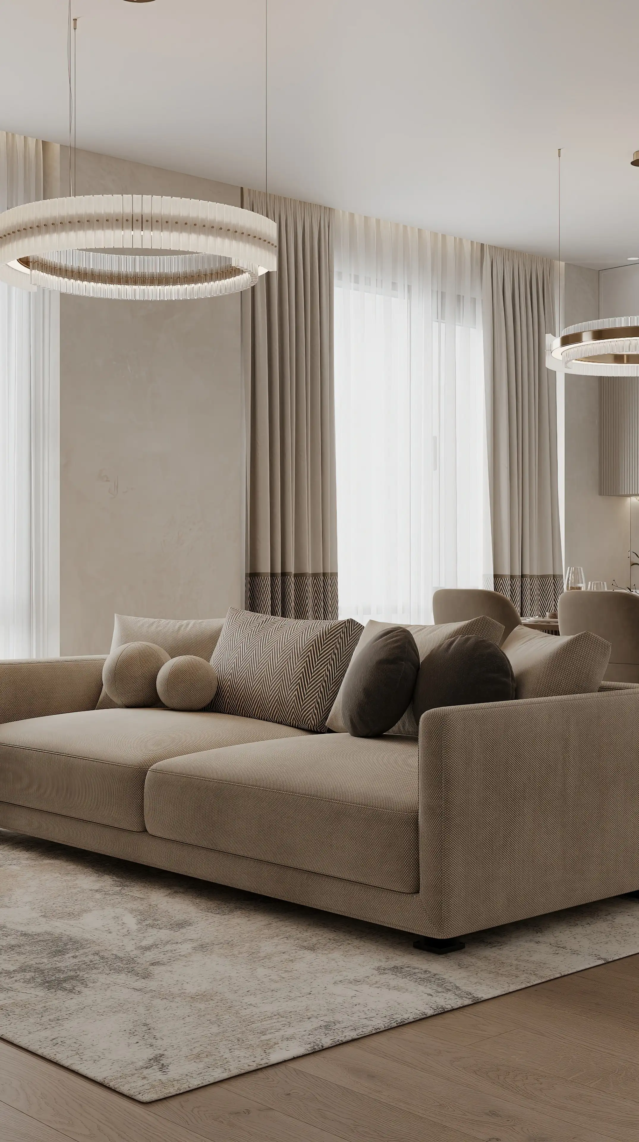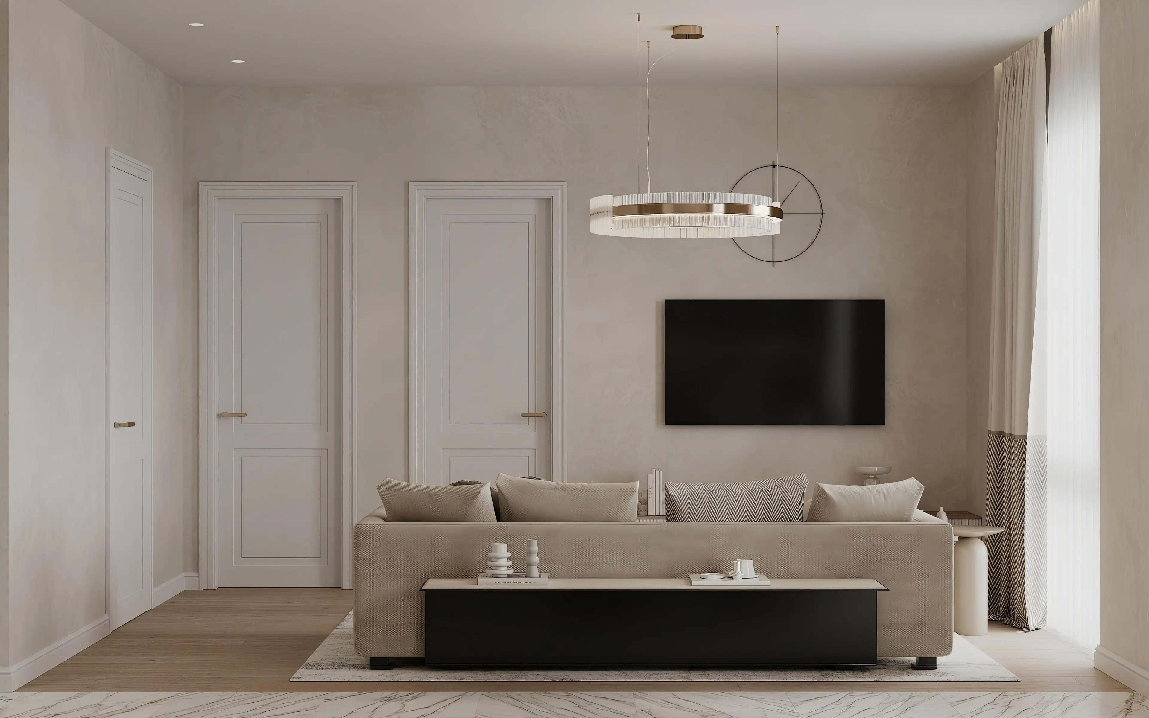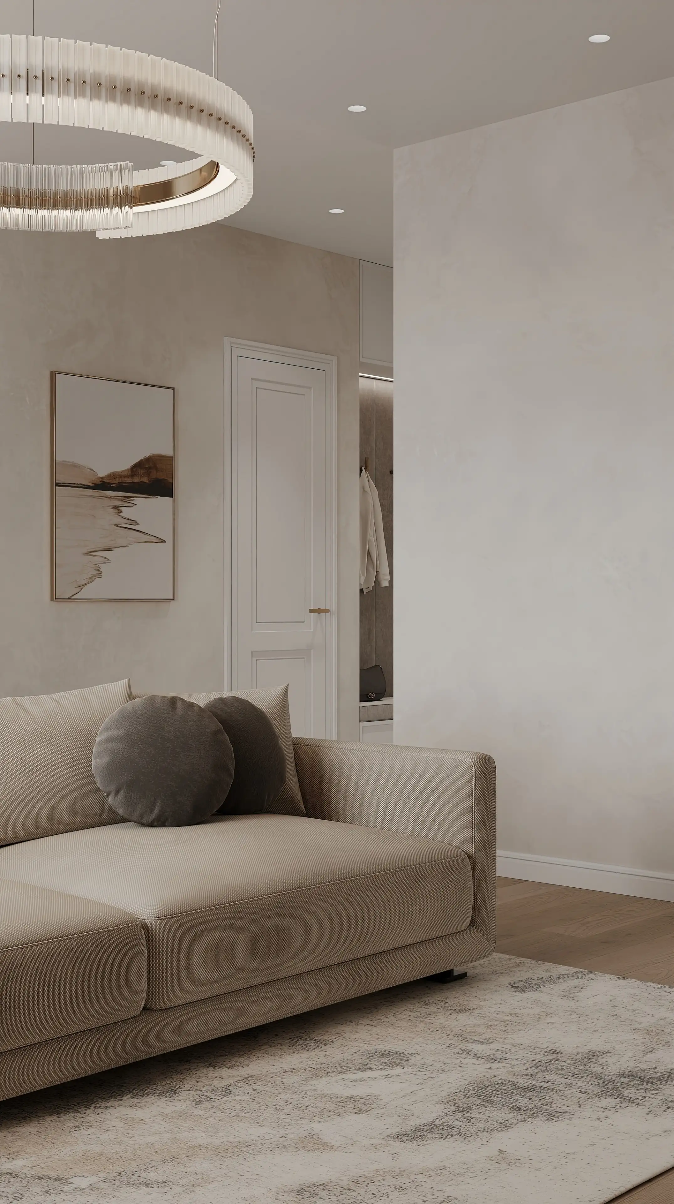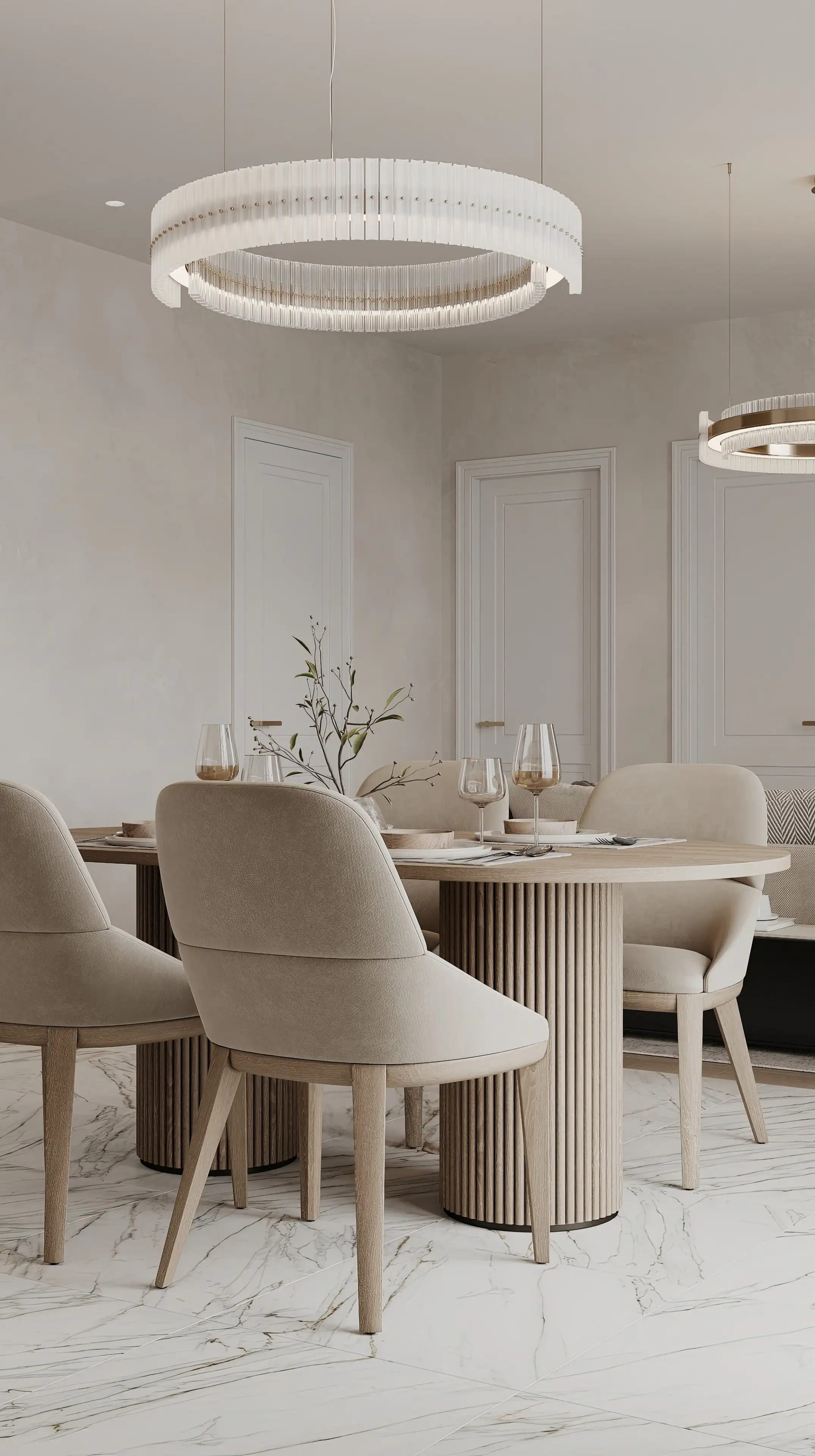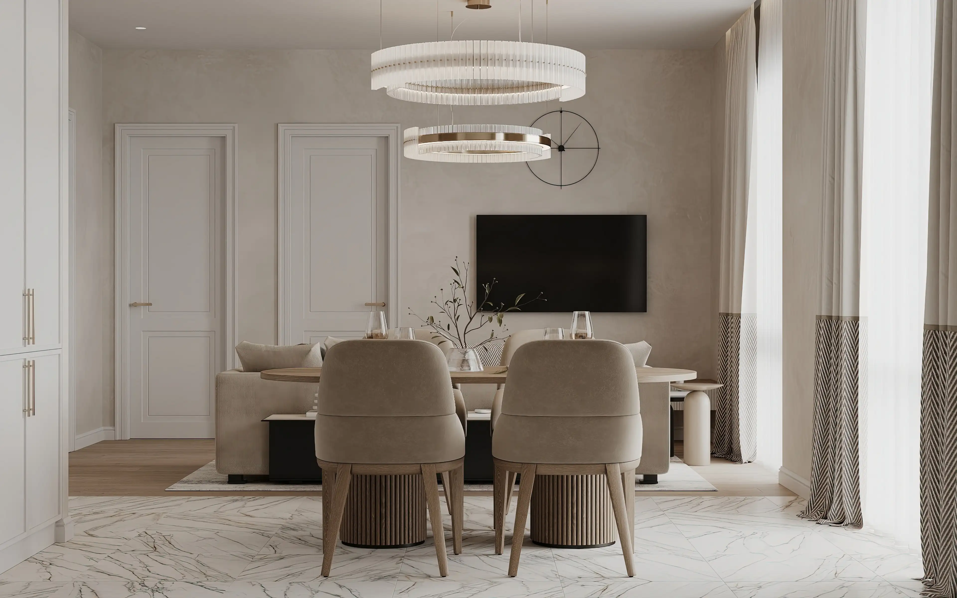 Люстра-кольцо над столом - лаконичный штрих, который завершает композицию. Вторую такую же люстру мы разместили над зоной отдыха. Светлые межкомнатные двери идеальными пропорциями и объёмными молдингами мягко подчёркивают элегантность интерьера, добавляя ему благородство без излишней тяжести.