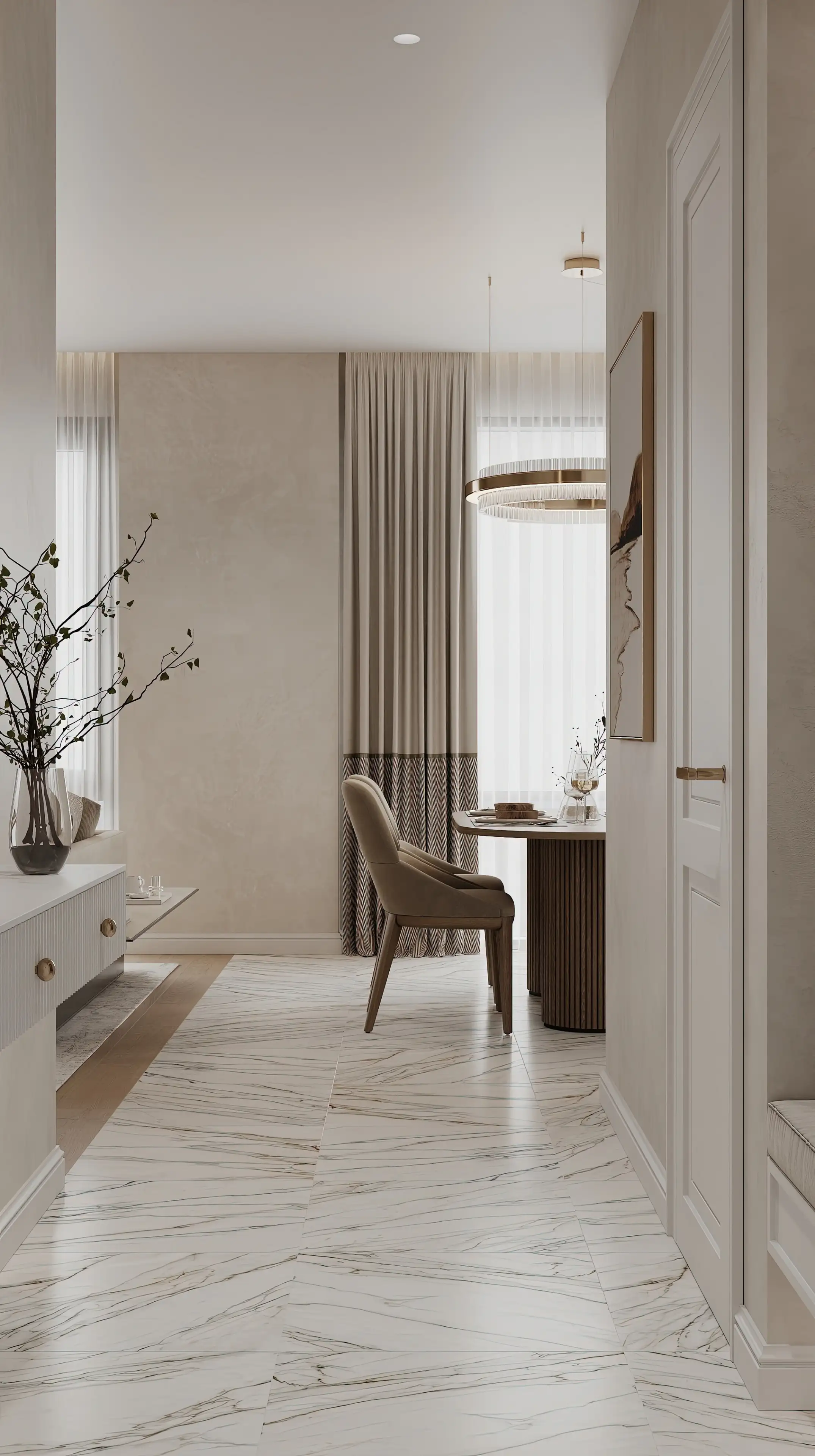 Белый керамогранит с серыми мраморными прожилками стелется единым полотном от входной двери до окон гостиной. Такой приём стирает границы между помещениями, а переход из прихожей в гостиную становится естественным и незаметным, усиливая впечатление цельности интерьера.