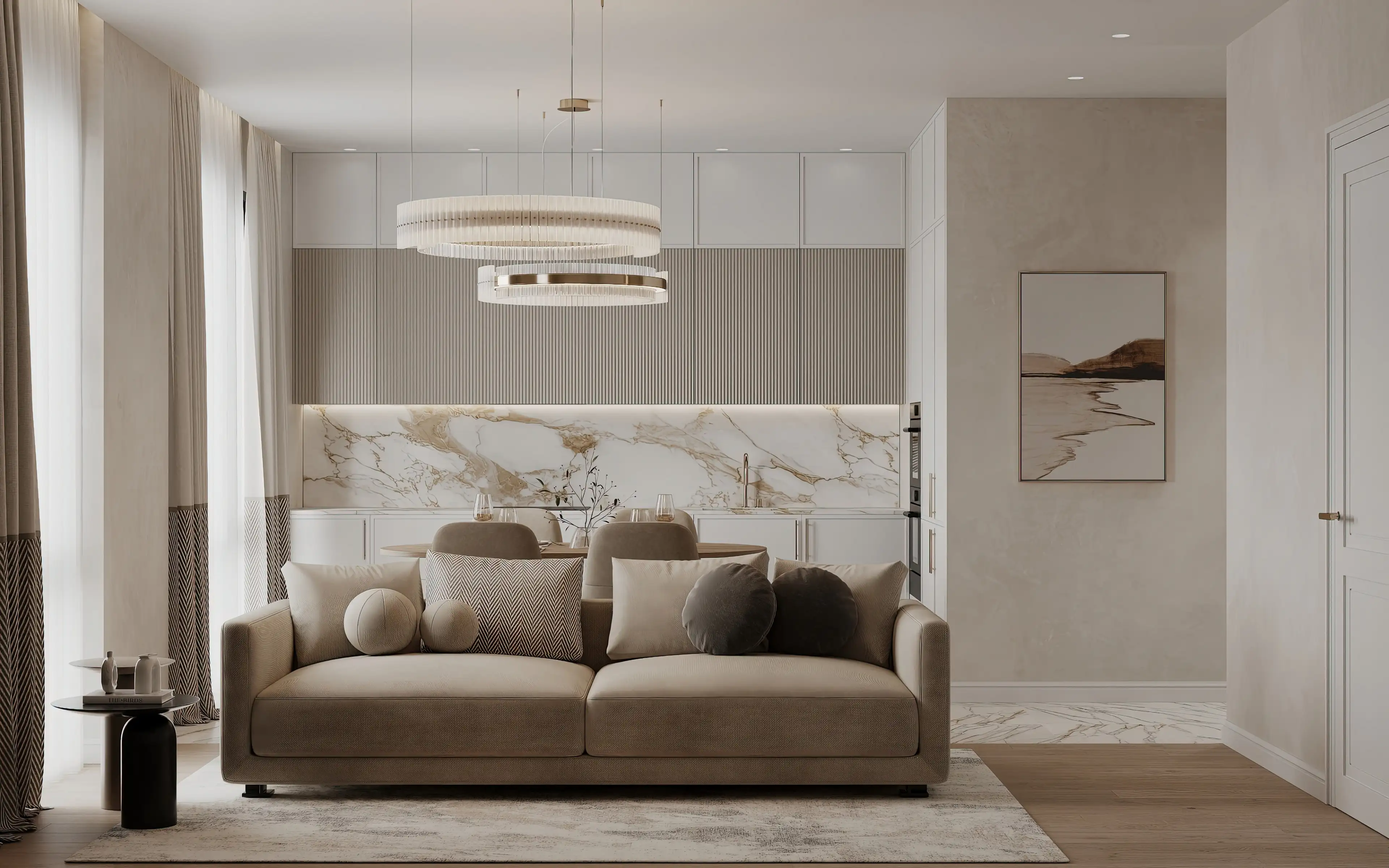 Бежевый диван при необходимости легко раскладывается, обеспечивая комфортное спальное место. Коврик с мраморным рисунком в тон кухонному керамограниту объединяет пространство в гармоничный ансамбль. За диваном мы расположили удобный столик для мелочей, а на стену повесили картину-пейзаж в схожей цветовой гамме.