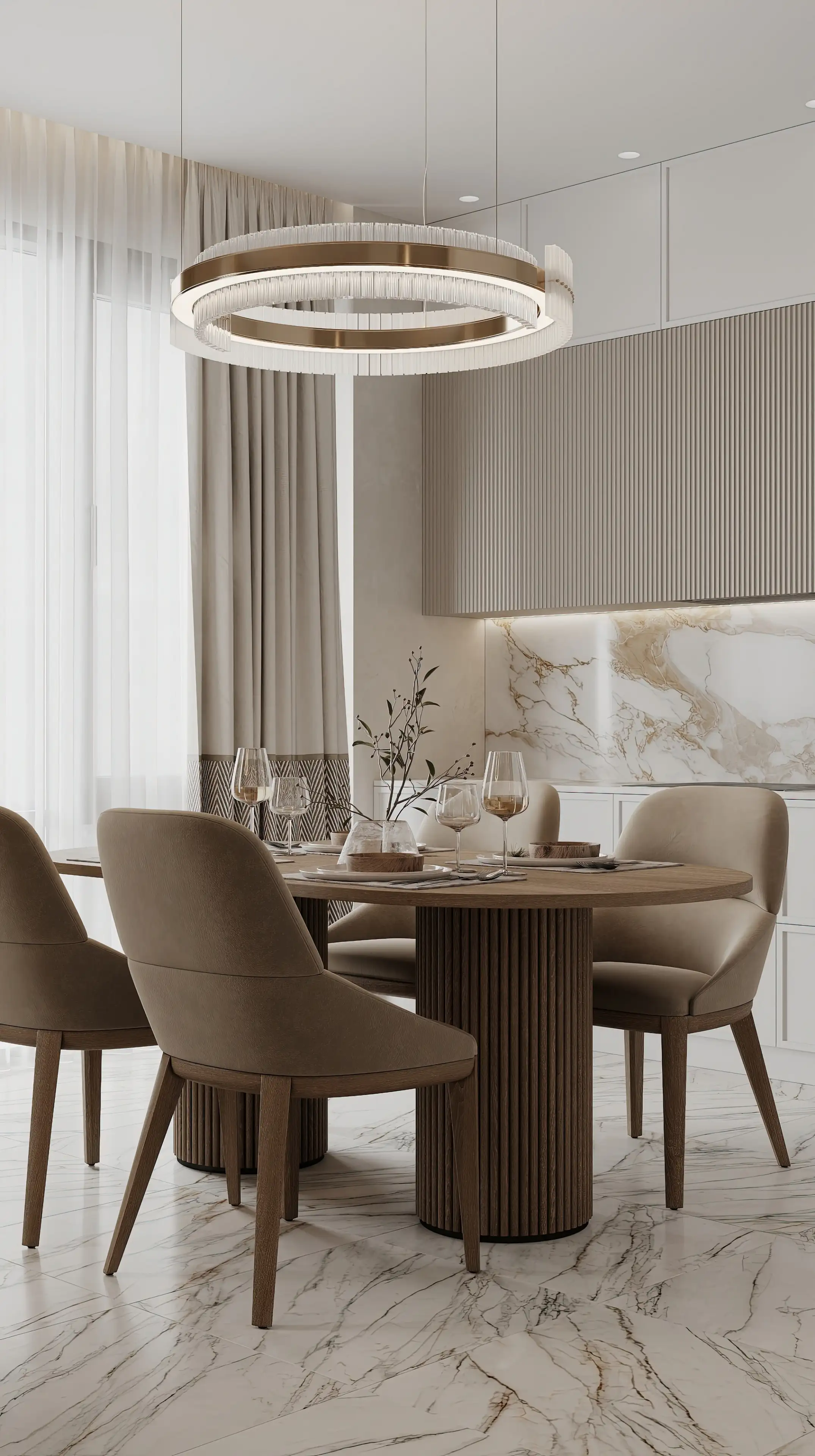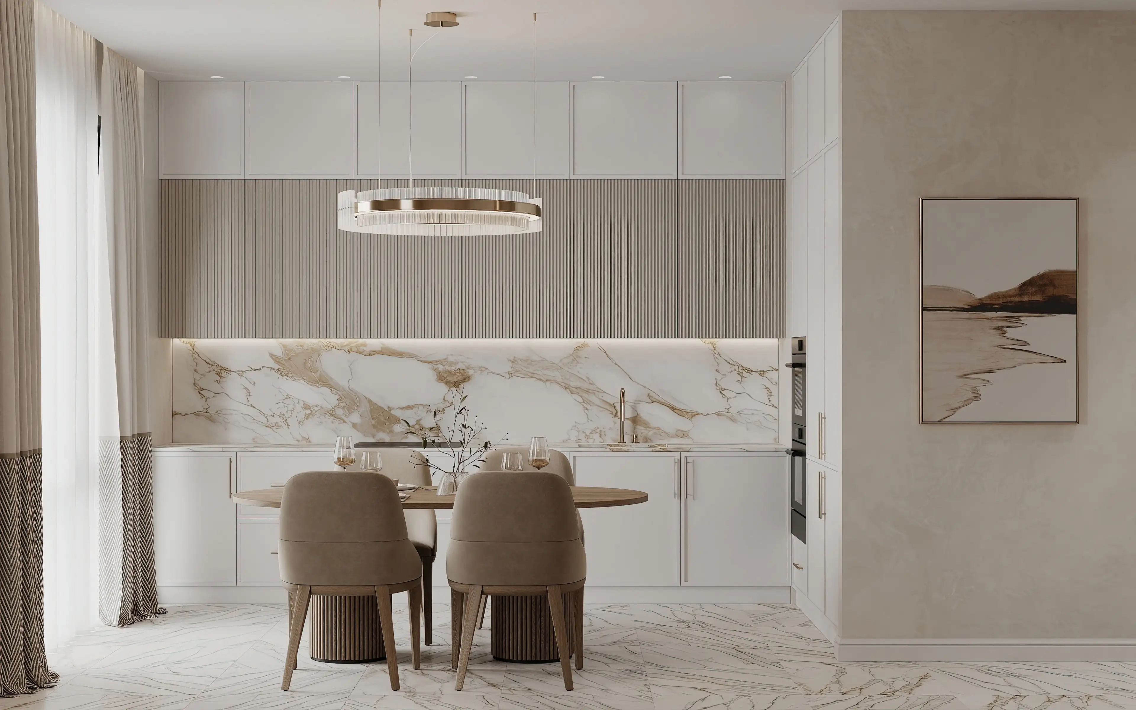 Кухня собрана на ненавязчивых контрастах: внизу — гладкие белые фасады, вверху – рифлёные шкафы серо-бежевого цвета. Никаких ручек — только аккуратные выемки, чтобы ничто не нарушало чистоту линий. Фартук из мраморной плиты с верхней подсветкой кажется продолжением стены.