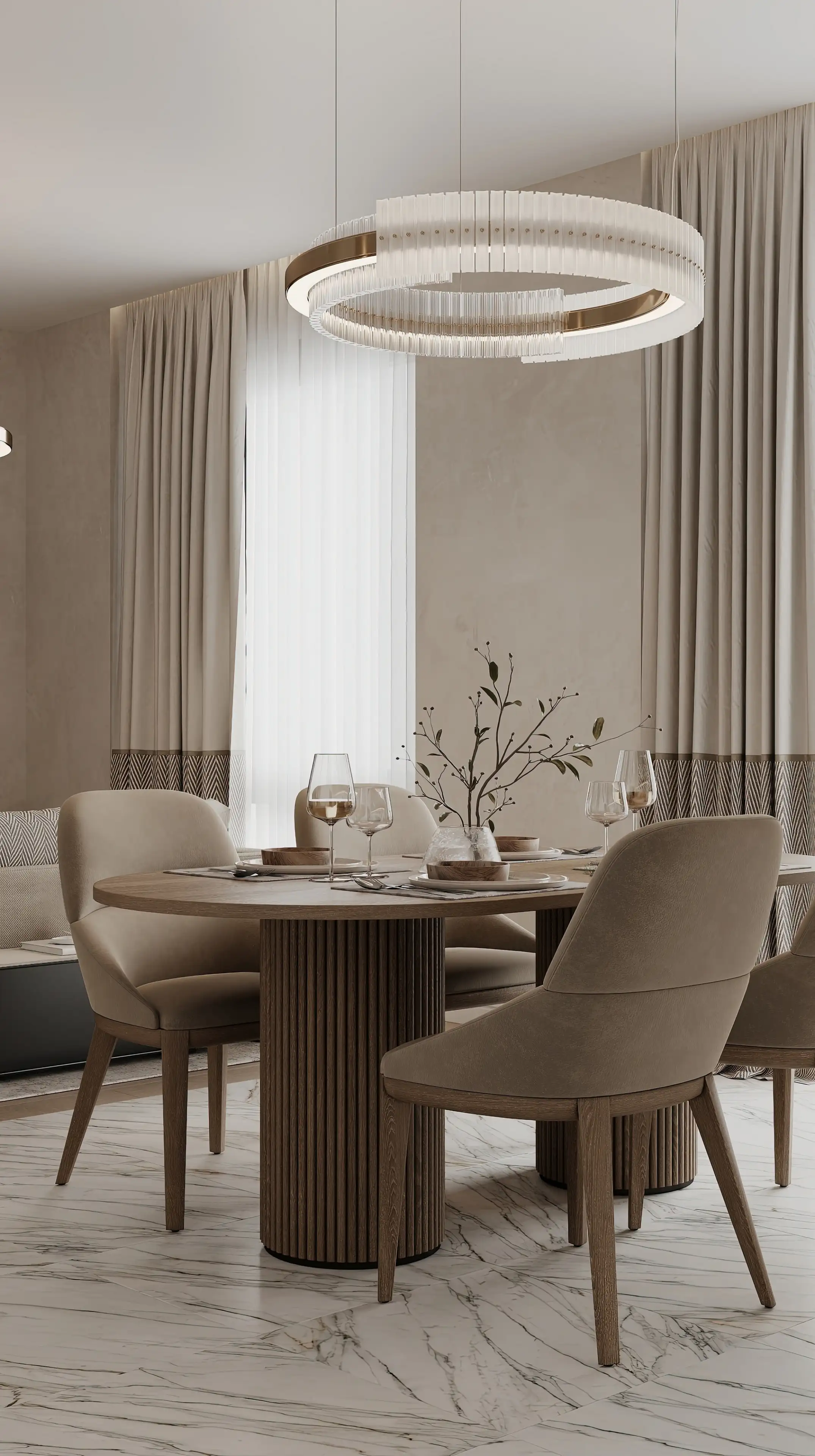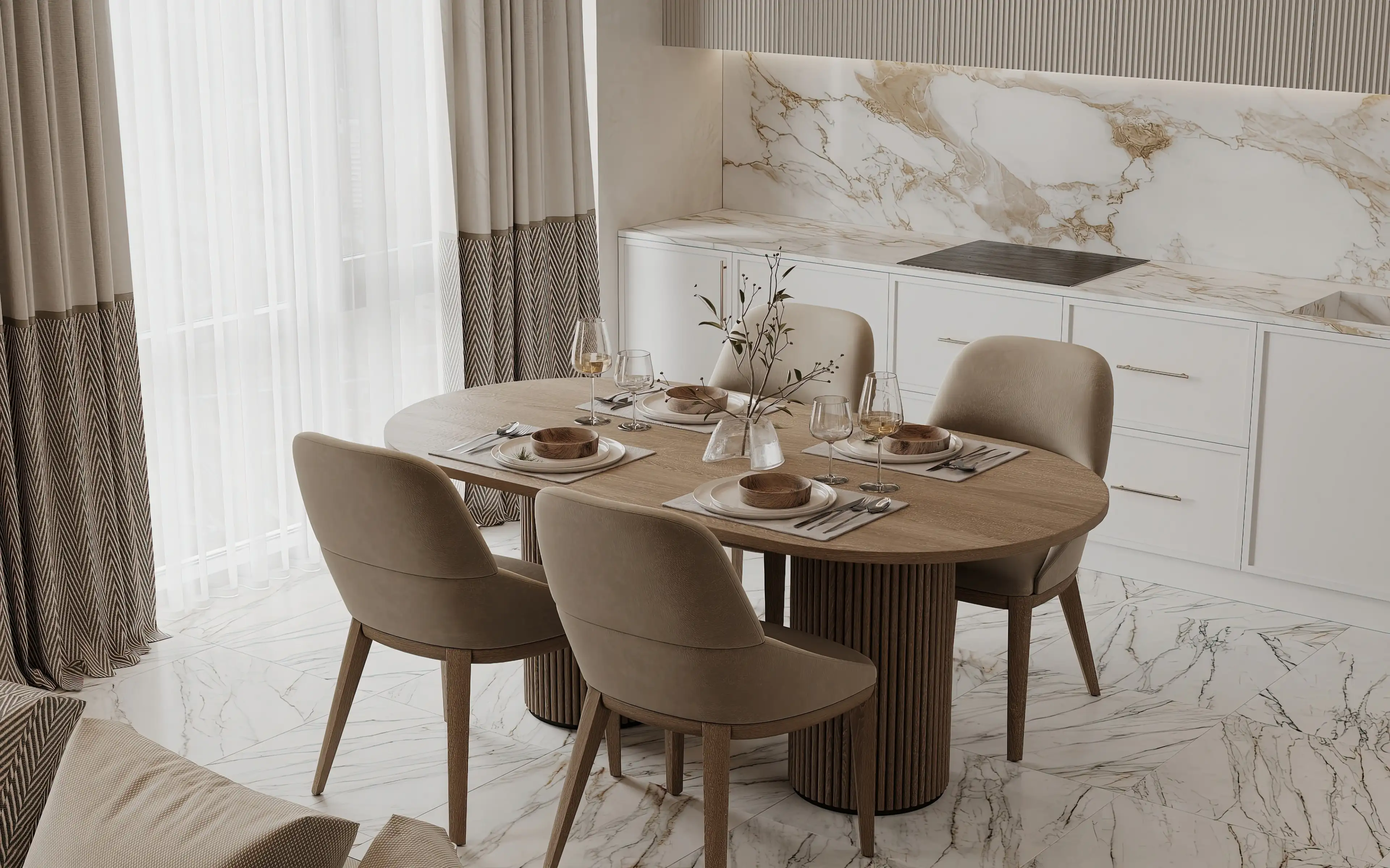 Обеденная группа — овальный стол и мягкие стулья — создаёт камерную и уютную атмосферу. Столешница органично вписывается в общую эстетику: её плавные формы визуально смягчают геометрию пространства, а древесная фактура добавляет интерьеру тепло.