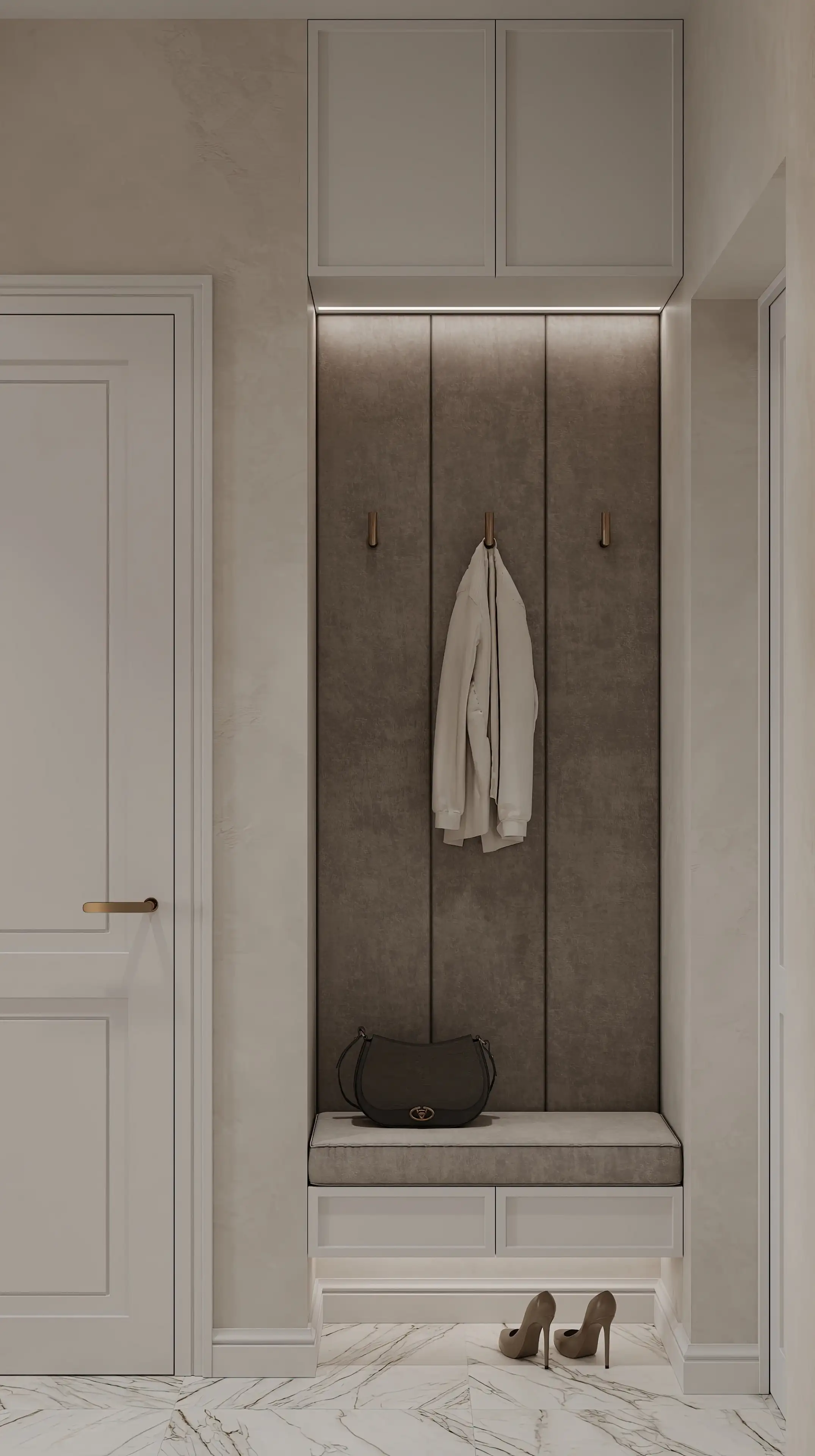 Уютный пуфик с серой обивкой расположен в нише, которая одновременно является вешалкой для верхней одежды. Под пуфиком мы разместили практичные ящики и нишу с подсветкой для обуви, а для хранения сезонных вещей предусмотрели антресоль, которая благодаря светлым дверцам совсем не бросается в глаза.