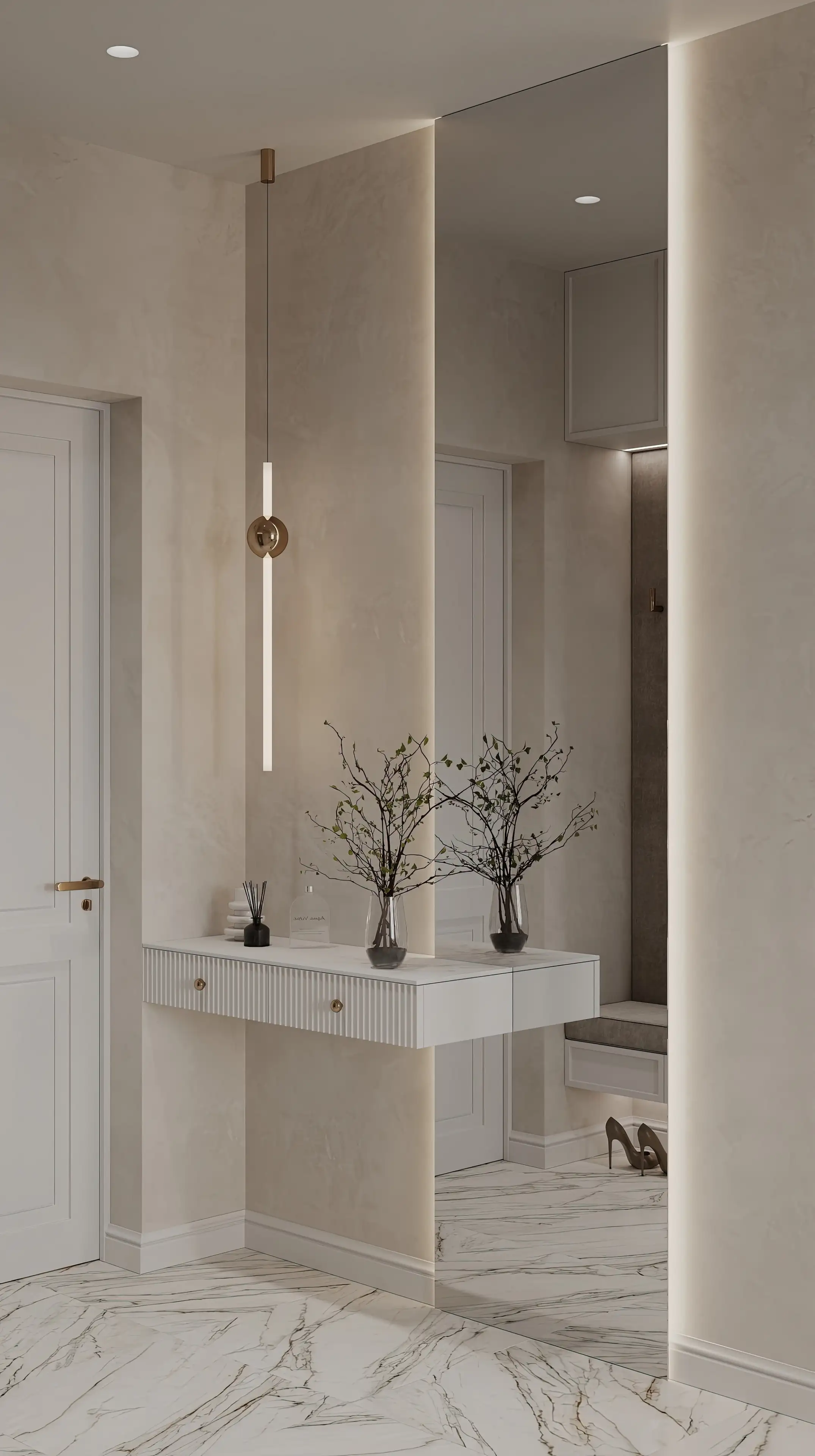 Высокое зеркало визуально удваивает пространство — коридор сразу кажется больше и светлее. Для ключей и других мелочей предназначена изящная парящая тумба с дизайнерским светильником, которая совсем не занимает места.