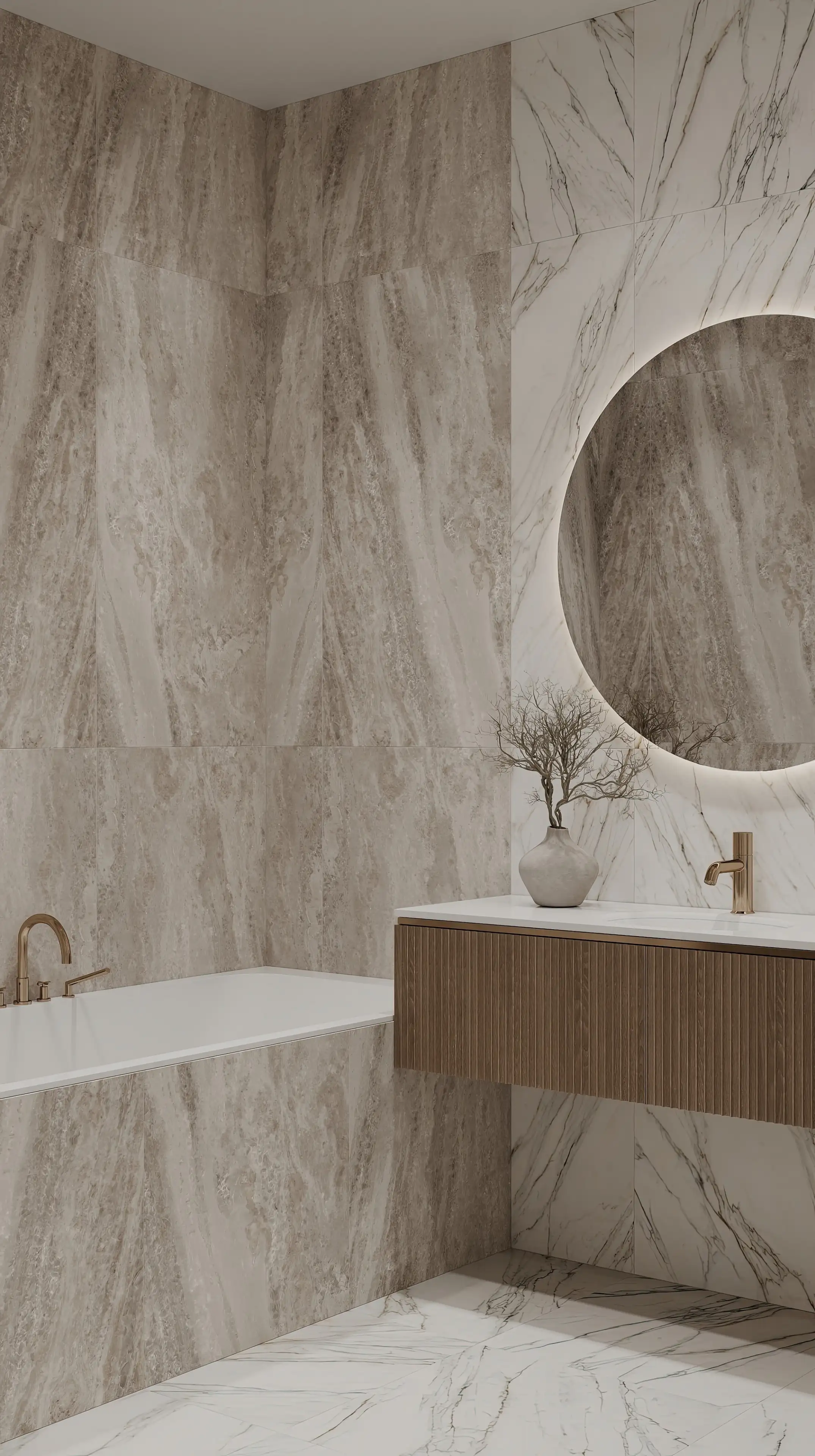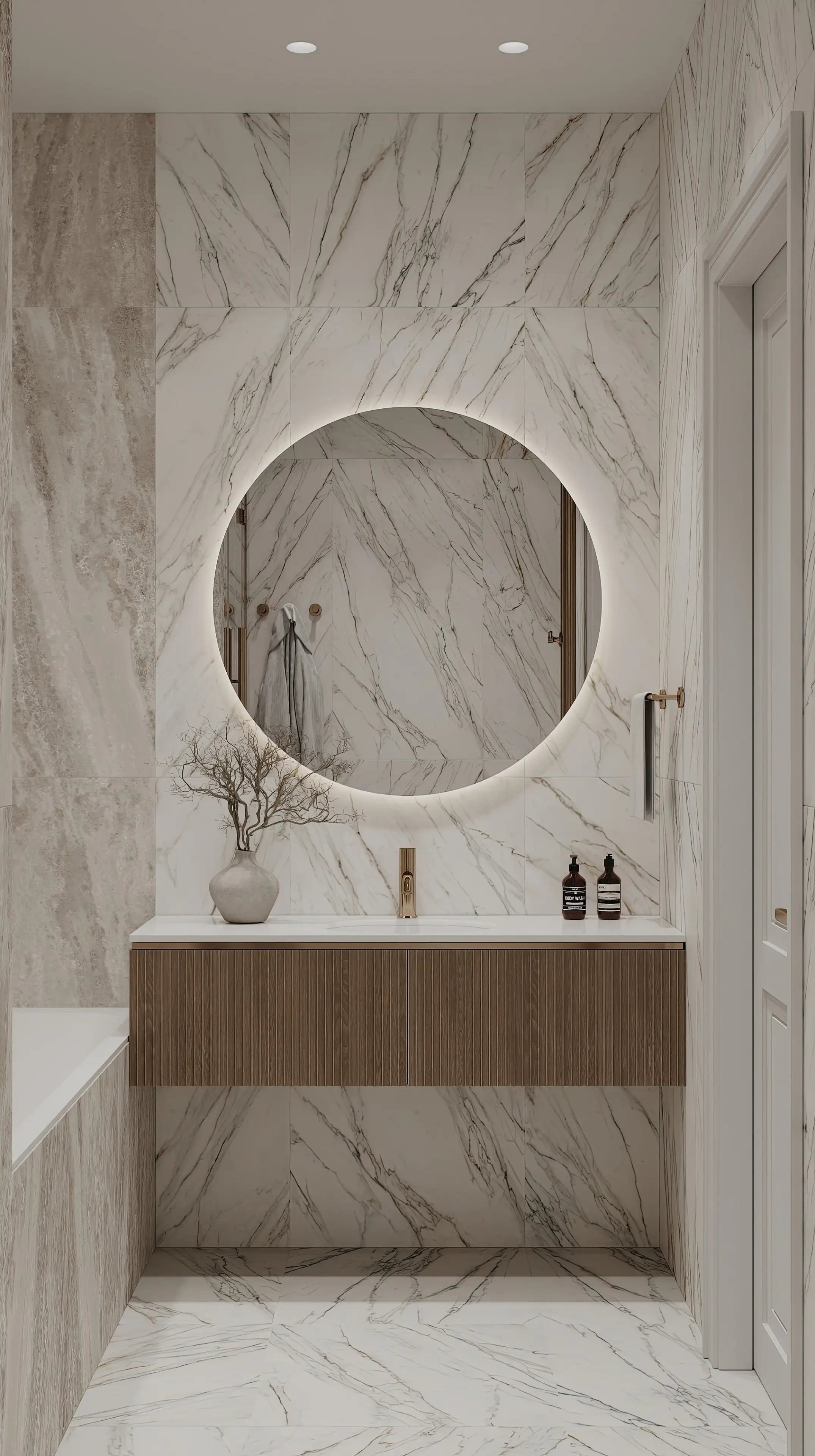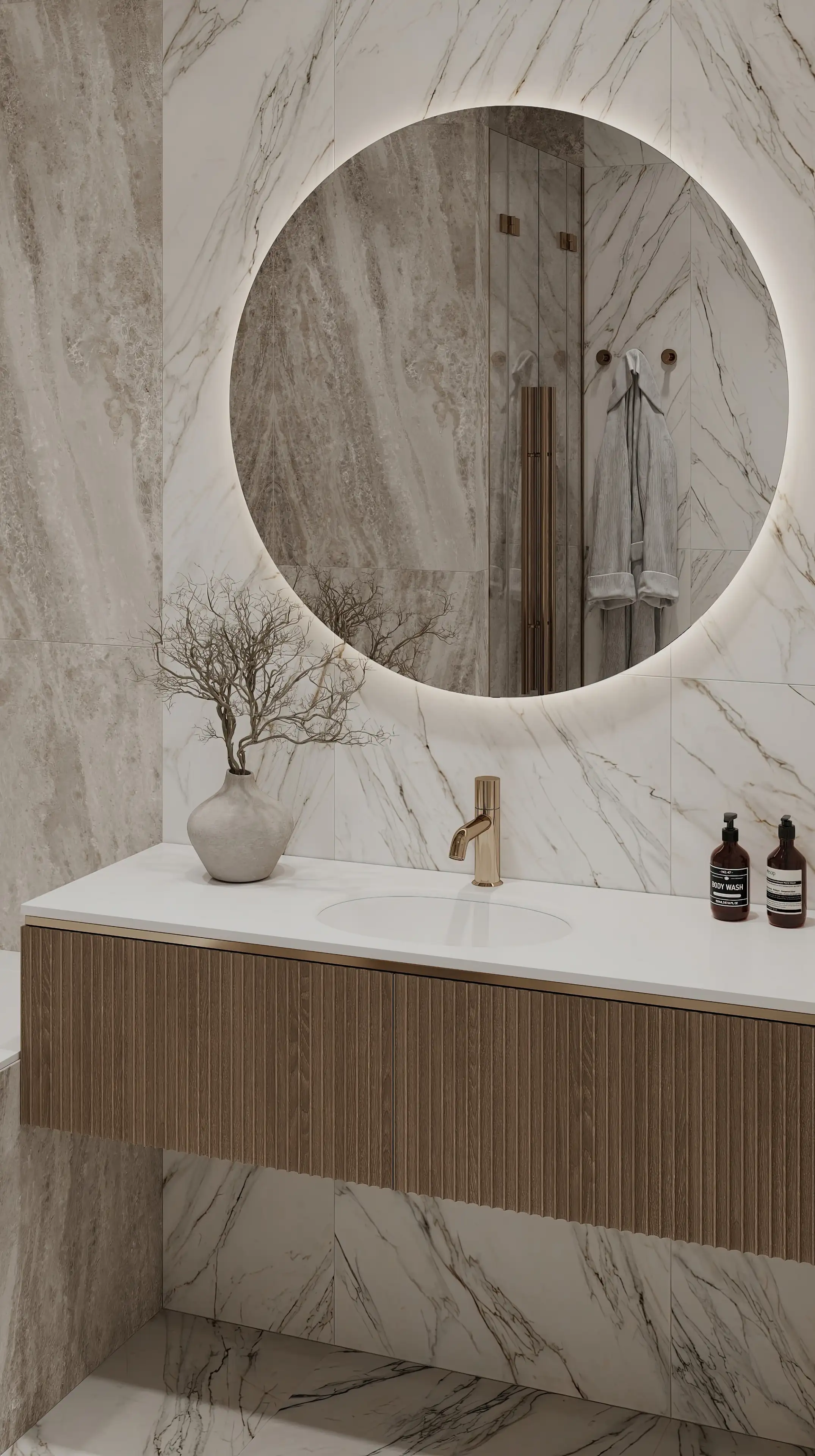 Ванную мы оформили белым керамогранитом с серо-бежевыми прожилками. Большое круглое зеркало со светодиодной подсветкой — стильный акцент, который перекликается с люстрами в жилых помещениях, поддерживая общую стилистику интерьера квартиры.
