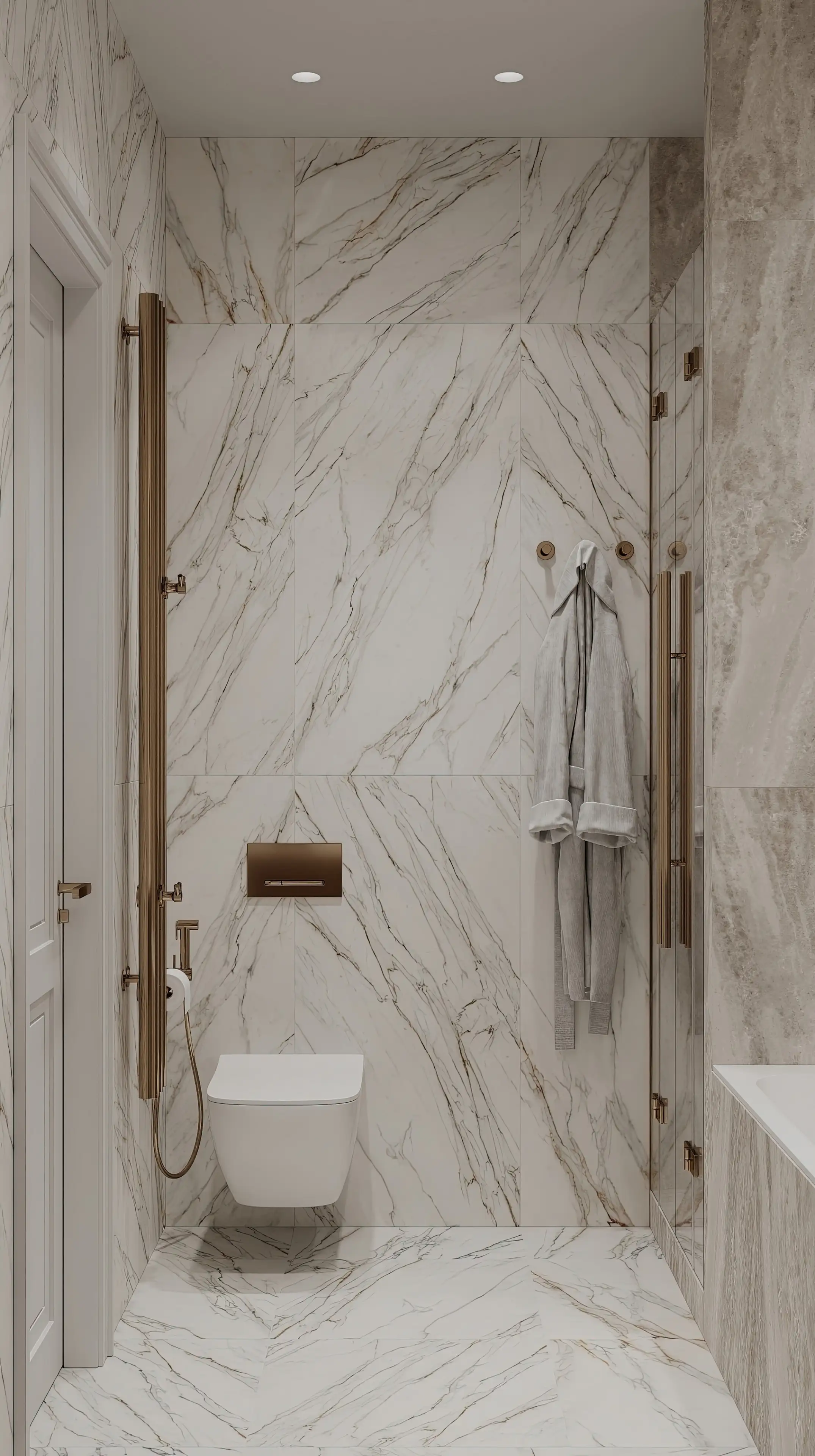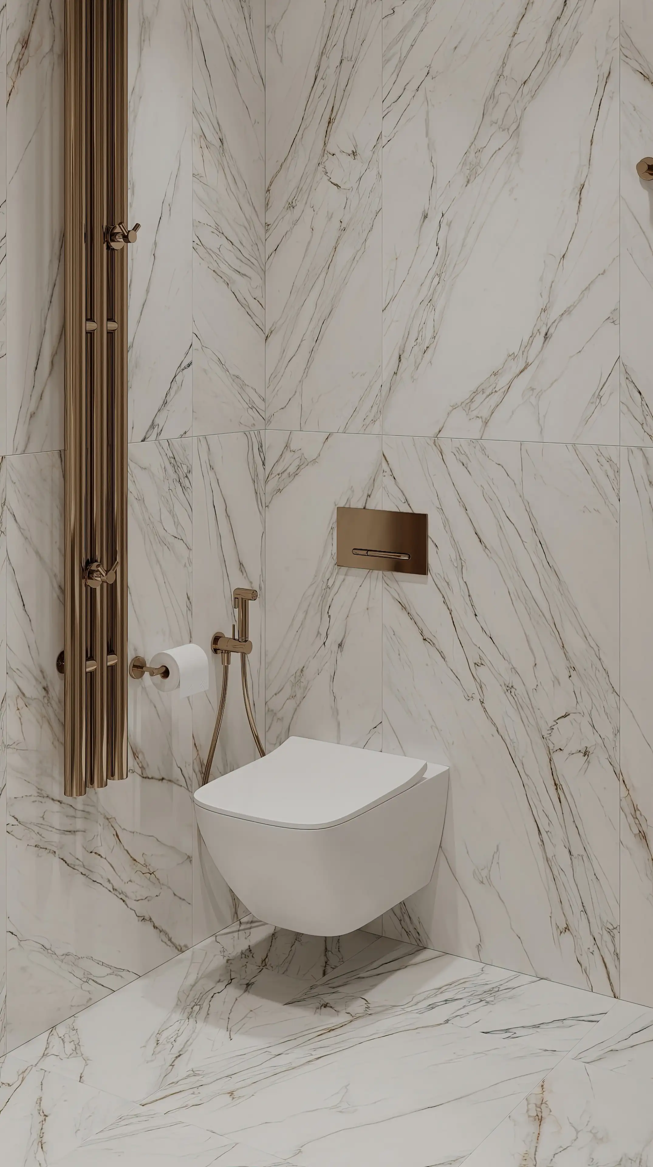 Электрический полотенцесушитель и инсталляция над унитазом в отделке под матовое золото добавляют санузлу ненавязчивый лоск. В сочетании со светлой мраморной плиткой это выглядит современно и изящно.