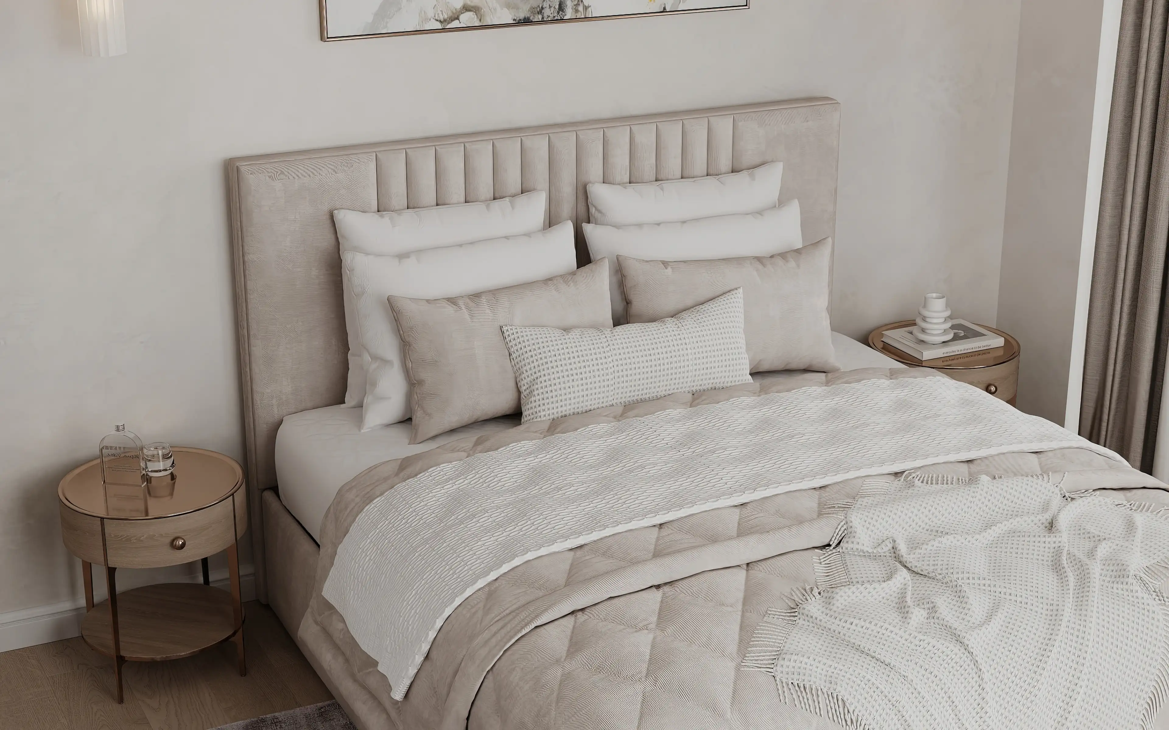 Чтобы смягчить геометричность прямых линий, мы решили использовать круглые прикроватные тумбочки. Каждая из тумбочек имеет ящик для мелочей и удобную полочку для книг или гаджетов.