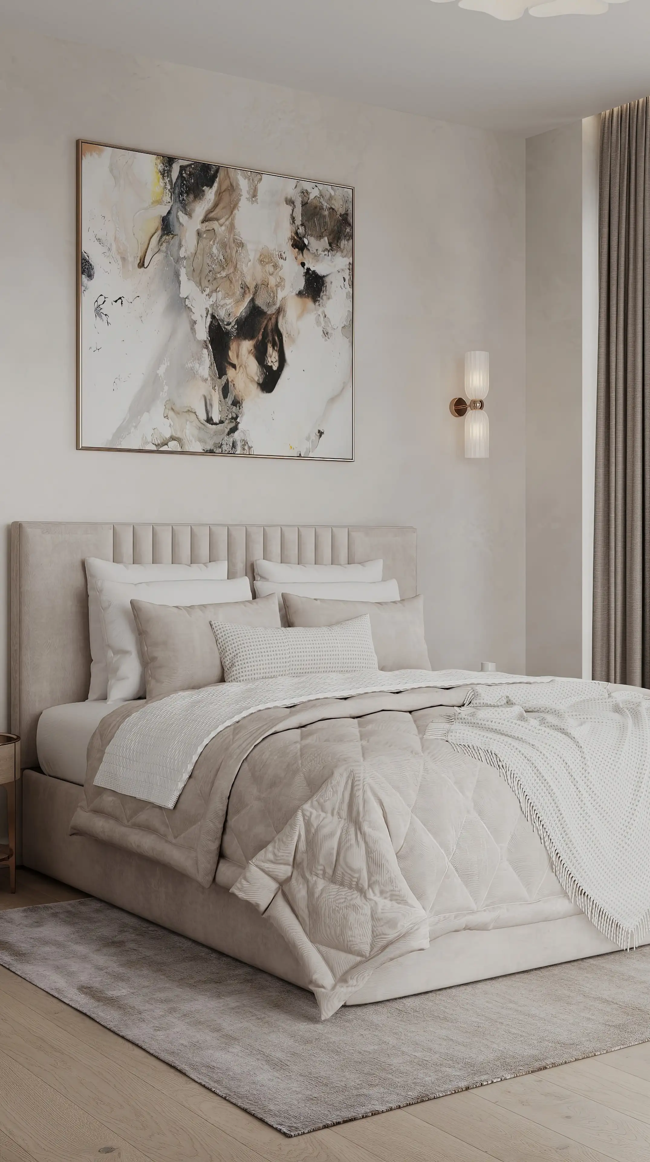 Интерьер выполнен в минималистичном, но при этом экологичном стиле. Мы использовали чистые оттенки белого, бежевого и топлёного молока, чтобы наполнить пространство светом и воздухом. Мебель отличается простыми геометрическими формами, её лаконичные очертания и отсутствие лишних деталей создают ощущение визуальной лёгкости. Все помещения объединены общей цветовой гаммой и материалами, что подчёркивает целостность интерьера. Акценты расставлены с помощью тактильных текстур — дерева, матовых поверхностей и мягкого текстиля, добавляющих уют и спокойствие.