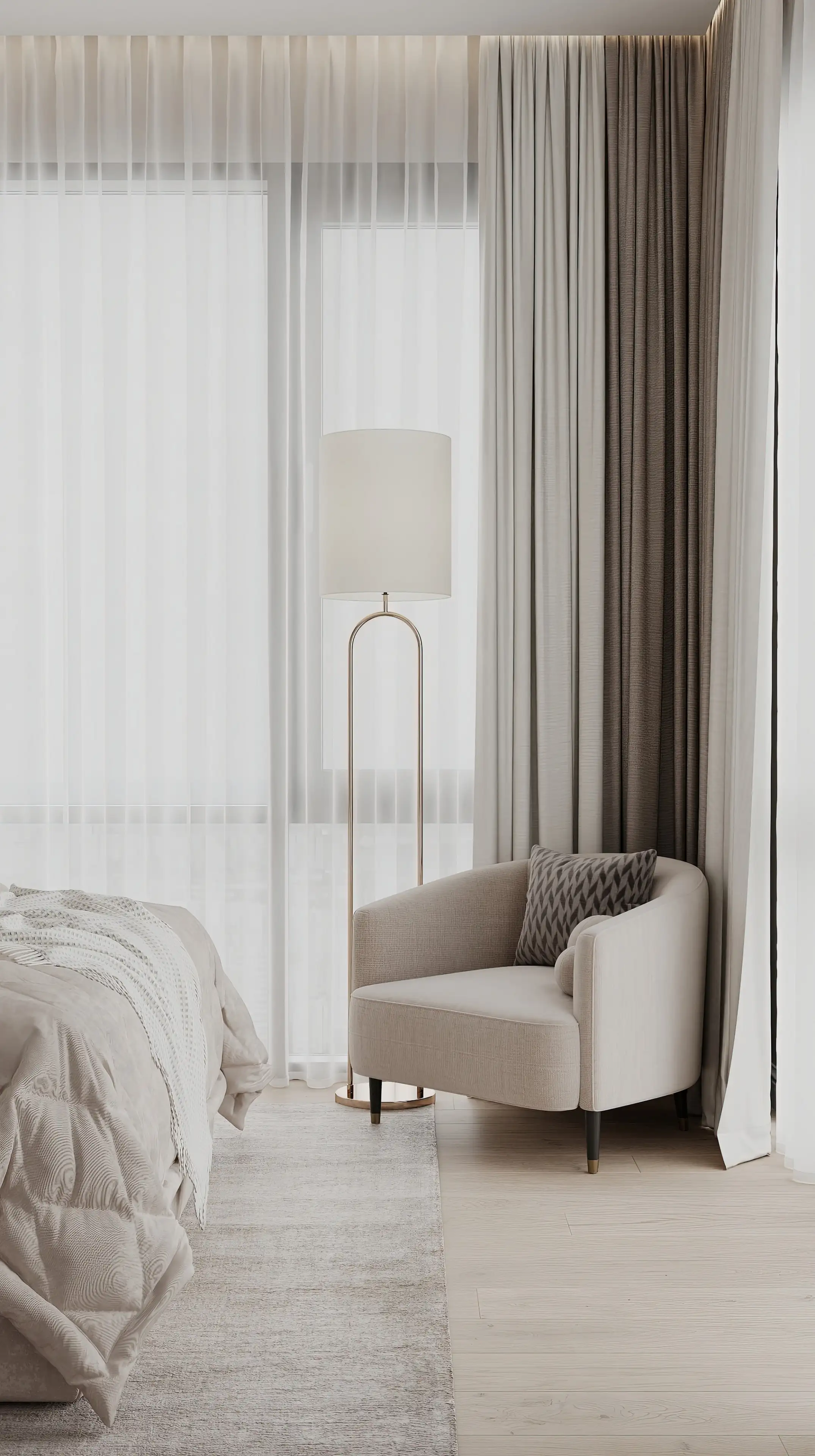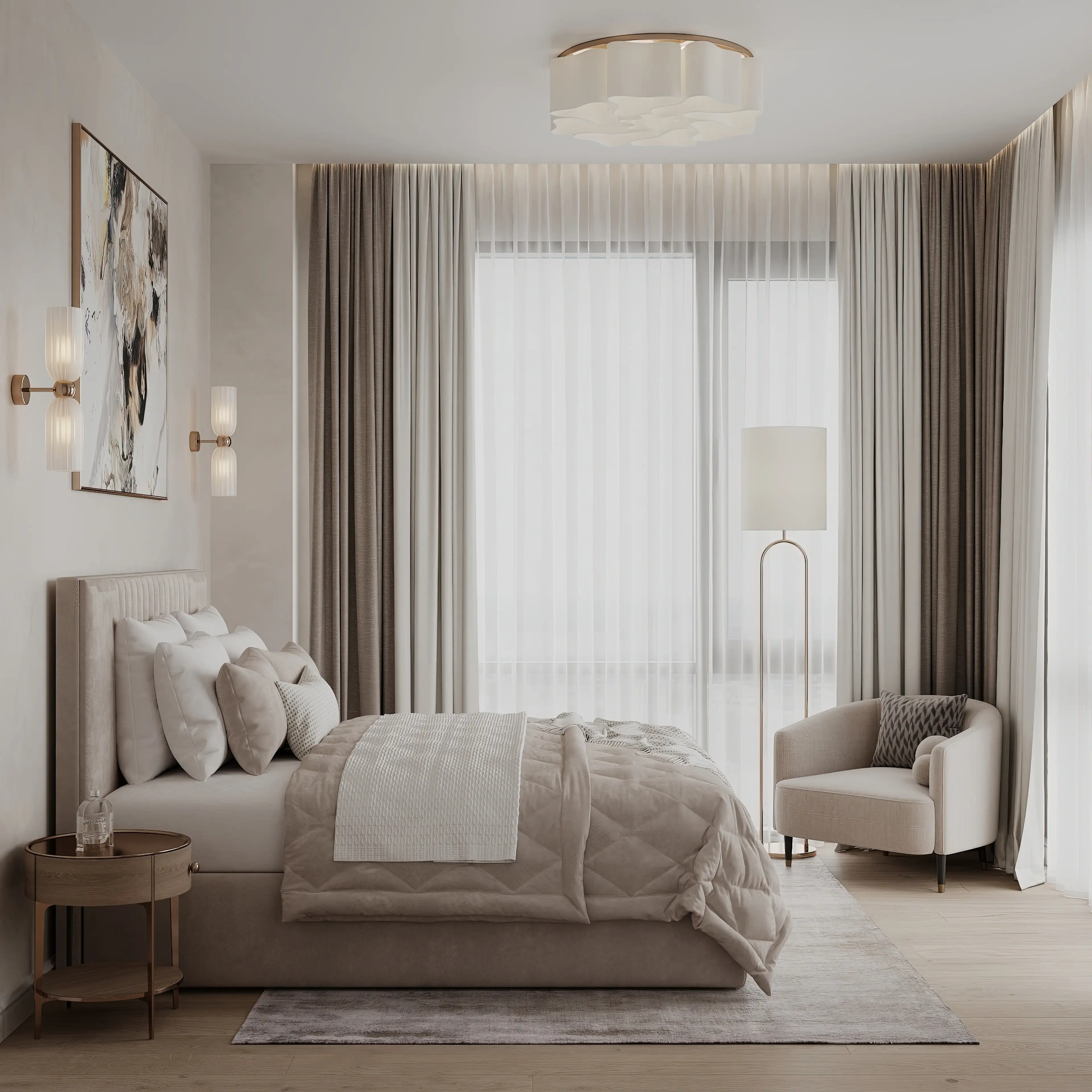 Спальня оформлена в более светлых тонах, чем остальные помещения. Два вертикальных светильника в изголовье, торшер возле кресла и большая круглая люстра позволяют реализовать разные сценарии освещения. Бархатистая обивка мебели — приятный тактильный акцент, который сразу делает комнату уютнее.
