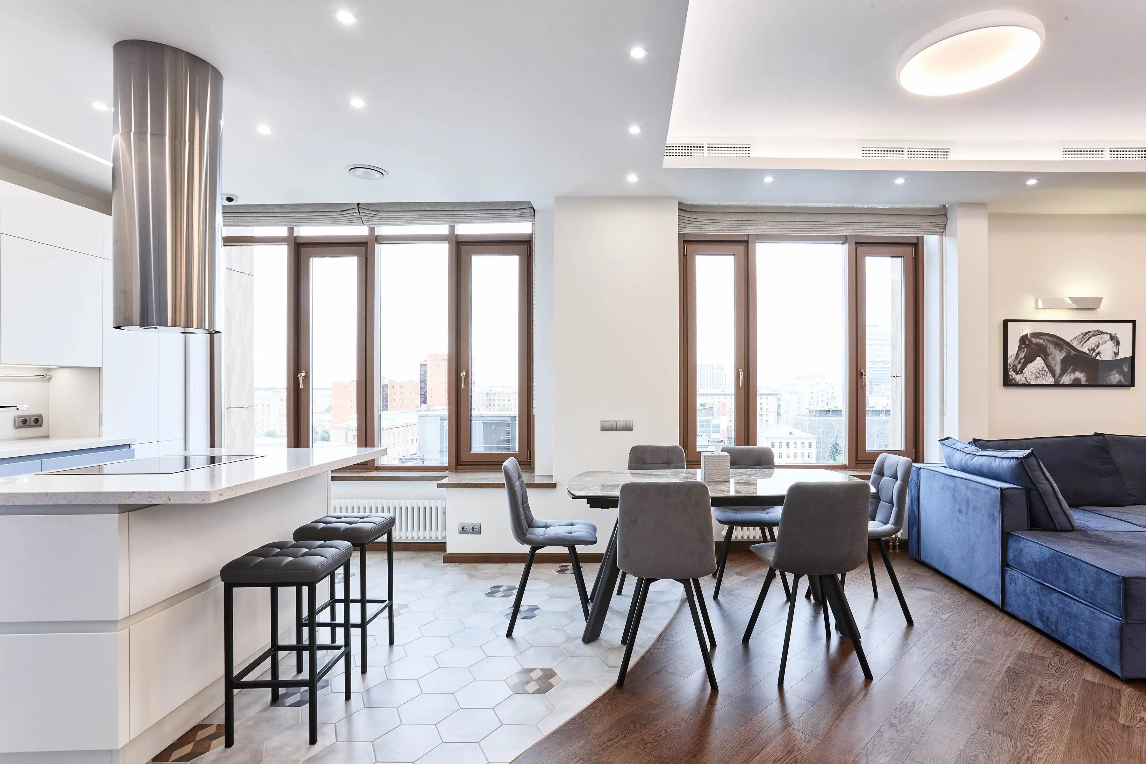Столовая, таким образом, получается уже на стыке двух покрытий – плитки и инженерной доски, продолжающихся в зоне гостиной. Подробнее о достоинствах инженерной доски вы можете узнать из нашего ролика про квартиру от застройщика «ПИК». Ссылку на него мы оставим в подсказках и в описании к видео.