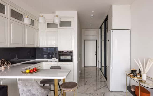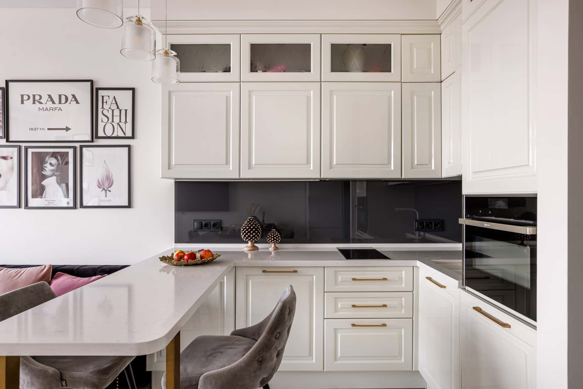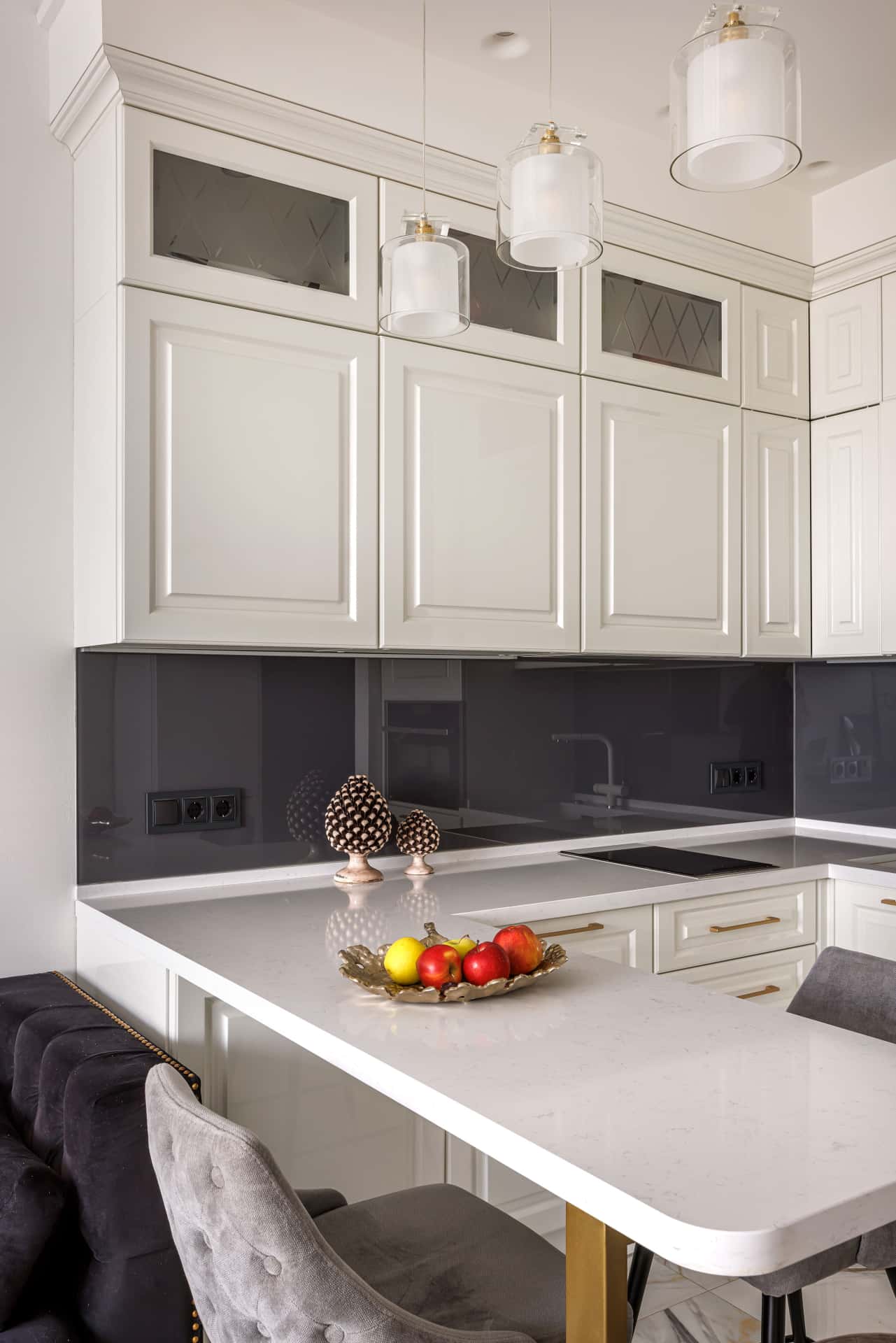 Классические глянцевые фасады шкафчиков и ящиков подобрали в белом цвете, дополнительно украсив их латунными ручками. Самые верхние шкафчики застеклили и оборудовали подсветкой. Фартук в зоне готовки для контраста оформили глянцевым графитовым стеклом со светодиодной лентой.