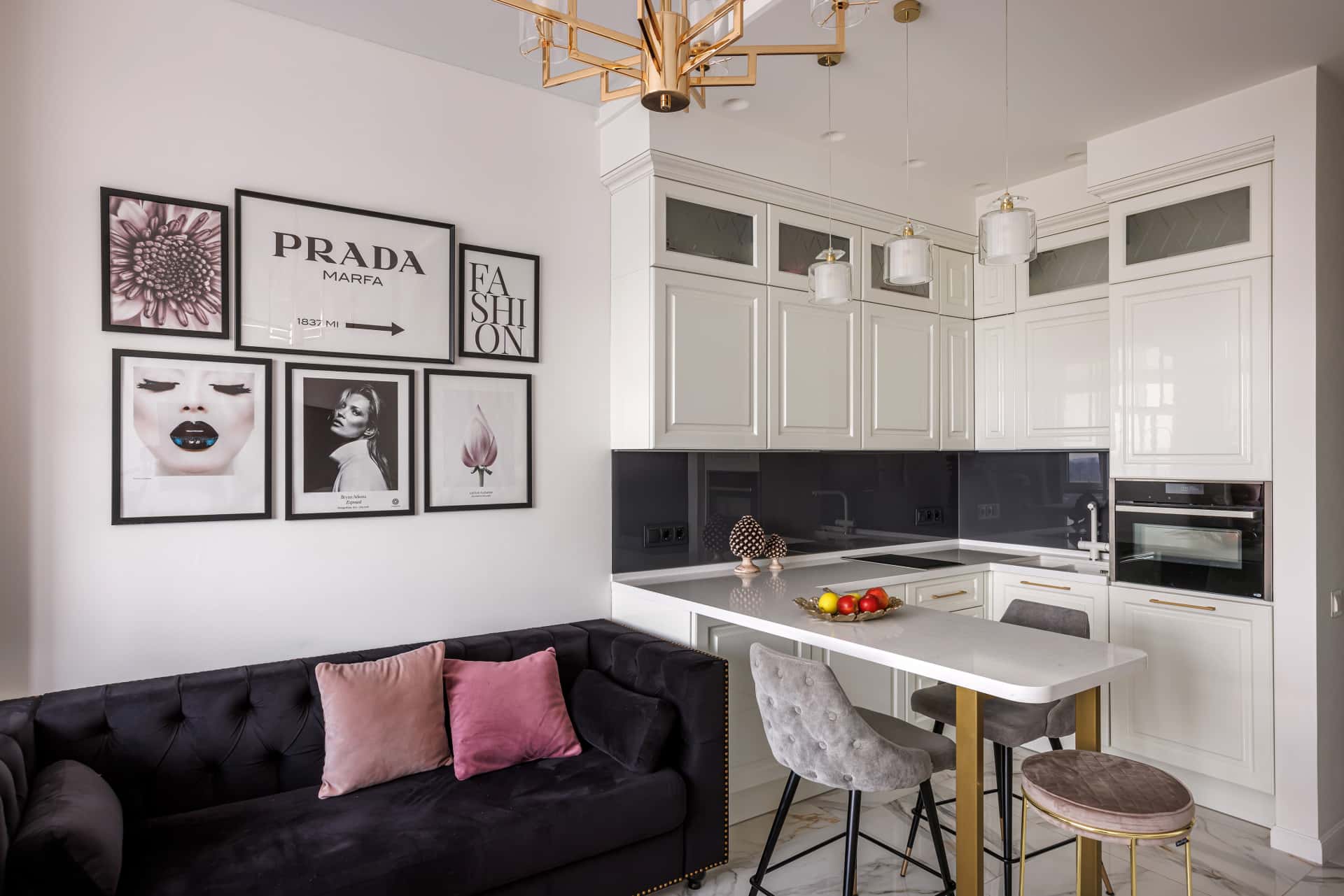 Большую люстру в гостиной мы также выбрали из латуни. Кроме неё, на потолке справа и слева от дивана мы установили профиль скрытого освещения - гибкий карниз Orac Decor. Этот приём позволил нам придать интерьеру больше камерности и индивидуальности. Также особенное звучание этому уголку придали постерами в чёрных рамах, которые очень похожи по содержанию и оформлению на снимки из мира высокой моды.