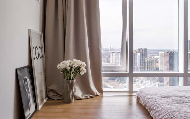 Заказчице нужно было более функциональное жилое пространство. Поэтому все изначальные перегородки, отделявшие в квартире ванную от прихожей, прихожую от кухни, а кухню от спальни-гостиной, убрали. Новыми перегородками изолировали от остального пространства только ванную. Спальное место подняли на уровень панорамных окон с помощью подиума, чтобы прямо с кровати открывался живописный вид.