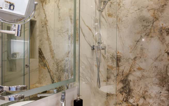 В ванной пол и основные стены выложили таким же керамогранитом, что и в прихожей. А вот в зоне душевой мы использовали на полу более однотонный, молочный керамогранит, а на одной из стен – с насыщенным коричнево-золотым рисунком, имитирующим натуральный камень.