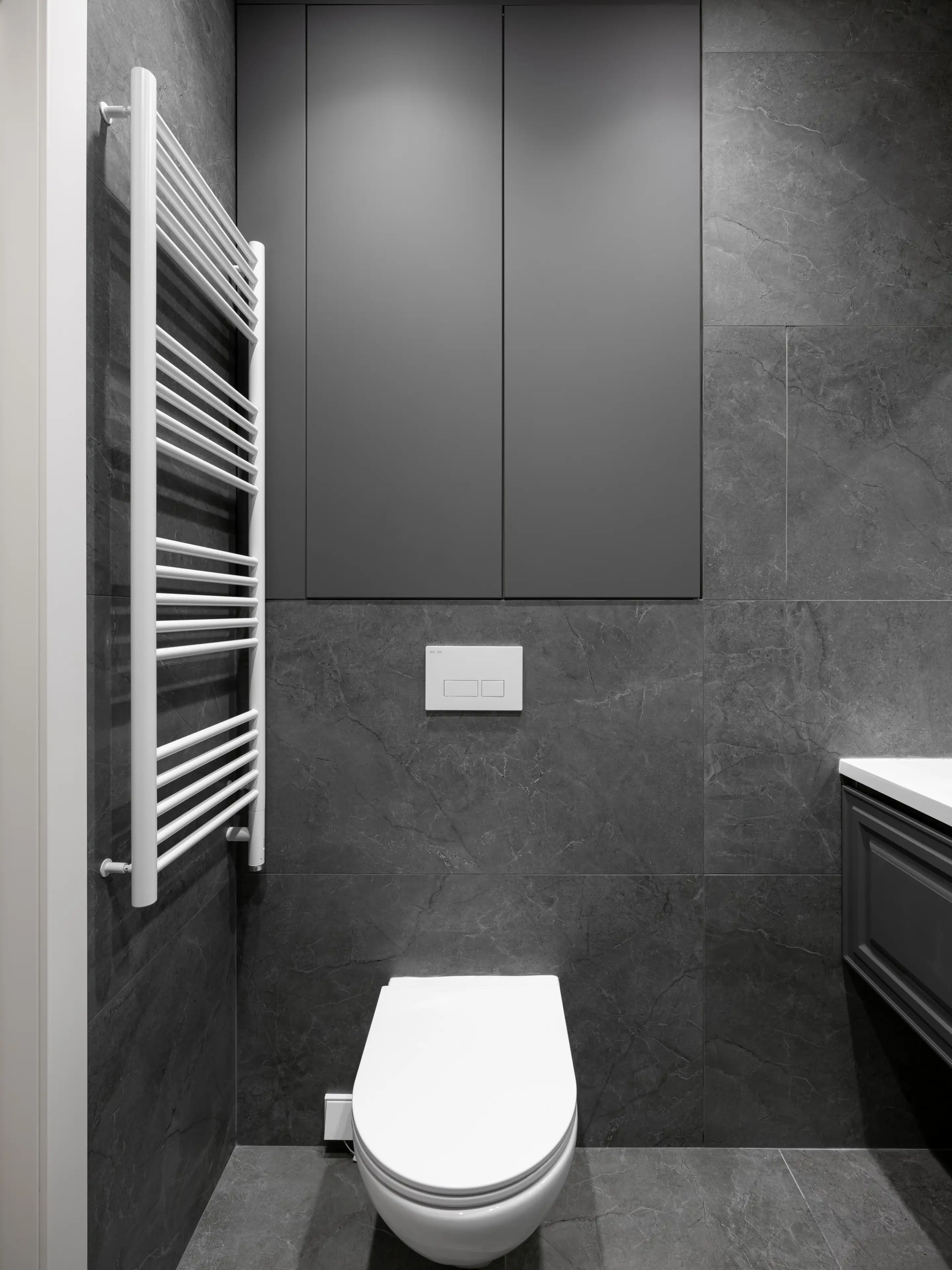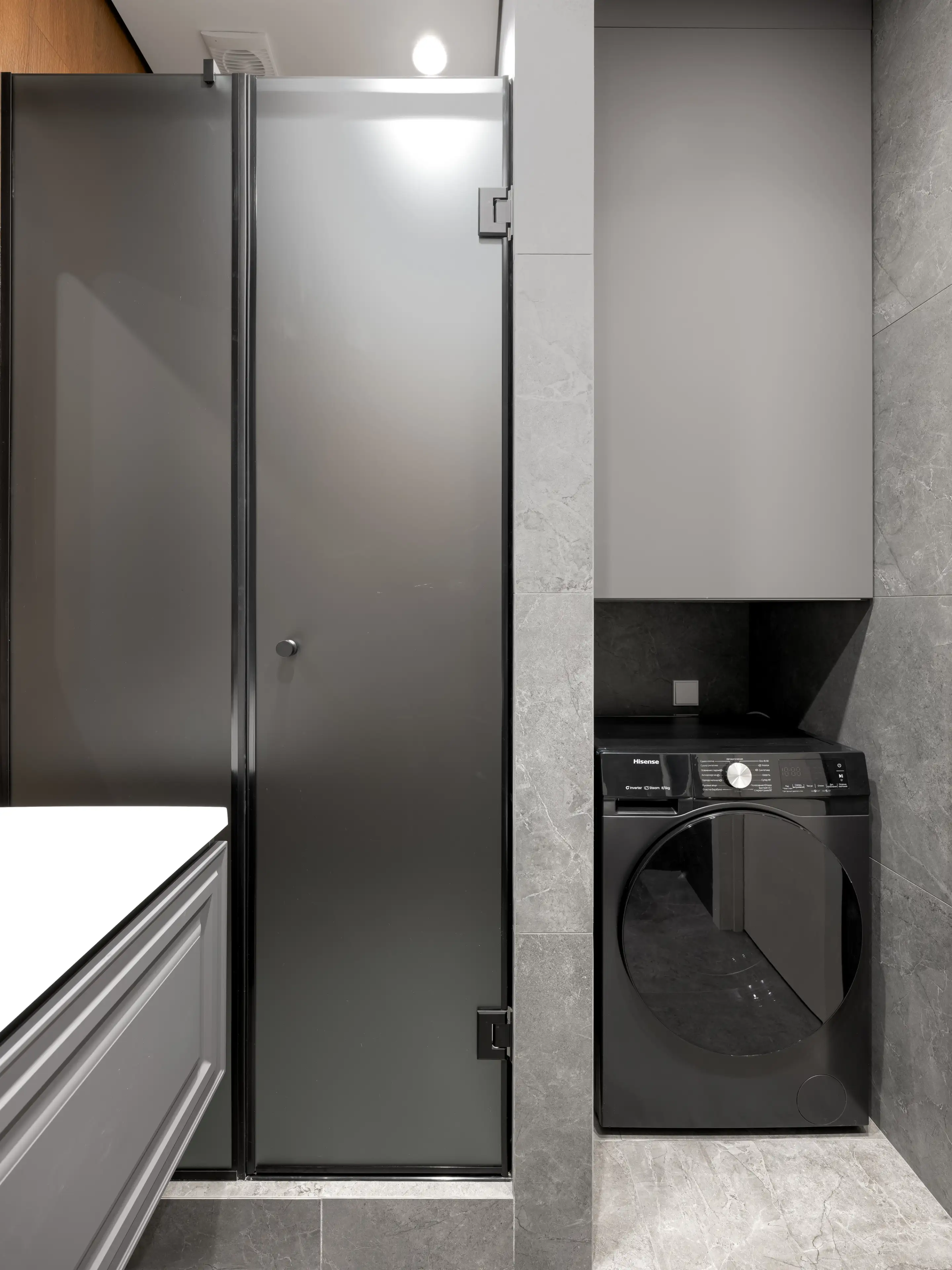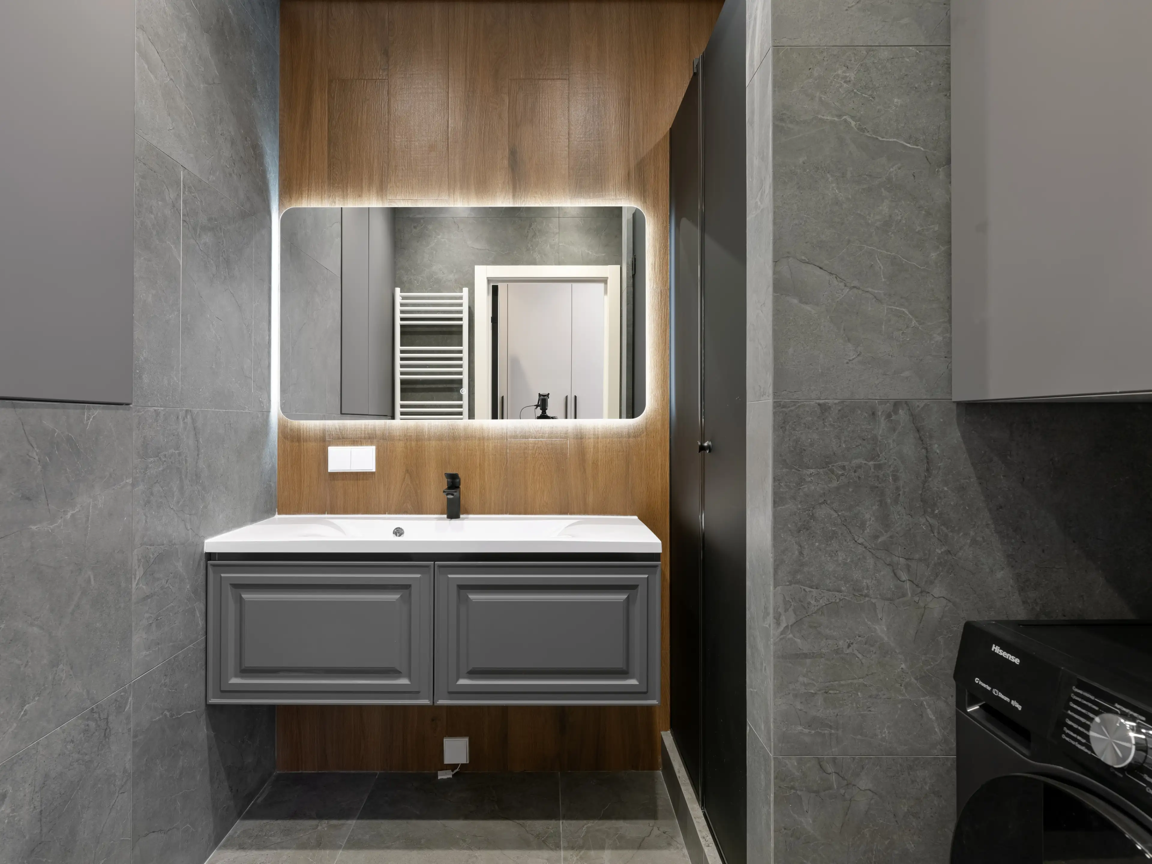 Фоновой плиткой служит керамогранит серого цвета с фактурой микроцемента. А корпусная мебель выполнена в серых и чёрных тонах.